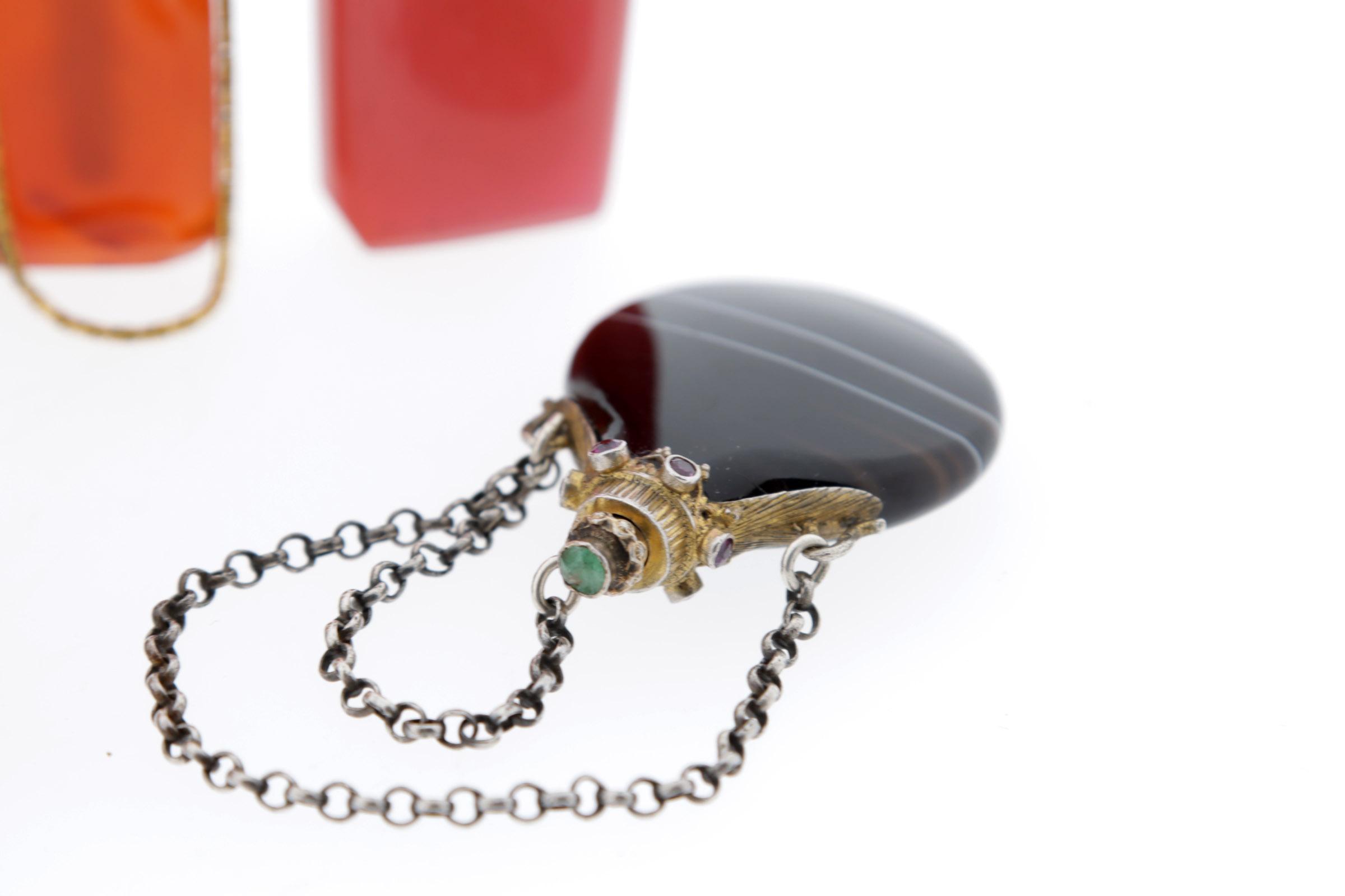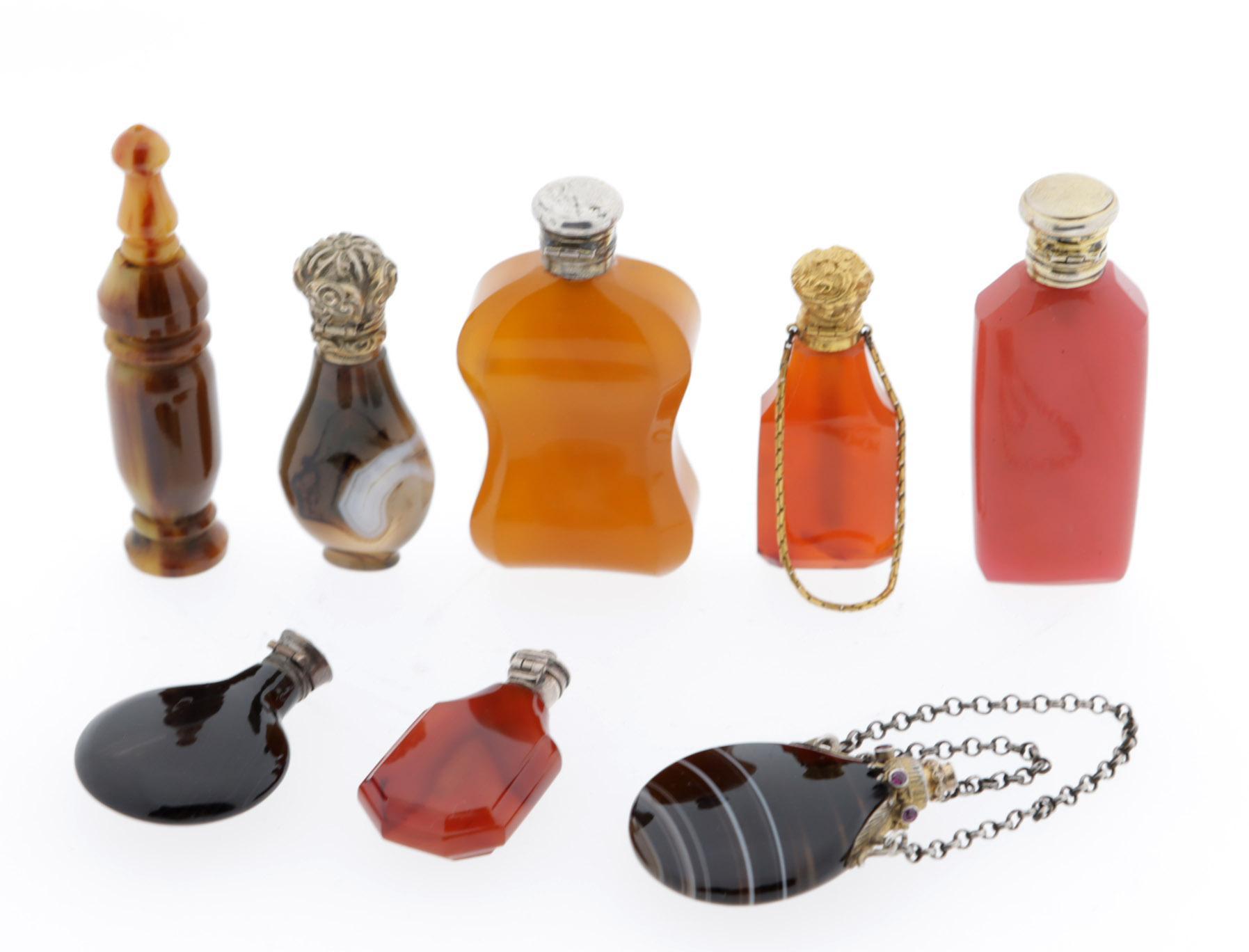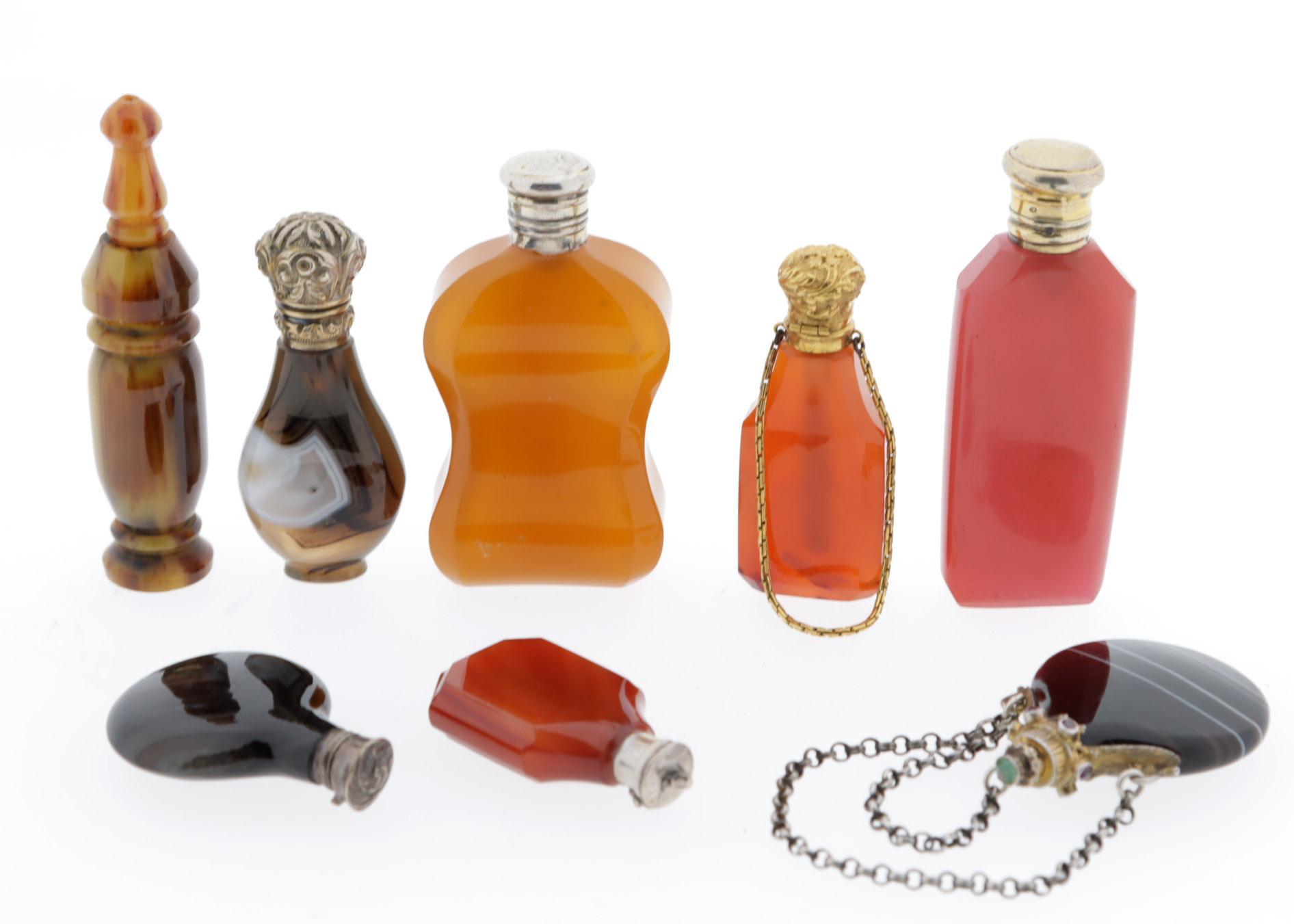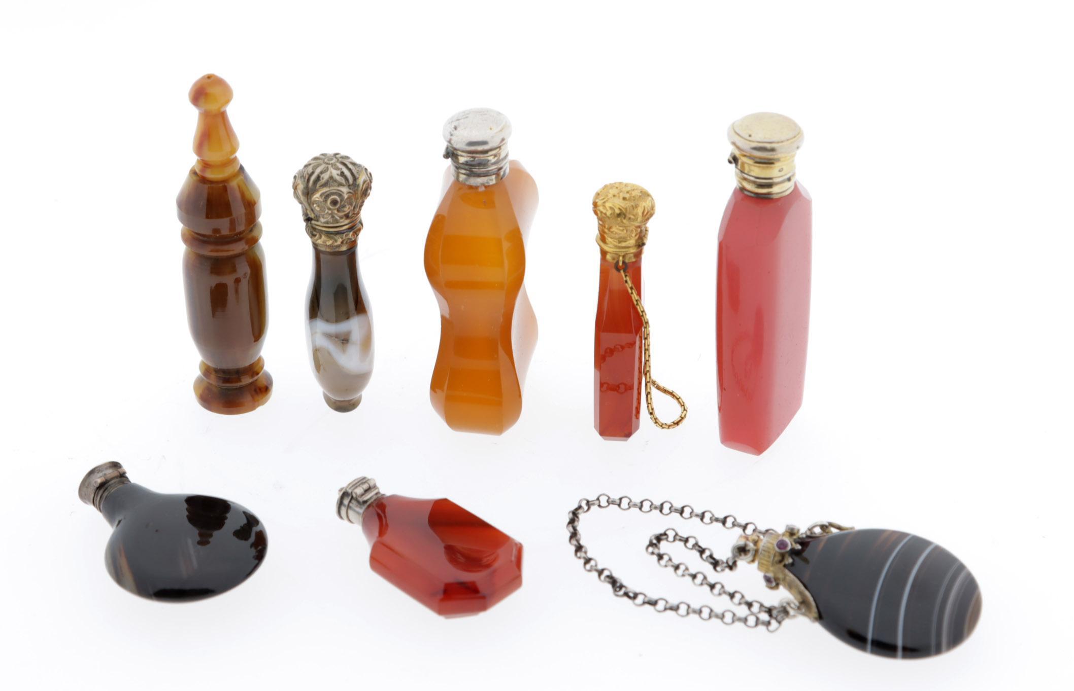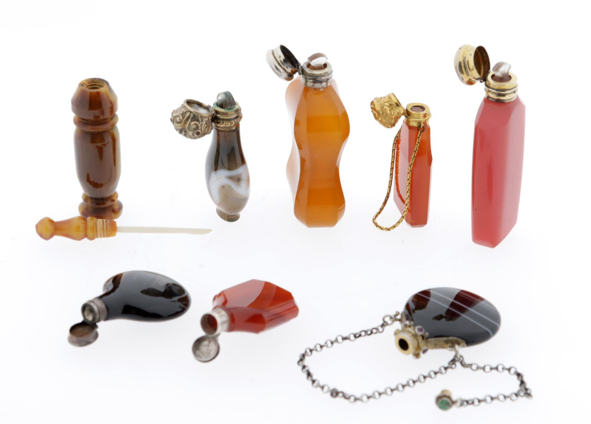 Koop van 8 van diverse steensoorten vervaardigde odeurflacons w.o. agaat, 19e/20ste eeuw, deels met gouden doppen