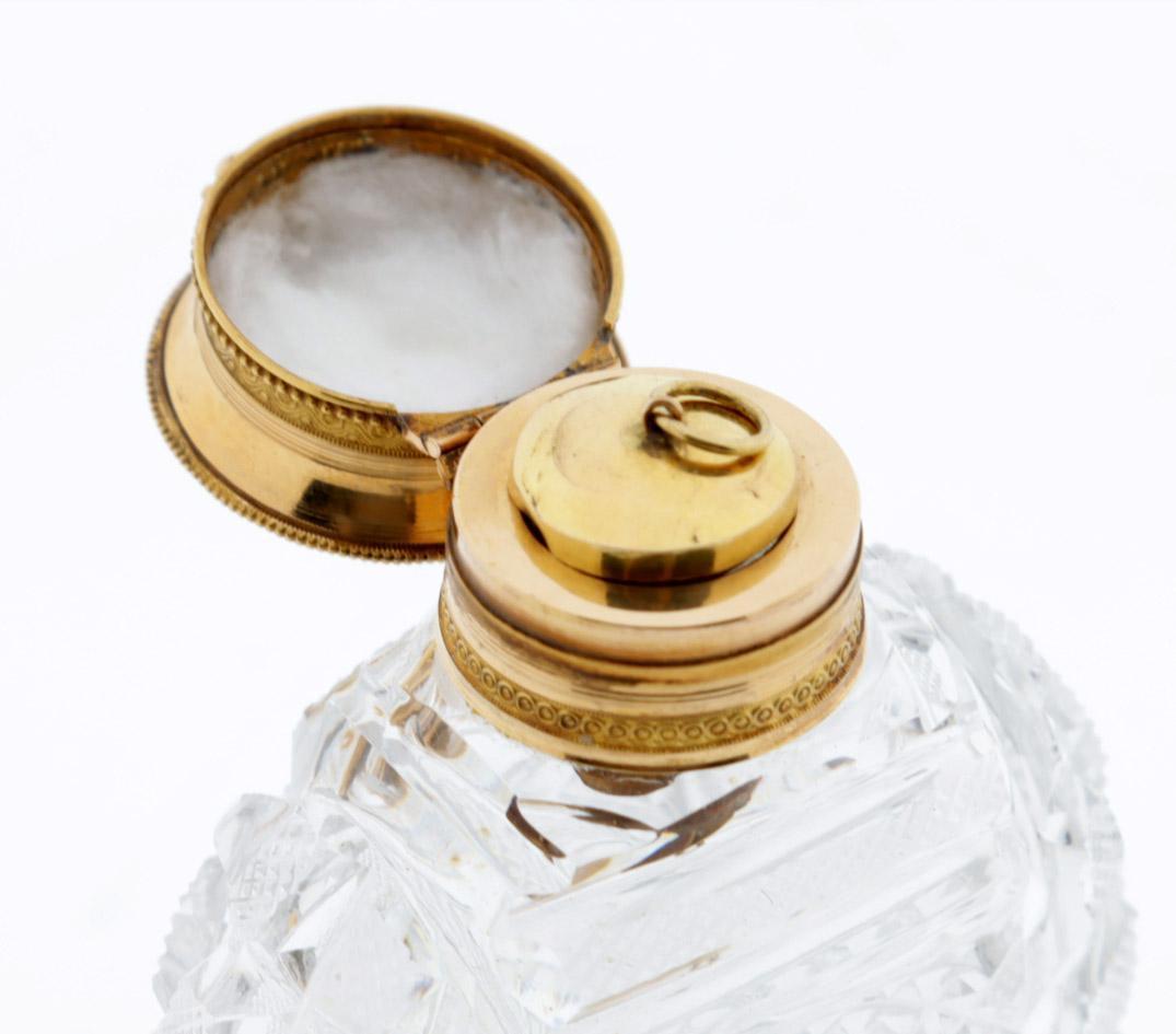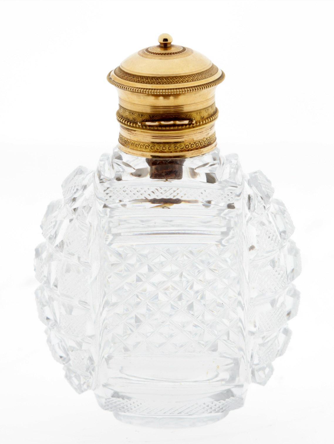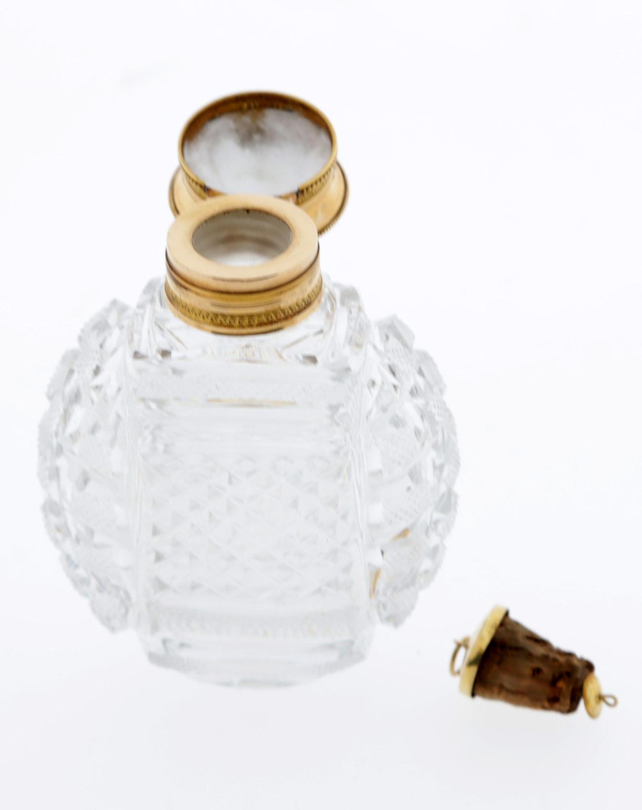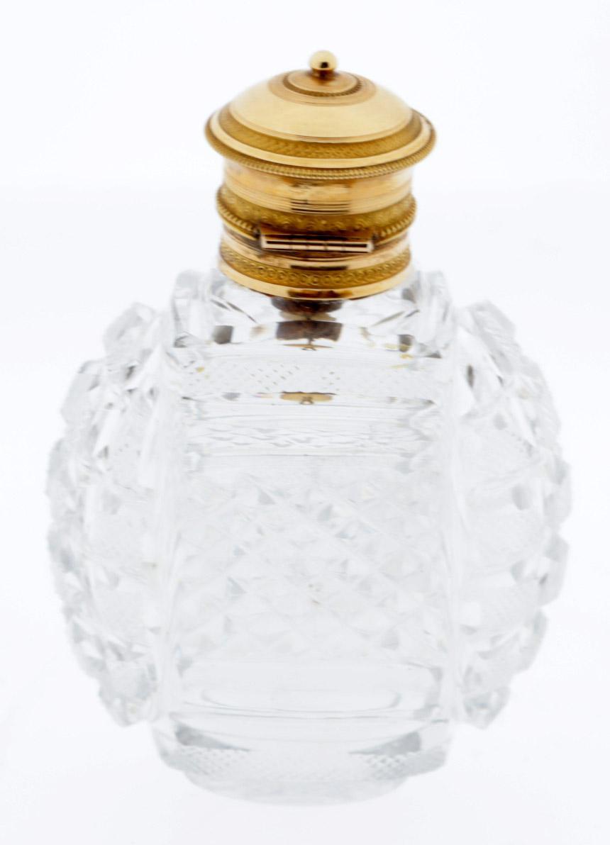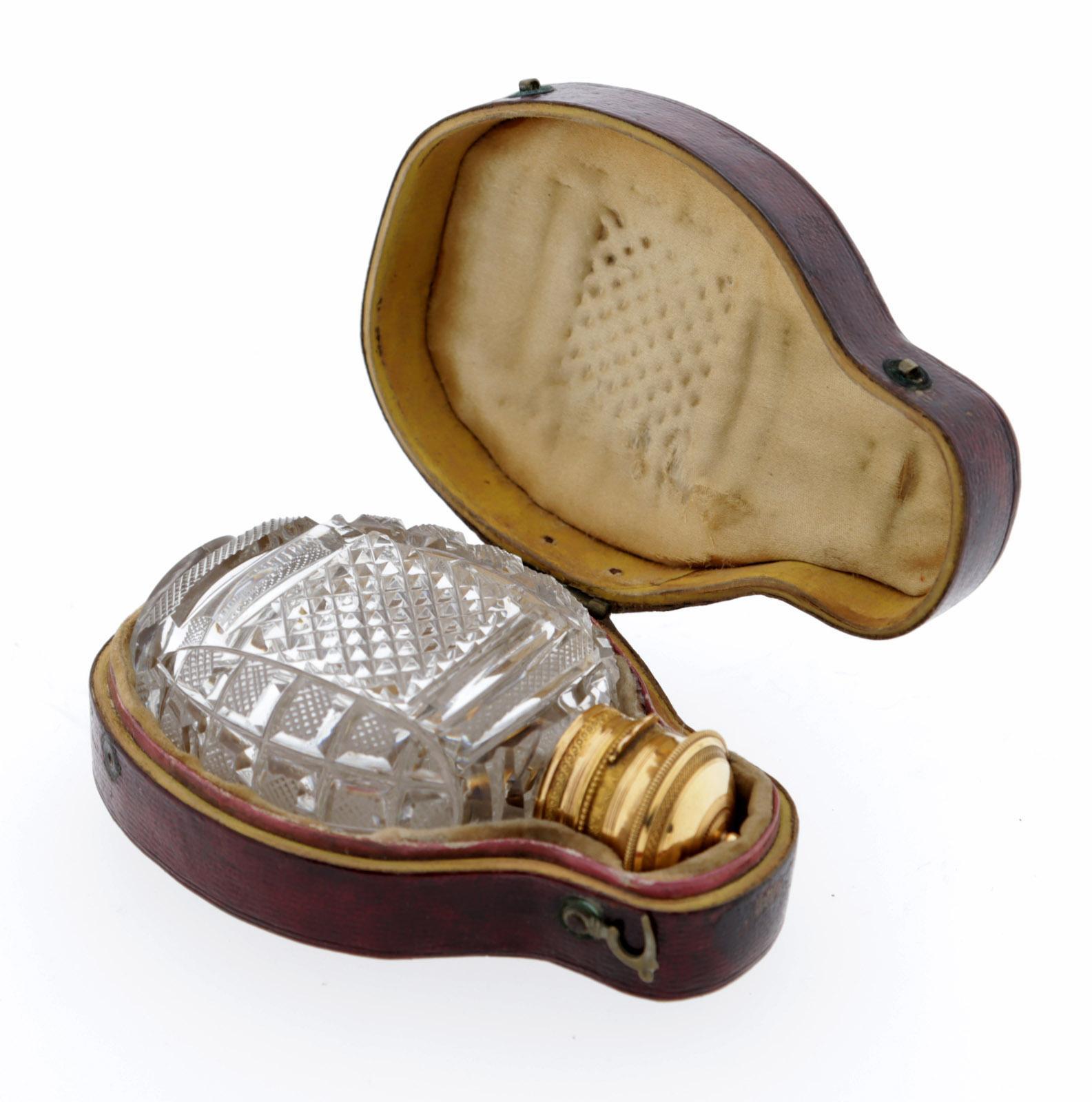 Antieke rijkbewerkte kristallen Empire odeurflacon met 18 kt. stop en dop, h.9 cm. met originele foudraal