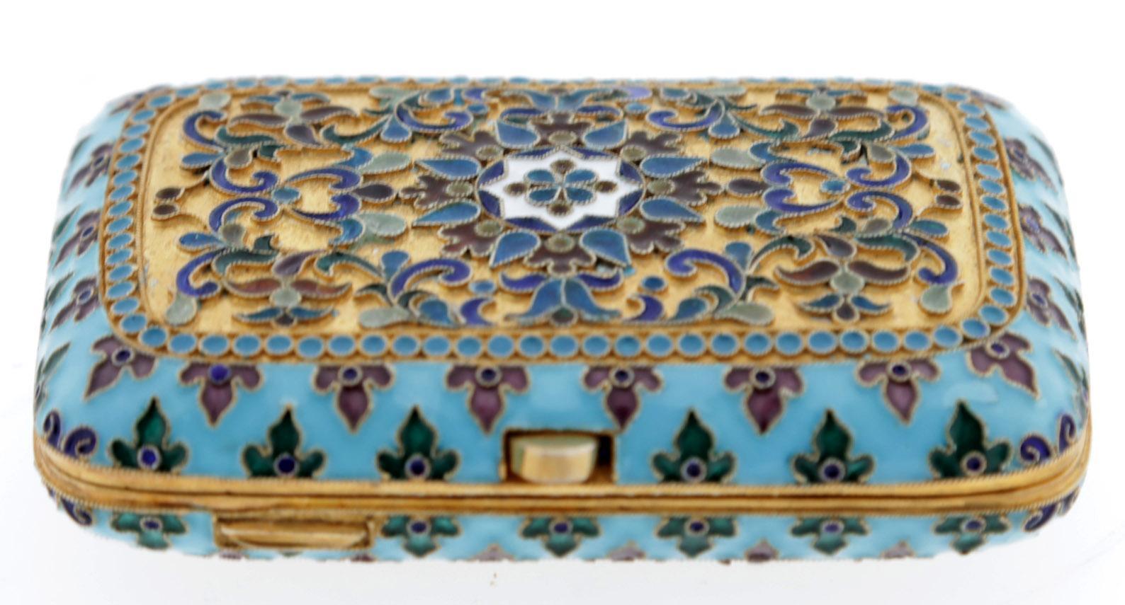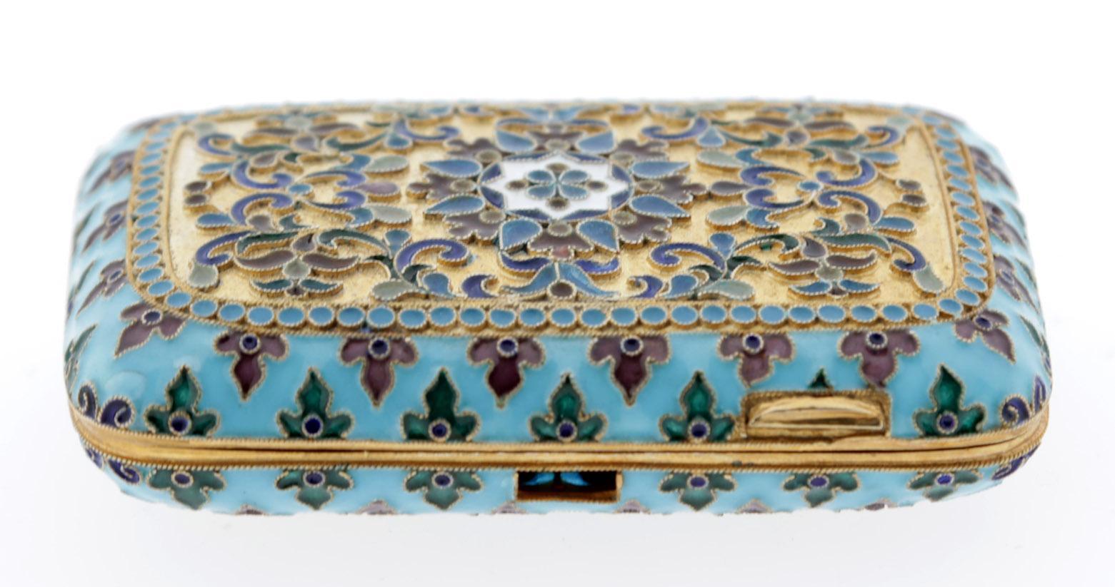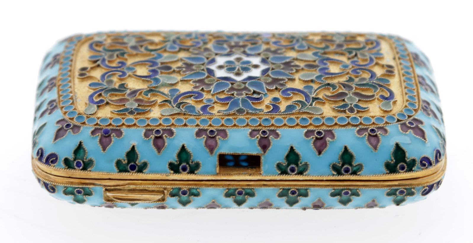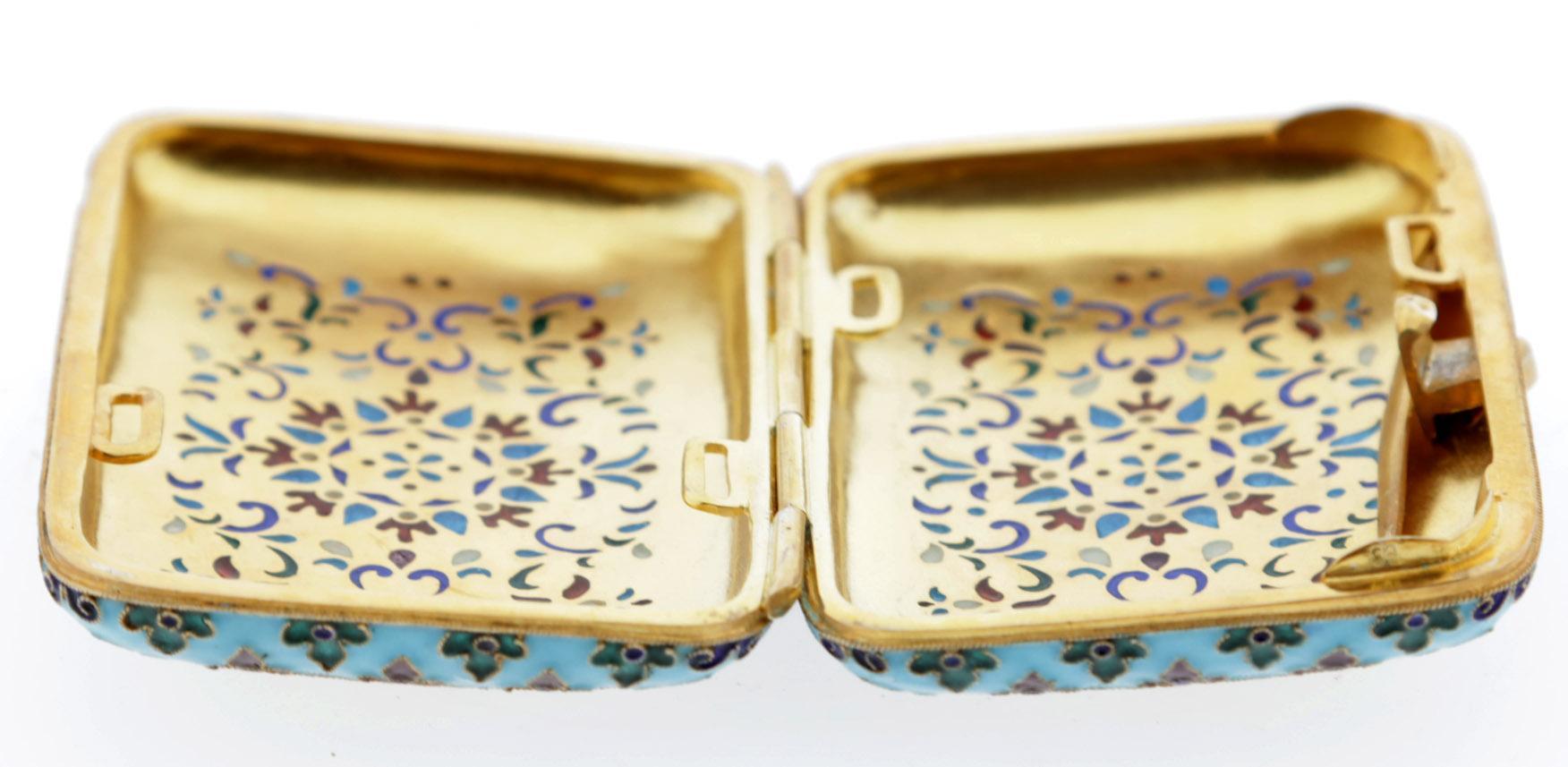 Russische verguld zilveren cloisonné sigarettendoos, begin 20e eeuw, 8,2 x 5,7 x 2 cm.