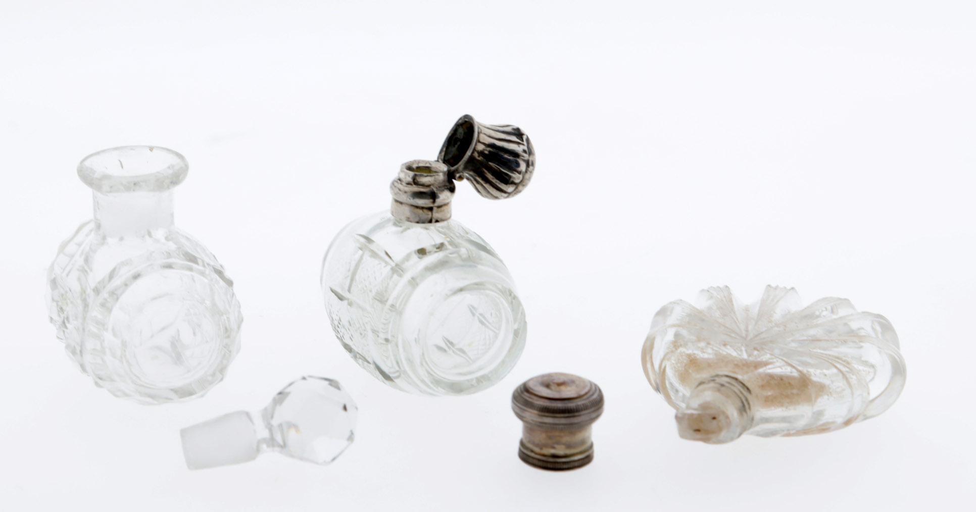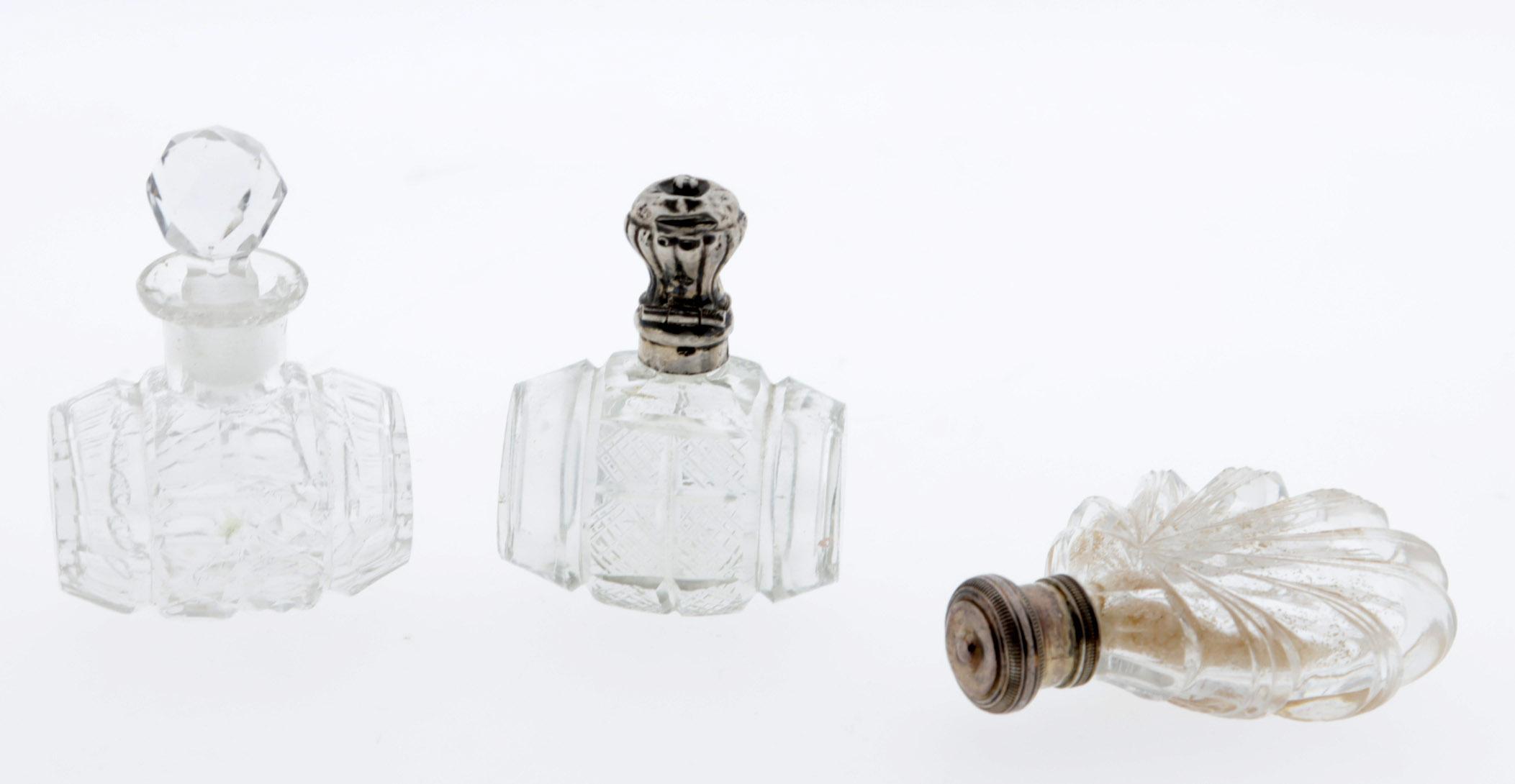 Koop van 2 kristallen tonvormige odeurflacons en platte kristallen deurflacon w.o. met zilveren dop, h.6,5, h.6 cm.