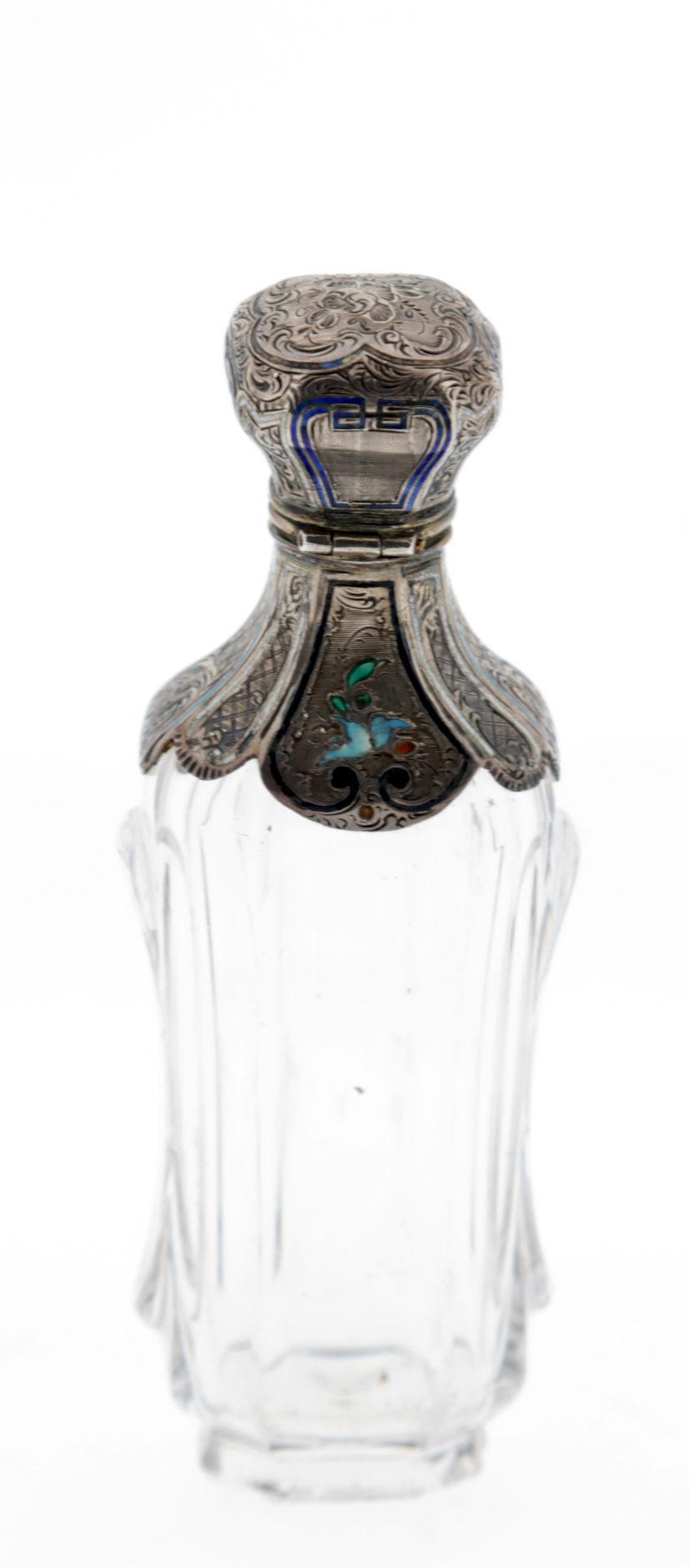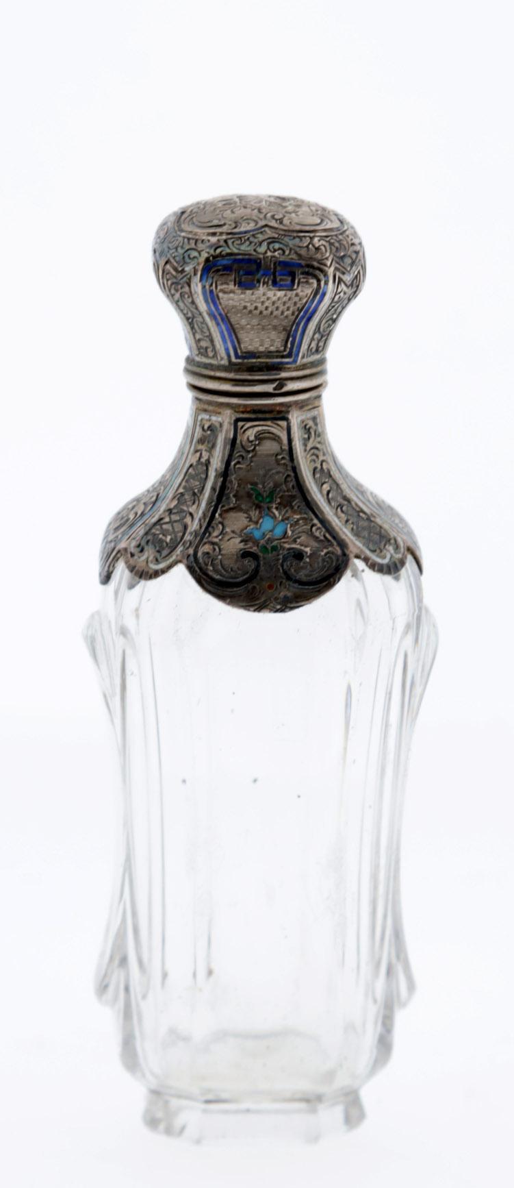 Antieke kristallen odeurflacon met geëmailleerde zilveren omranding en dop, h.9,5 cm., Frankrijk ca.1850