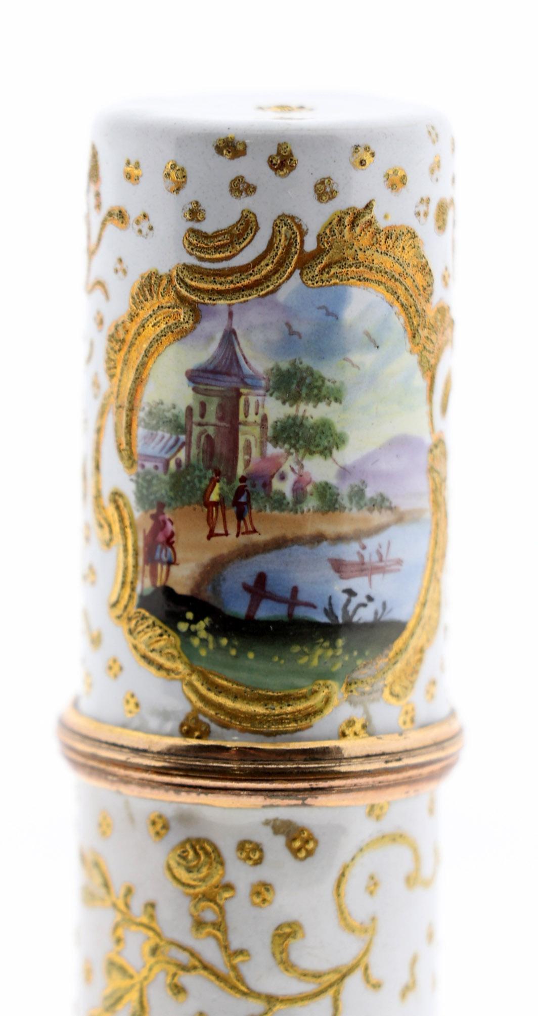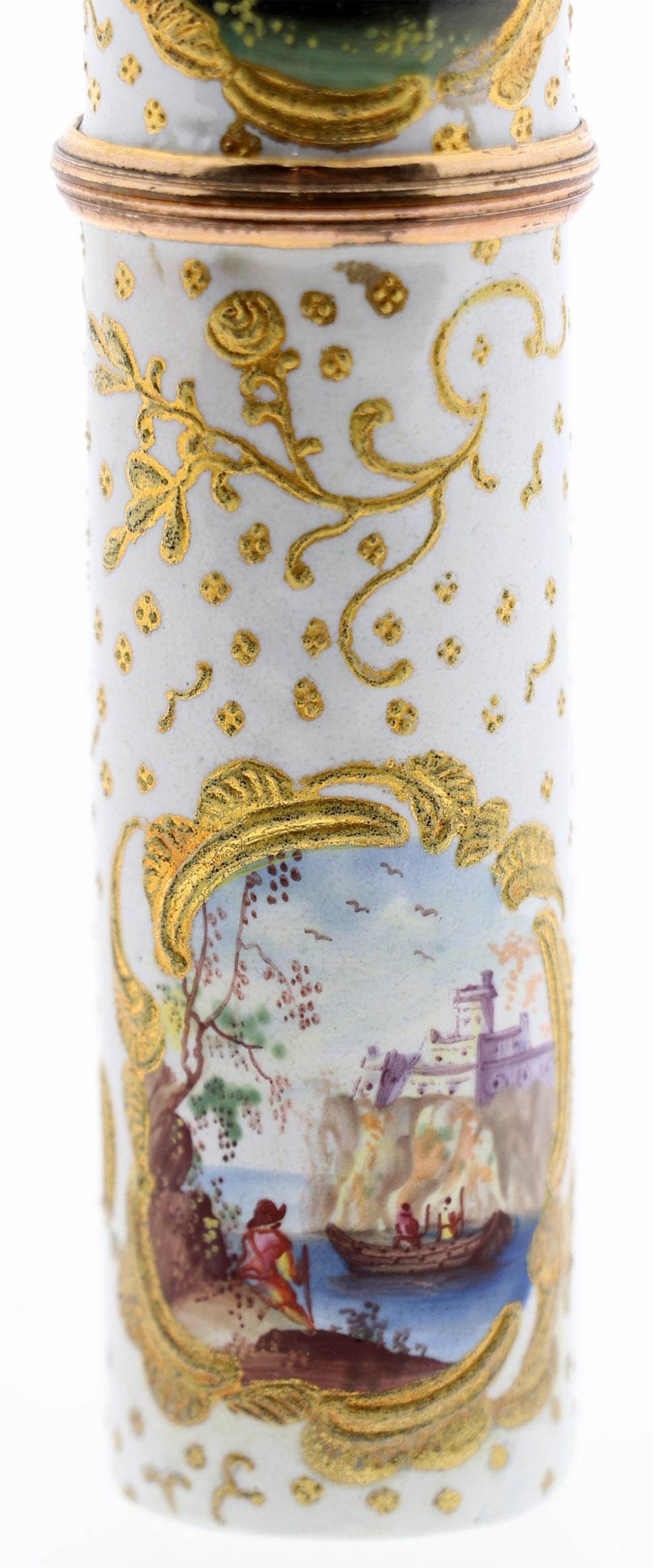 Antieke emaille odeurflacon met romantische landschappen beschilderd en met goud opgehoogd, gouden randen en ornamenten, kristallen binnenfles met zilveren dop, Engeland ca.1765, h.11,5 cm.