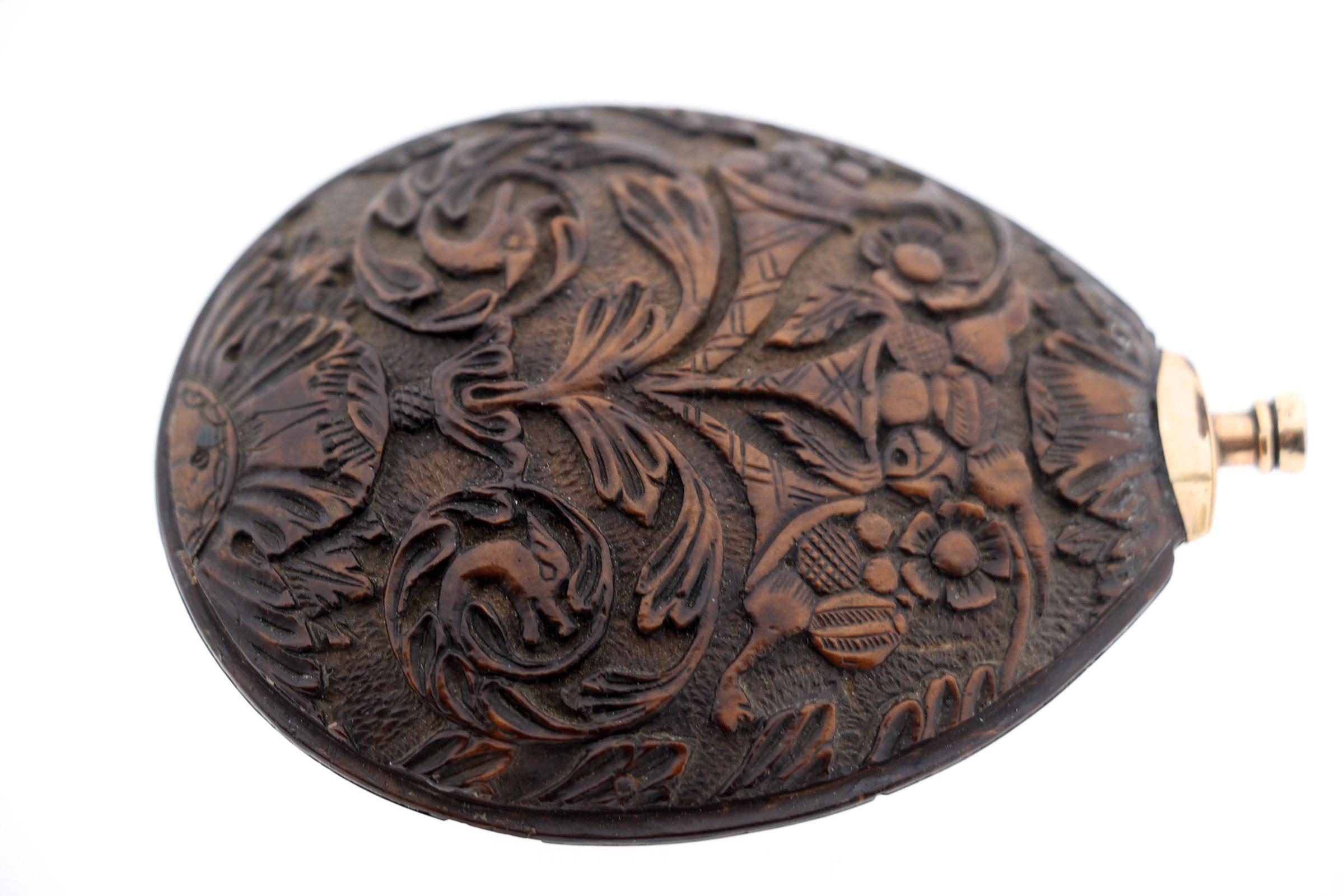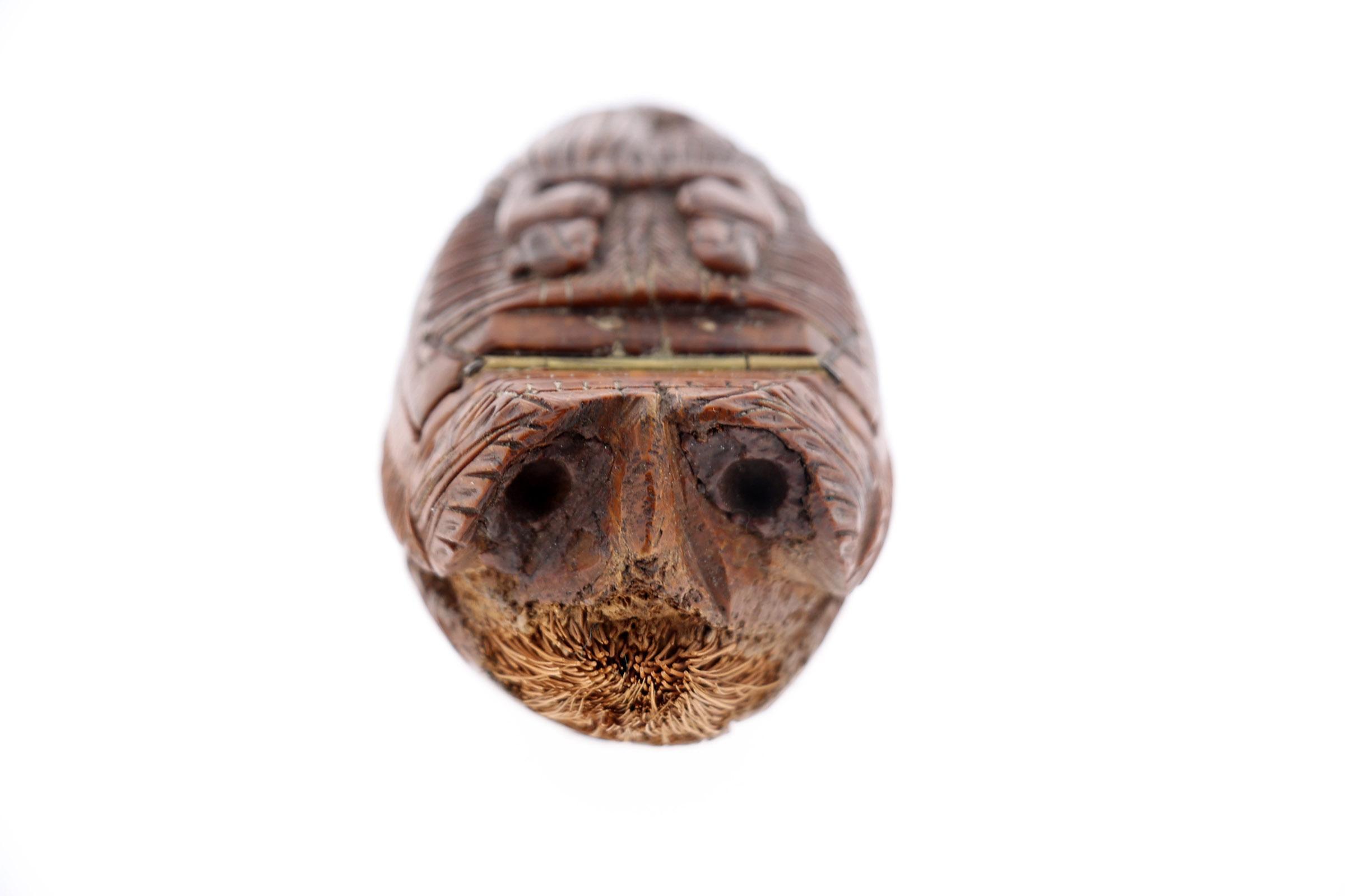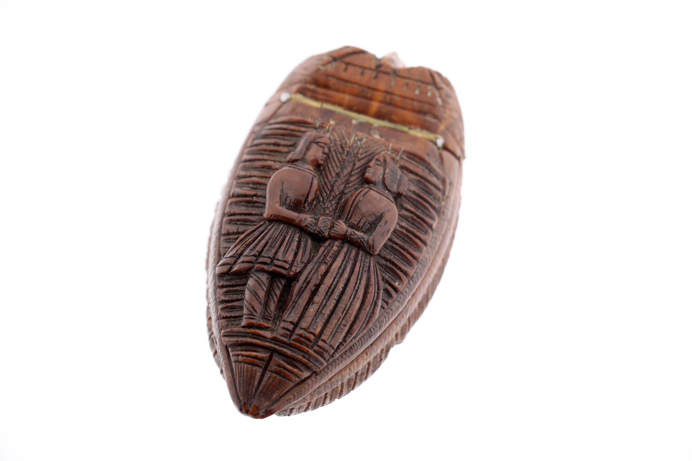 Coquille snuifdoos bewerkt met man en vrouw en gezicht, midden 18e eeuw en gesneden noten odeurflacon met gouden montuur, 18e eeuw