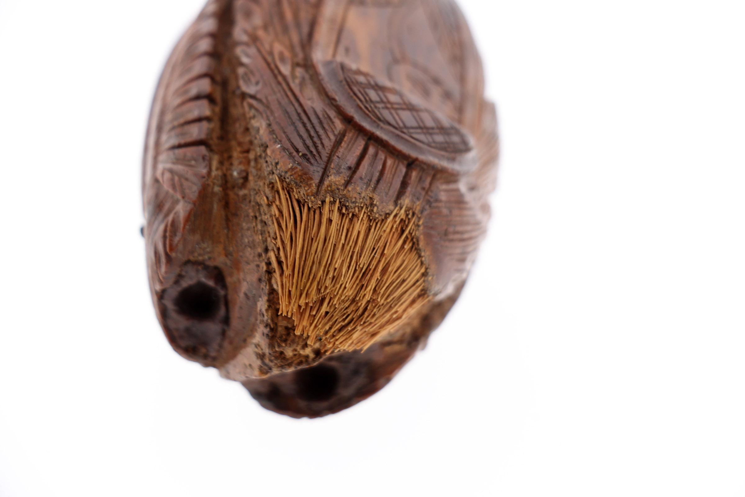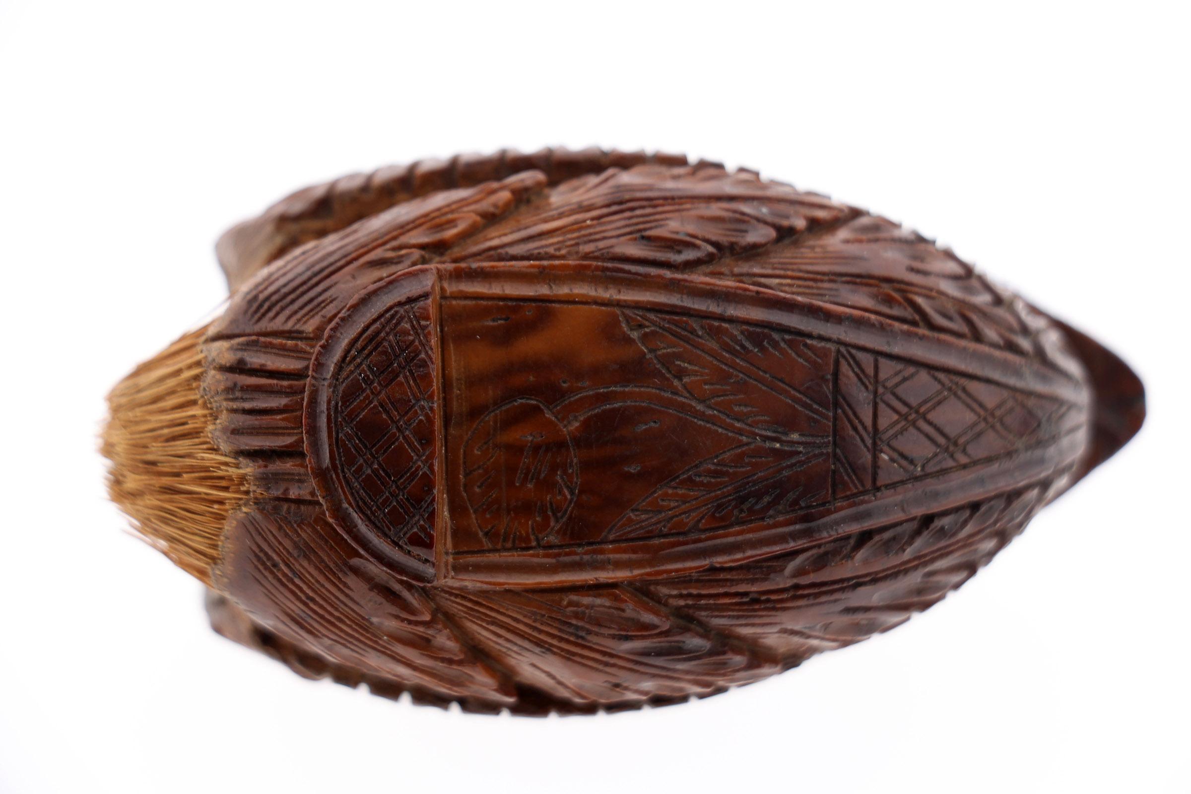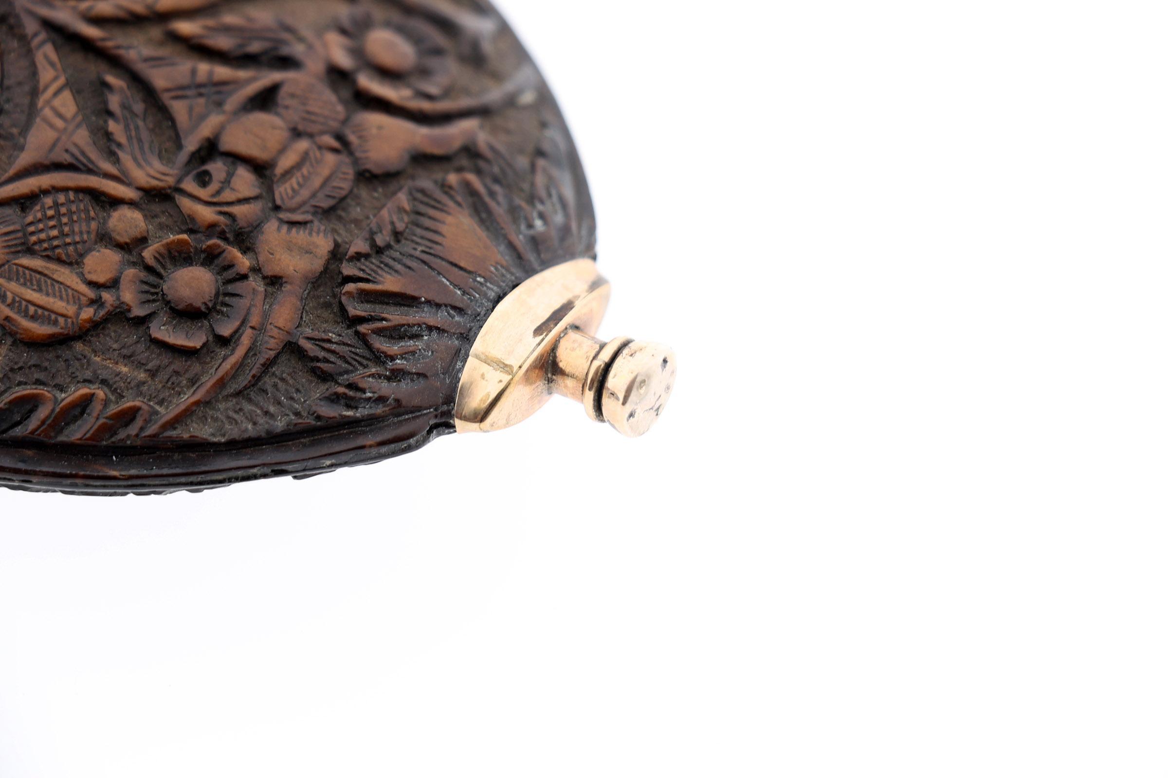 Coquille snuifdoos bewerkt met man en vrouw en gezicht, midden 18e eeuw en gesneden noten odeurflacon met gouden montuur, 18e eeuw
