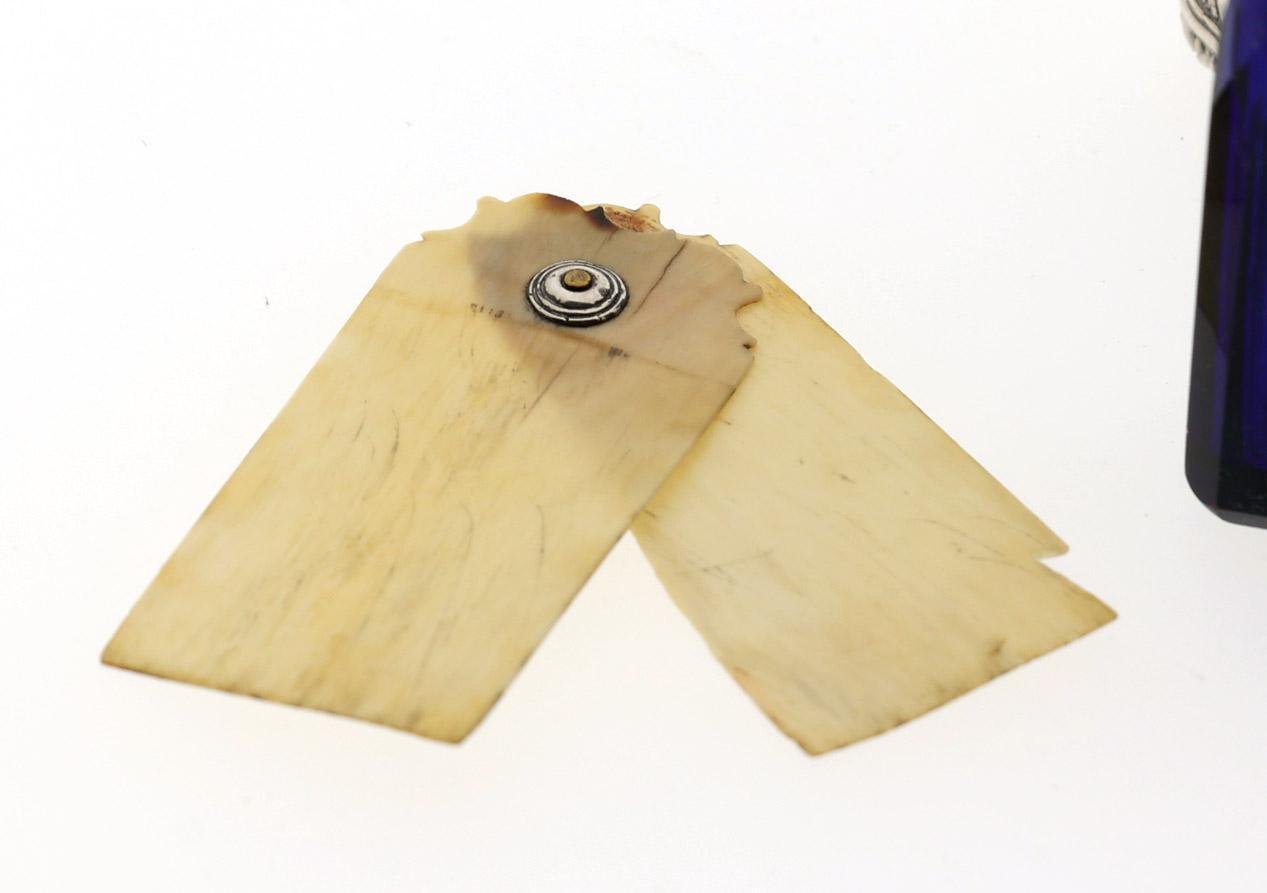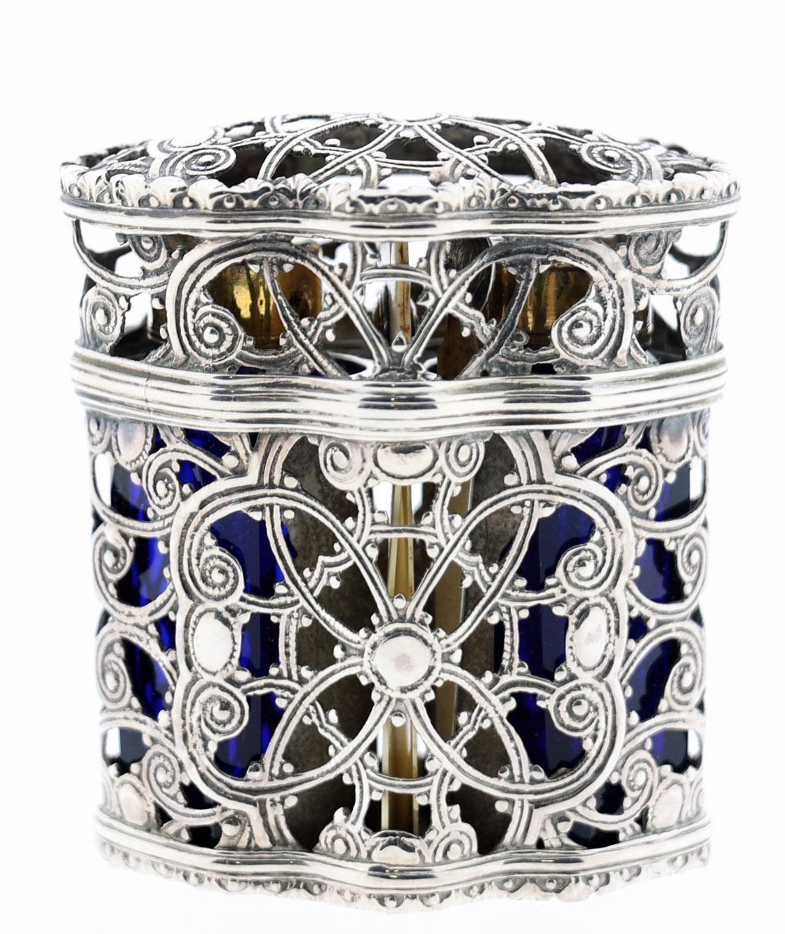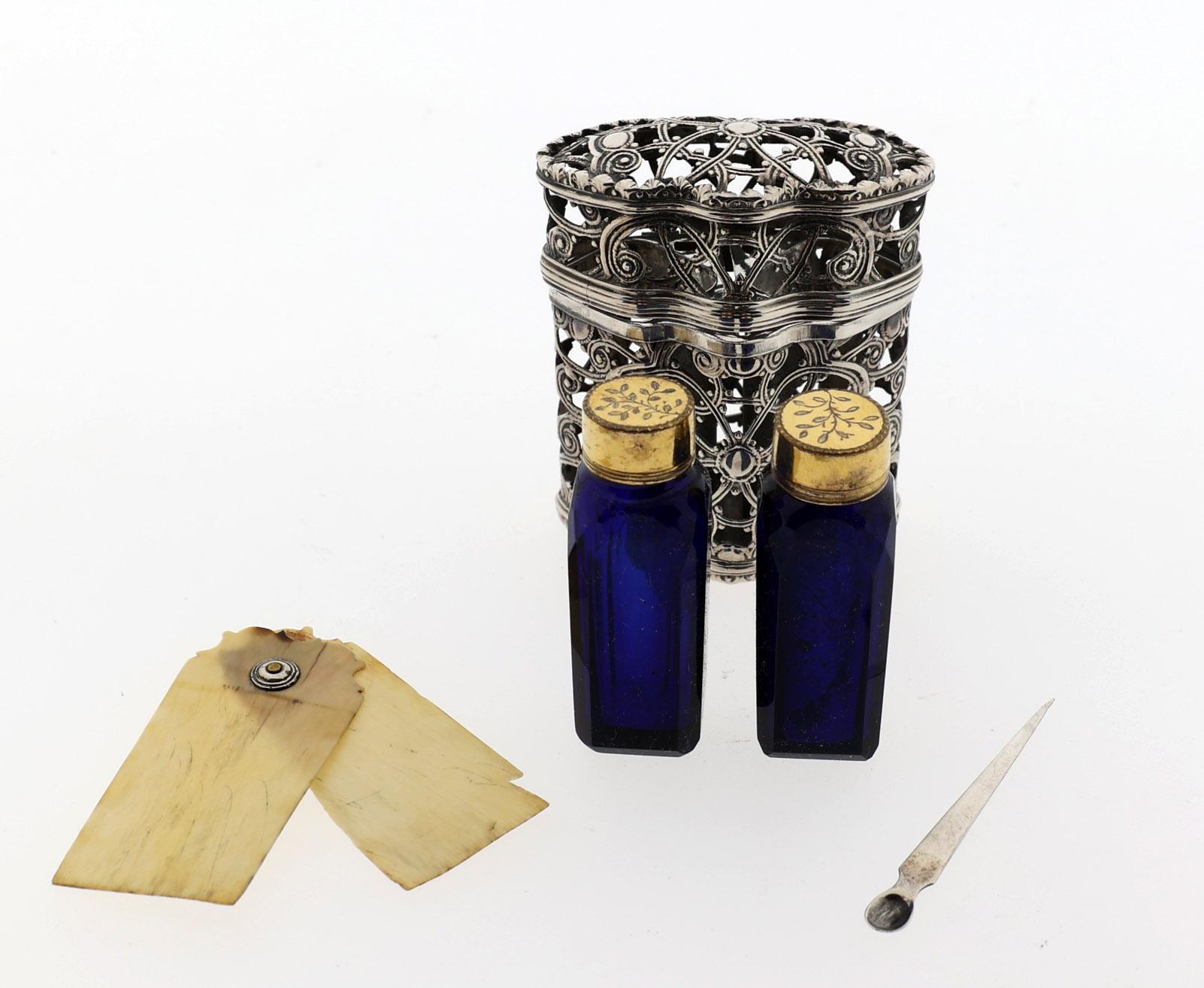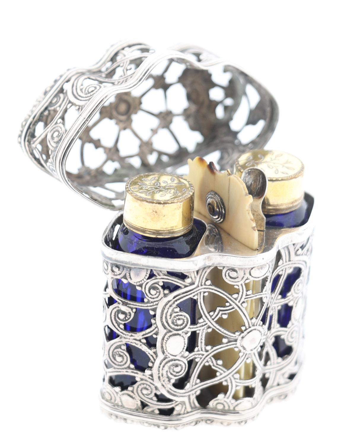 Opengewerkt zilveren necessaire met paars/blauwe kristallen flesjes met verguld zilveren dopjes, Nederland, rond 1830, h.5,5 cm.