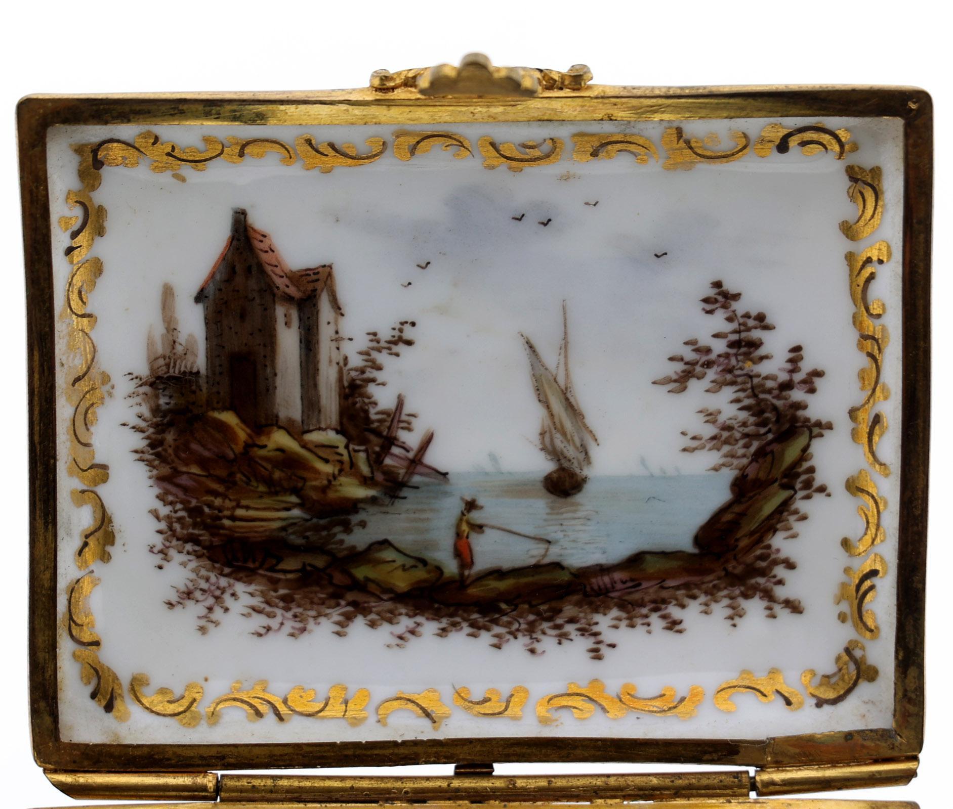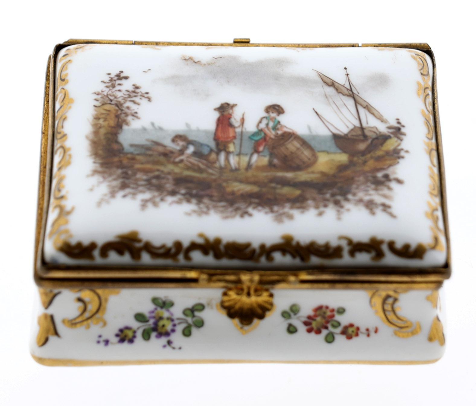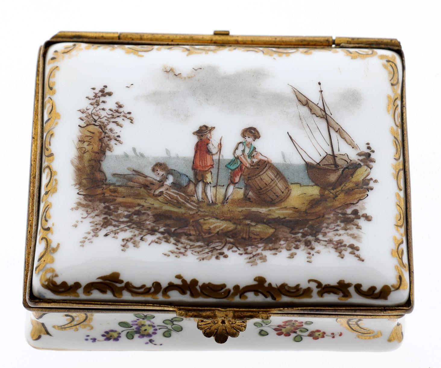 Porseleinen dekseldoos met beschildering van personen, schepen en bloemen, gemerkt aan onderzijde, 3 x 7 x 5,9 cm., 19e eeuw