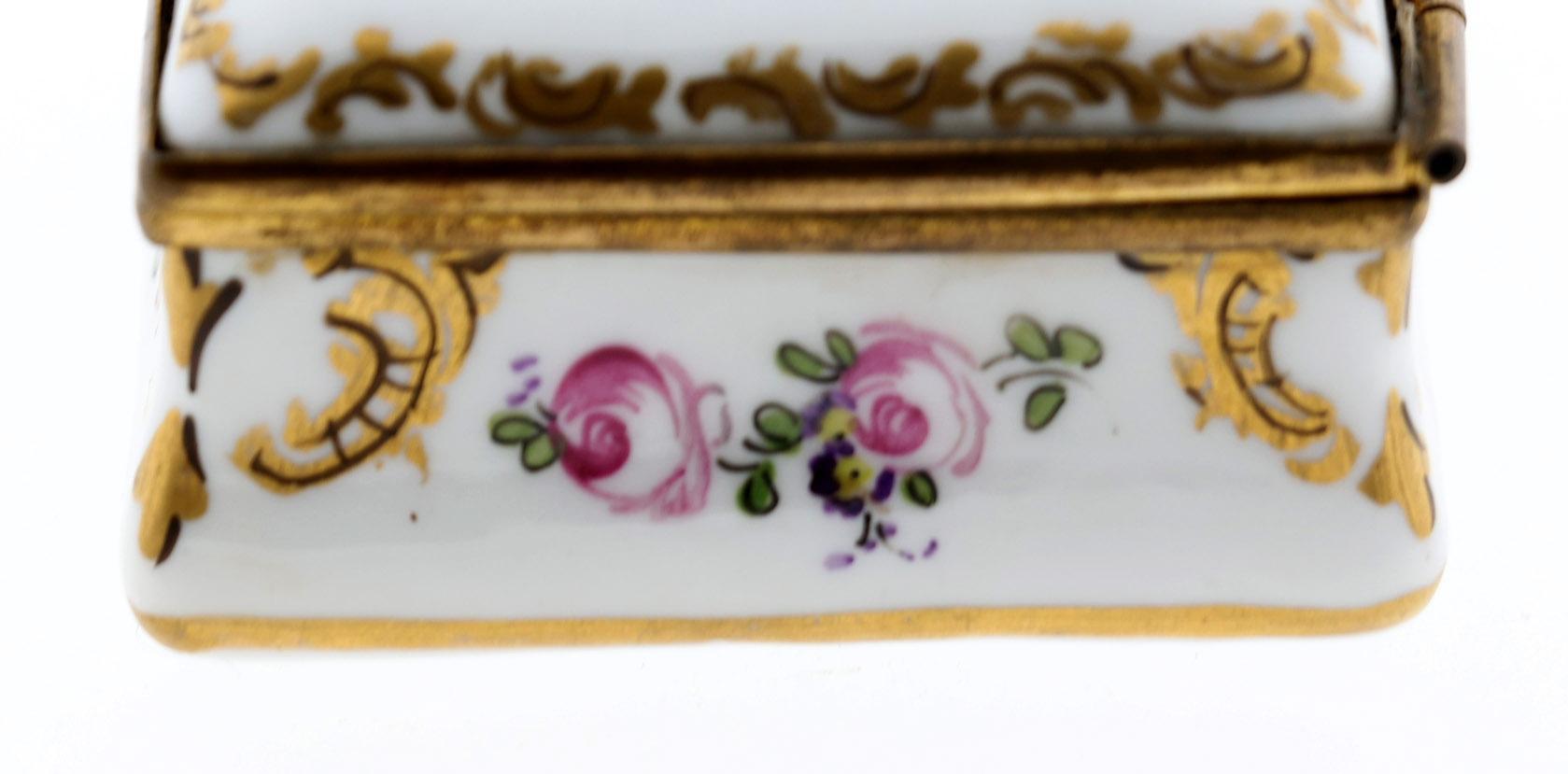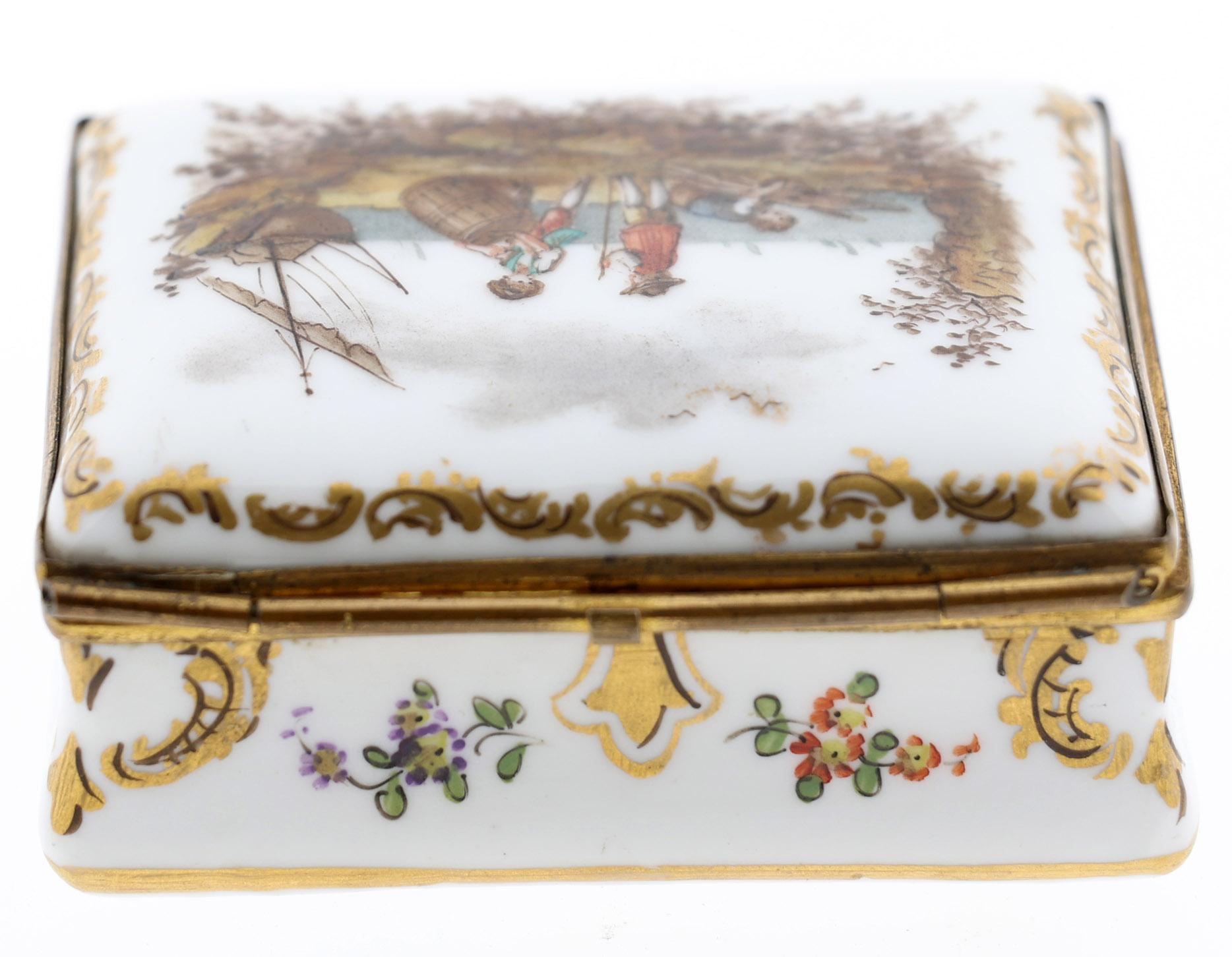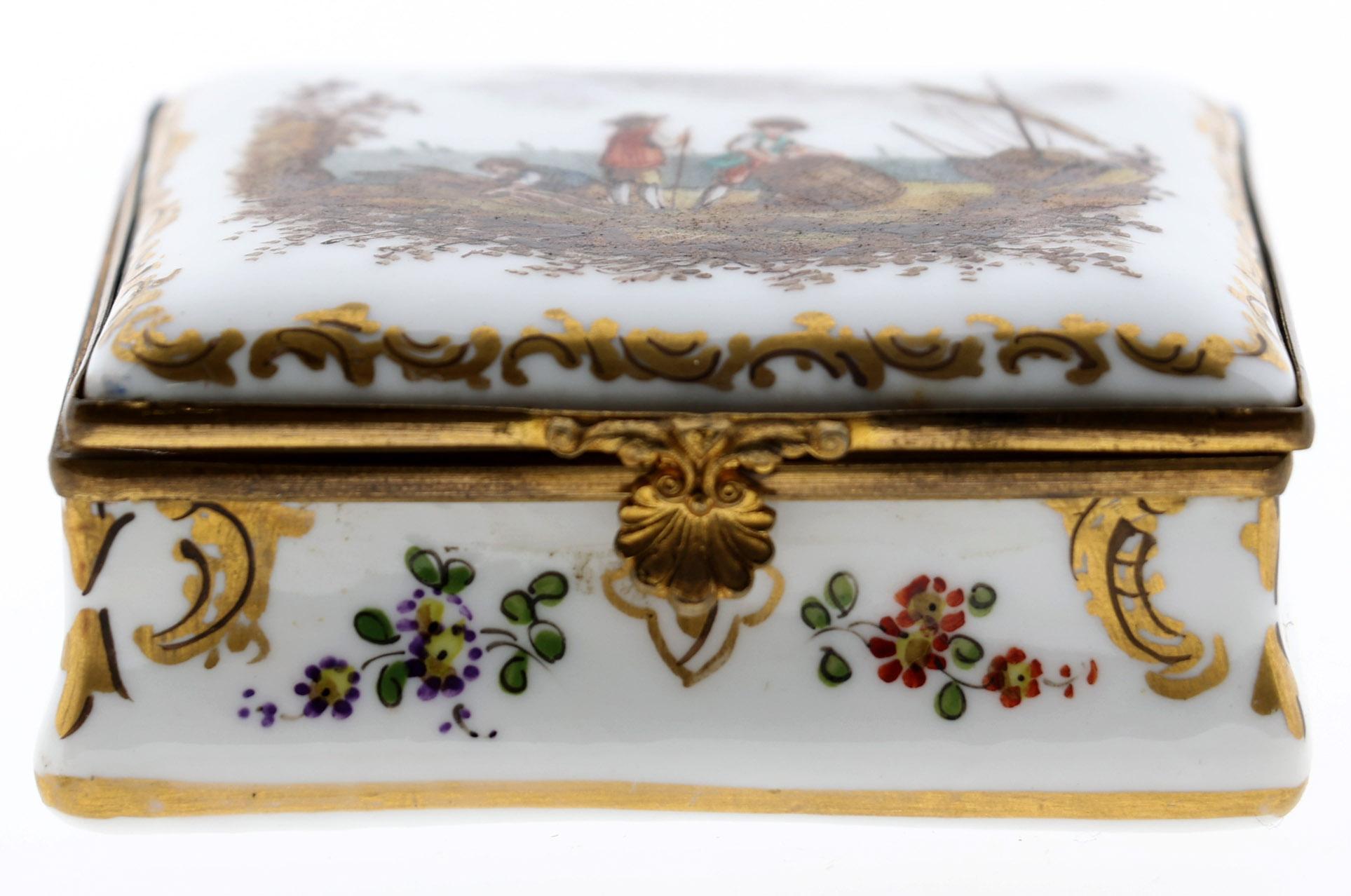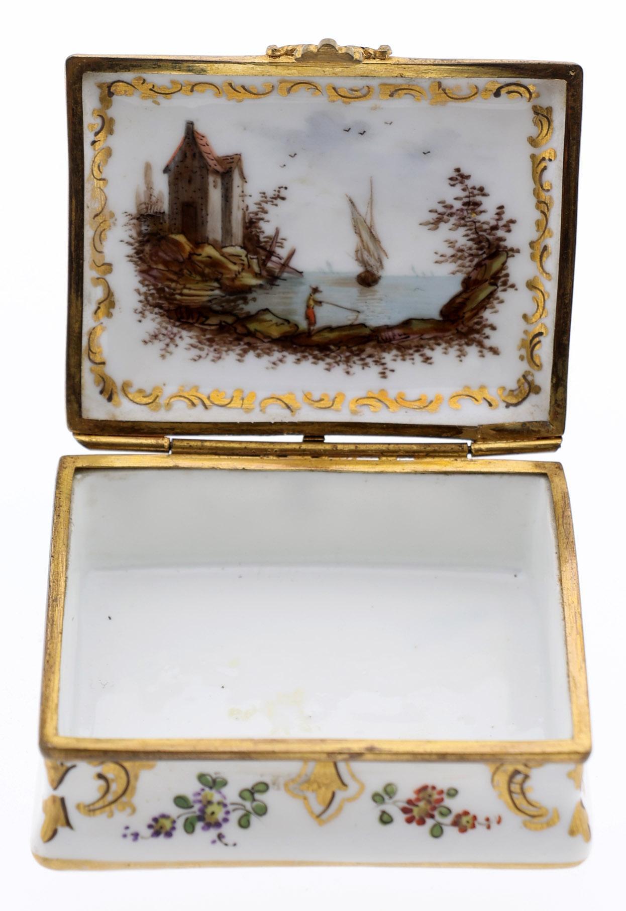 Porseleinen dekseldoos met beschildering van personen, schepen en bloemen, gemerkt aan onderzijde, 3 x 7 x 5,9 cm., 19e eeuw