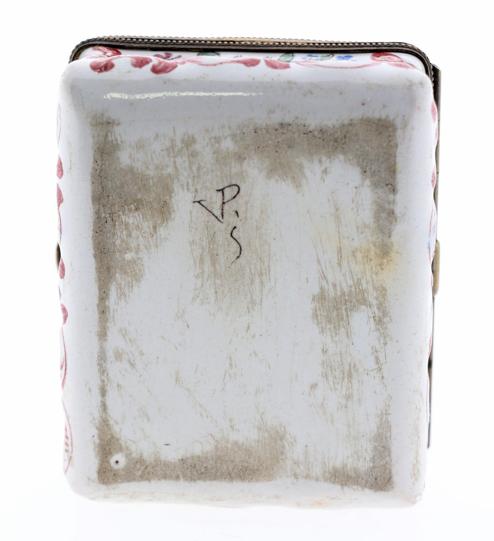 Porseleinen rechthoekige snuifdoos met romantisch paar in landschap en zilveren sluiting, Duitsland, 19e eeuw, 8,5 x 3,5 x 6,8 cm.