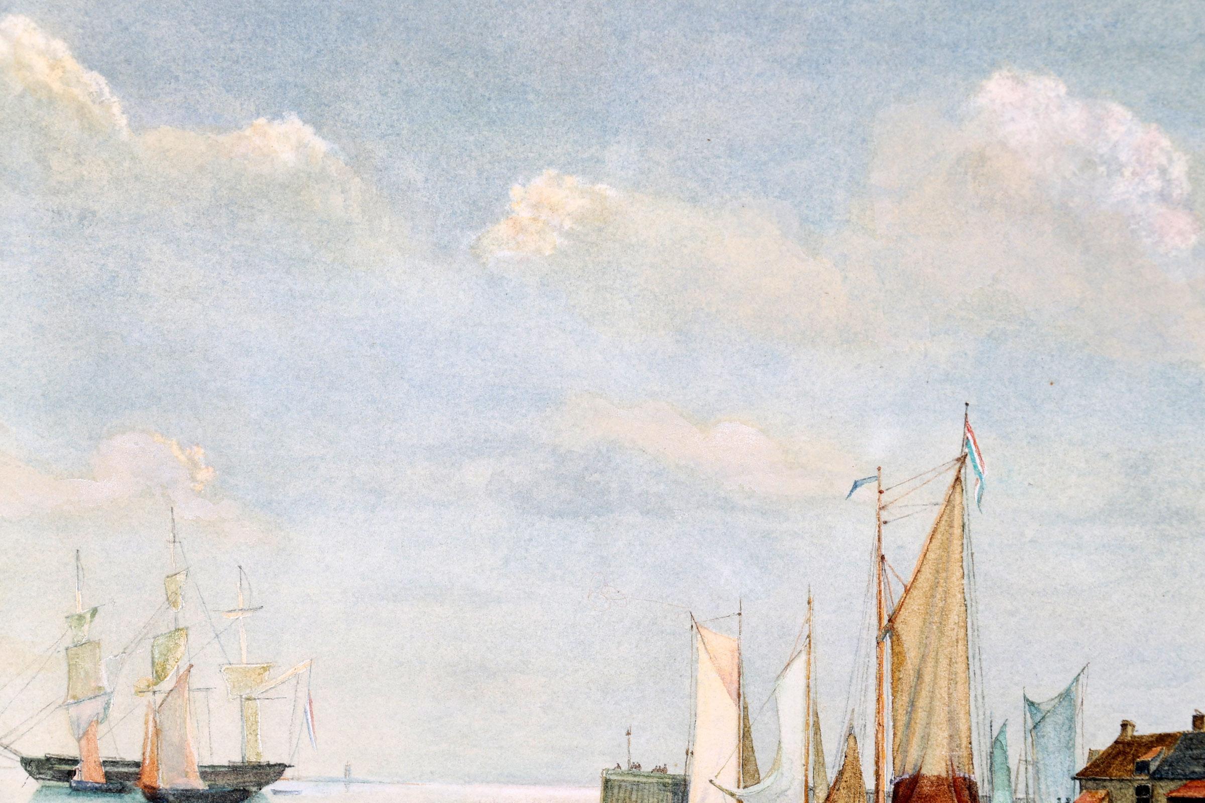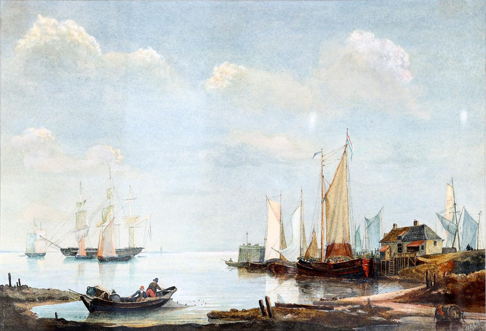 Jan Christianus Schotel (1787-1838), Afgemeerde boten langs de kust, aquarel, 17 x 25 cm., Provenance: particuliere collectie
