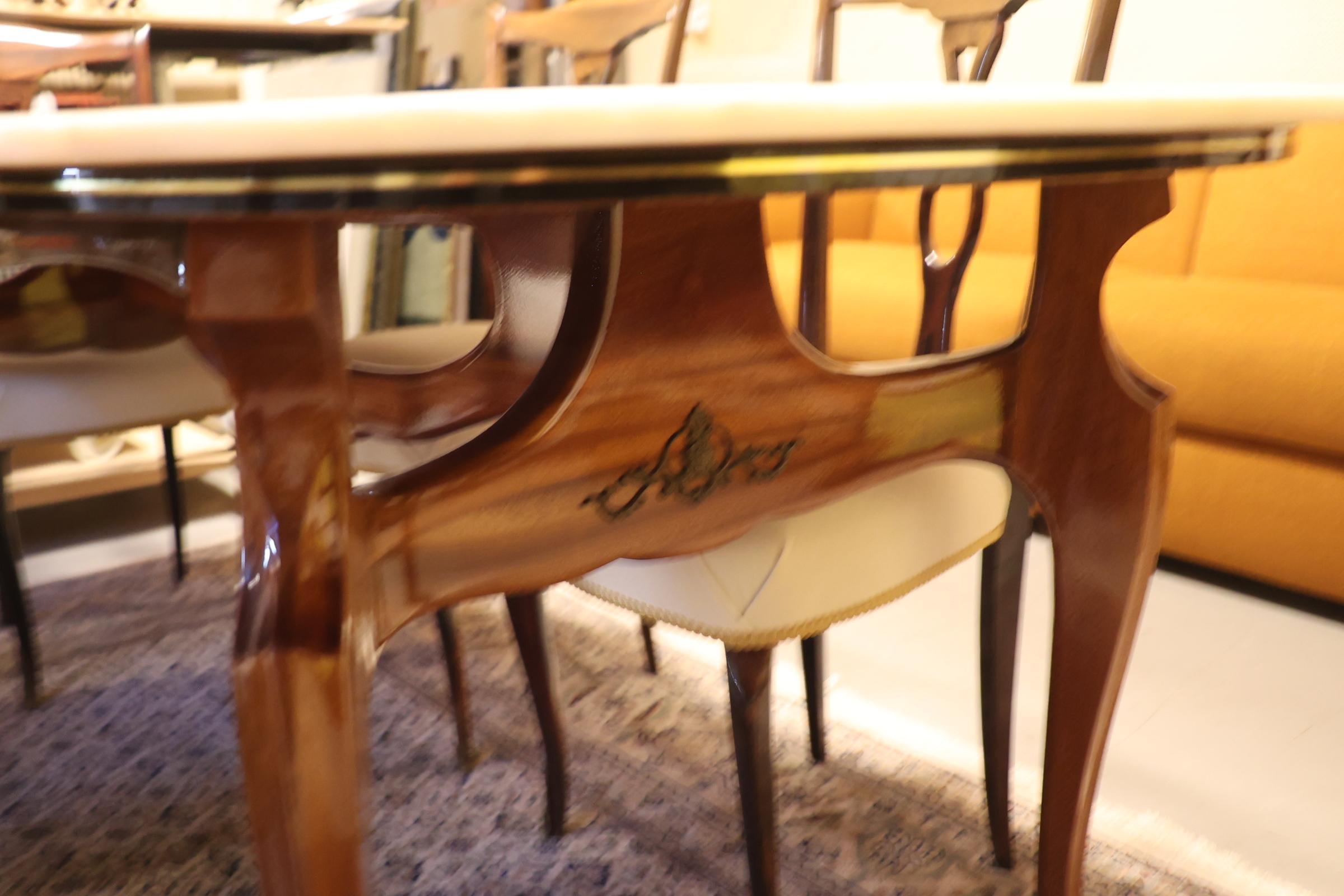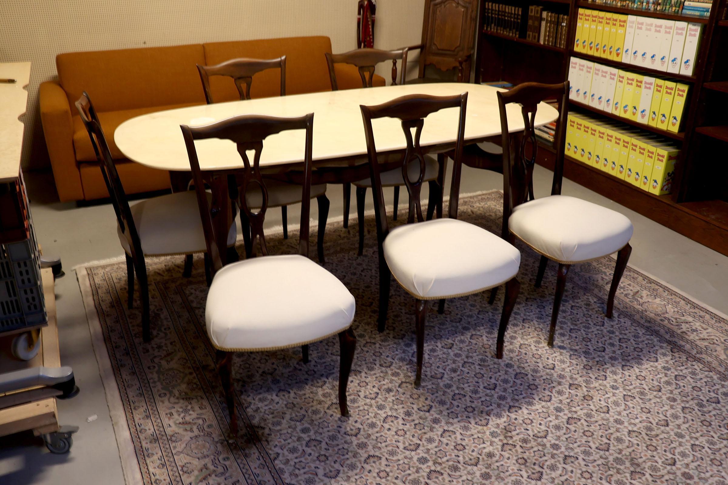Notenhouten eetkamertafel met natuurstenen blad en 6 bijpassende stoelen, h.78 x b.192 x d.93 cm.