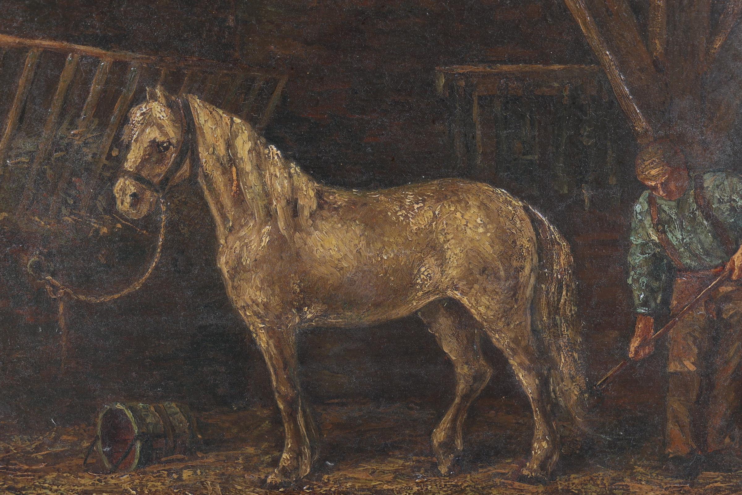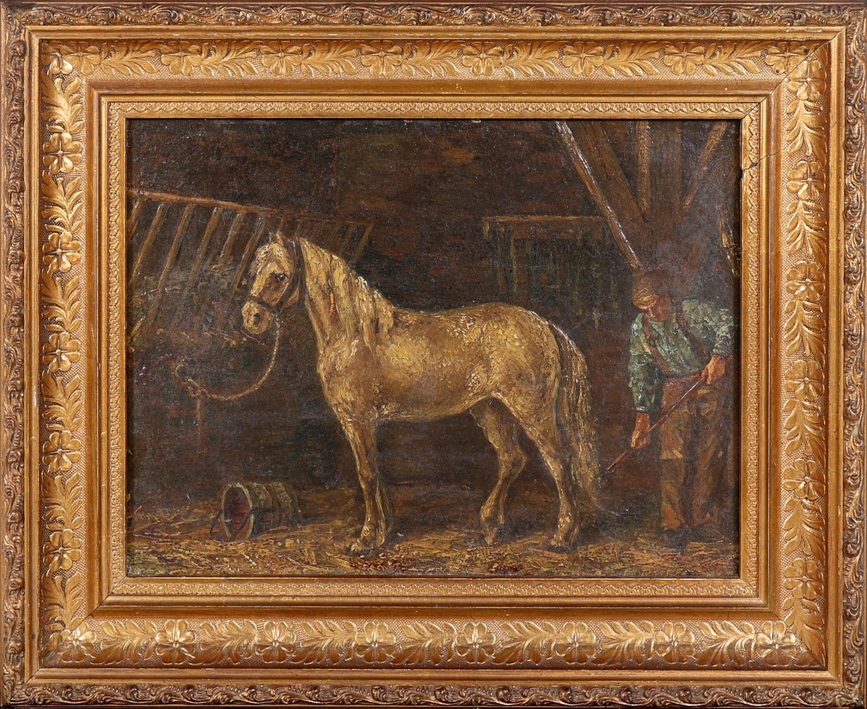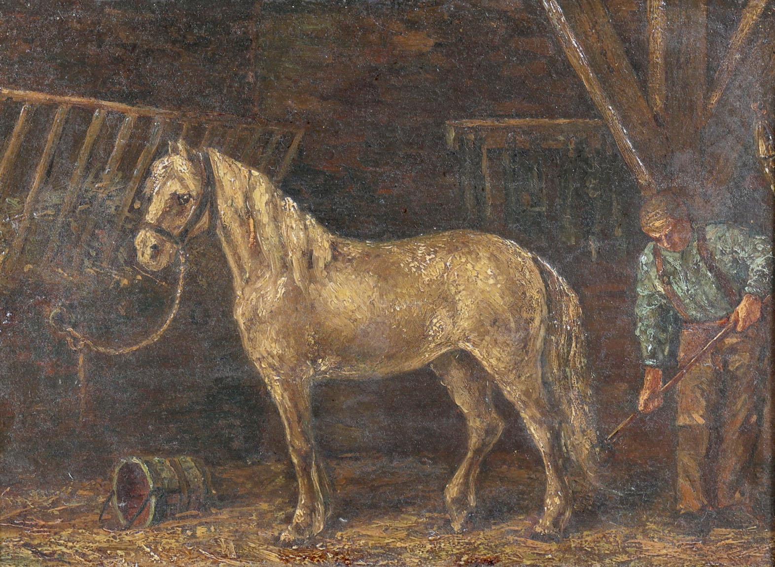 Onb. meester, Boer met paard in stal, olieverf op paneel, 25 x 34 cm.