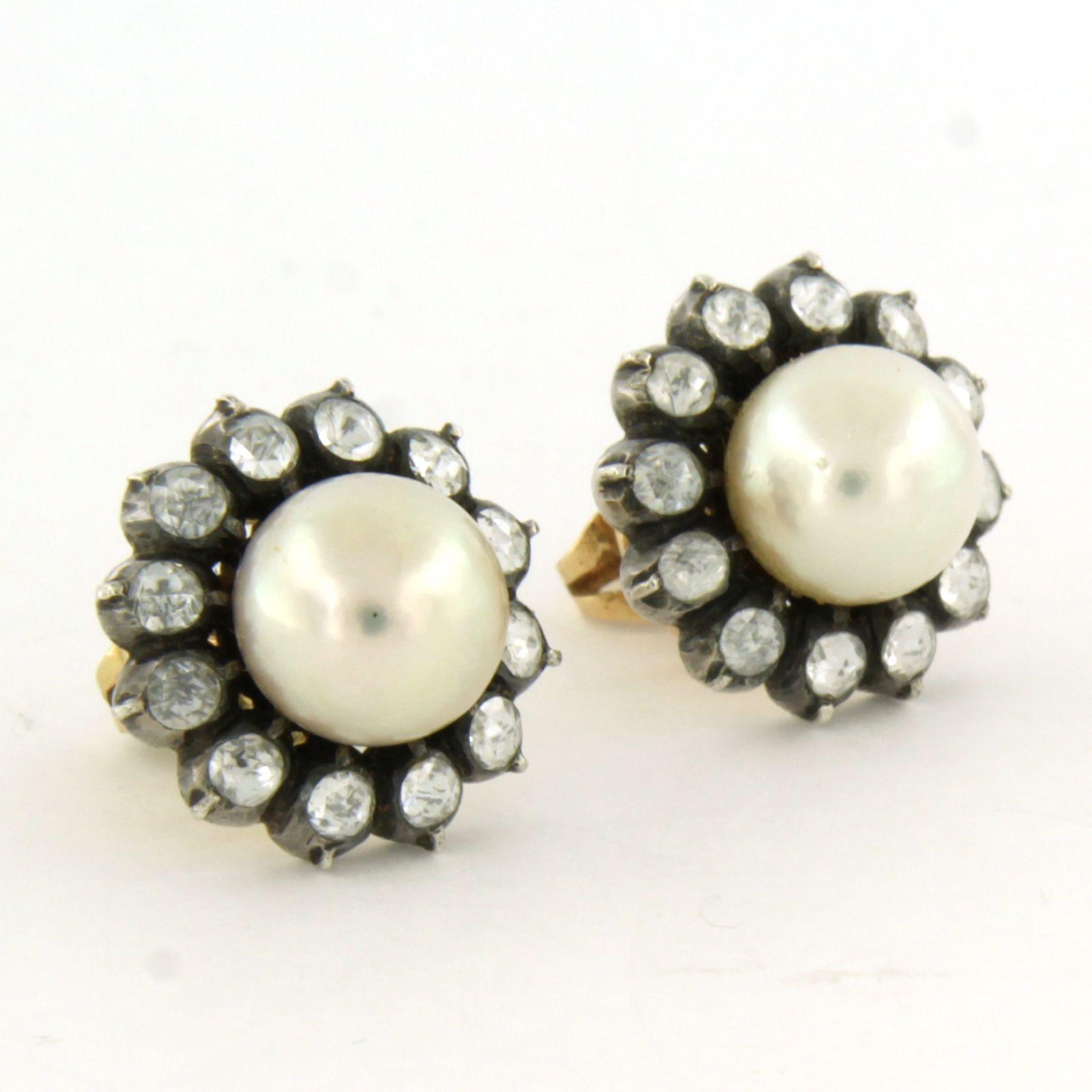 14 Kt. gouden met zilveren oorknoppen bezet met parel en roosgeslepen diamant, totaal circa 1.00 ct. – G/H – SI