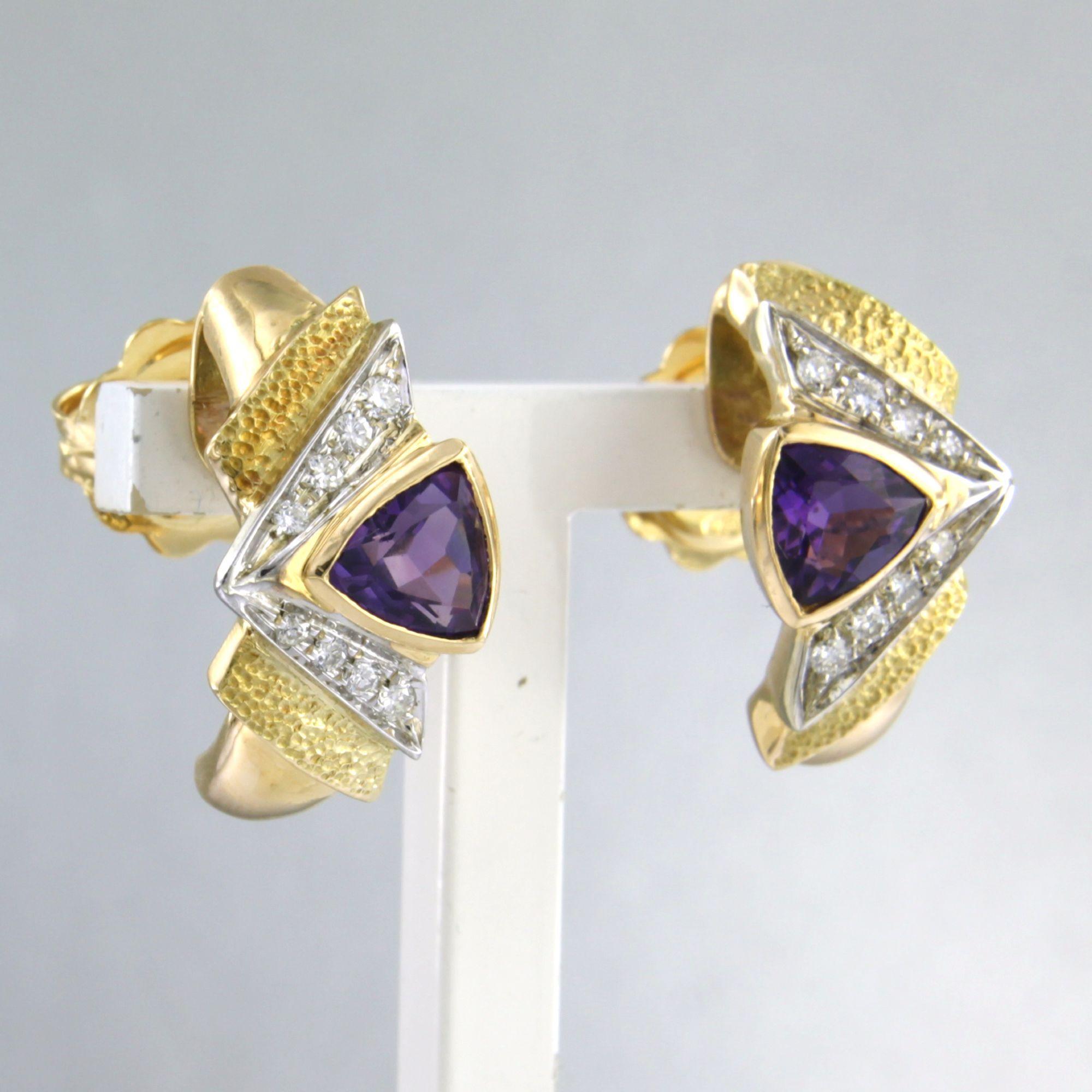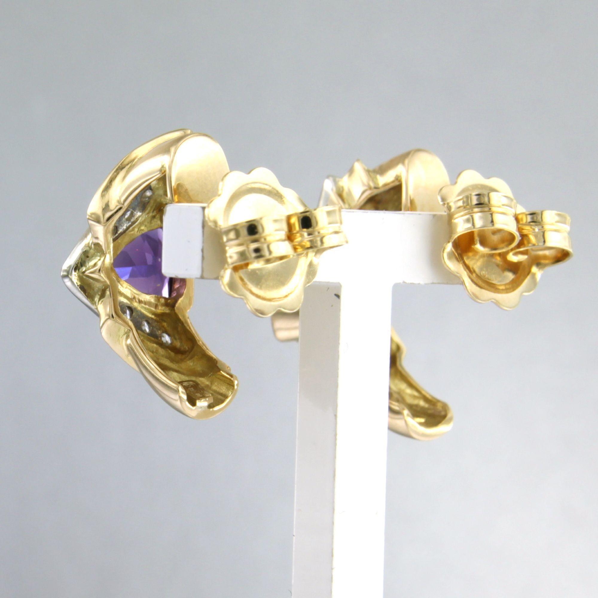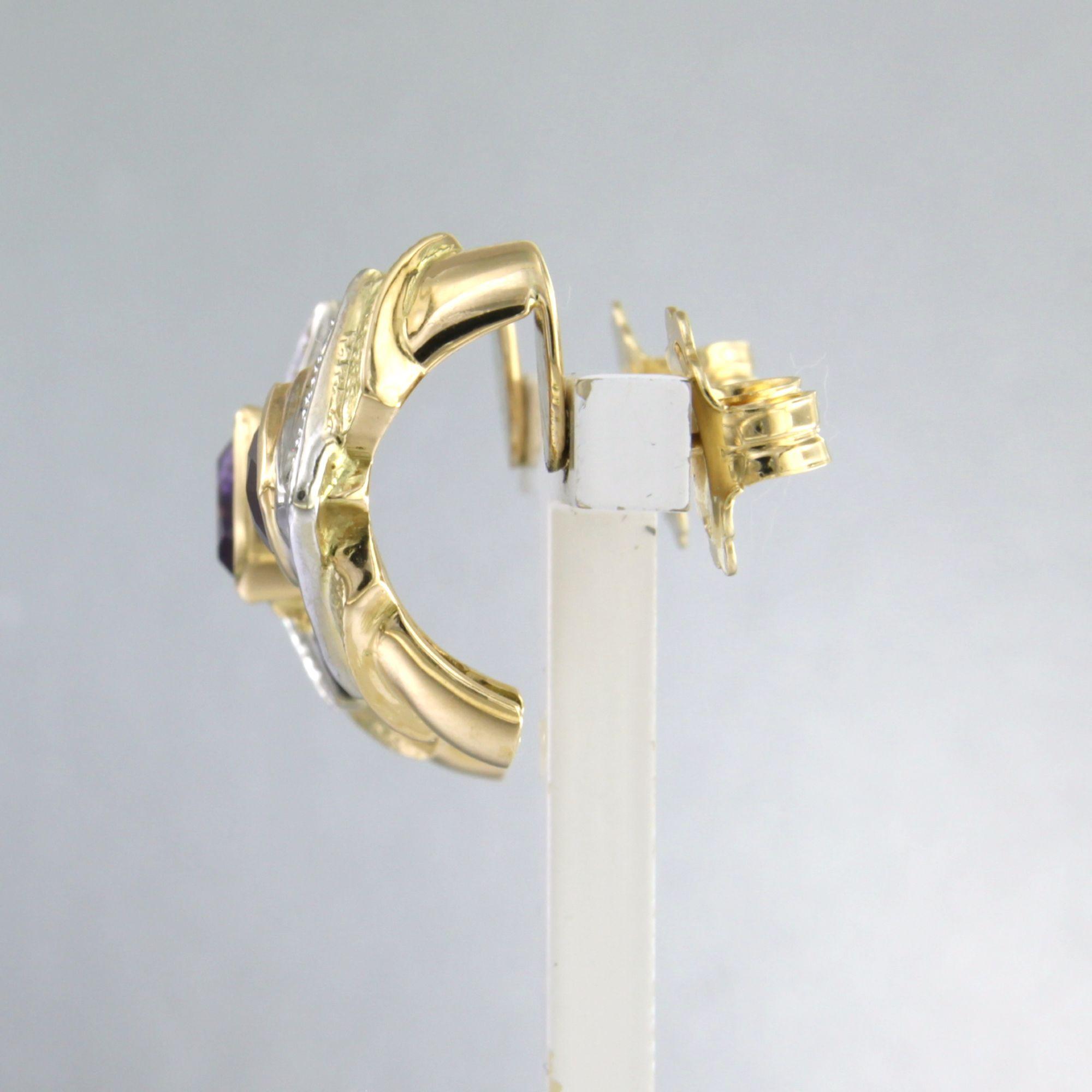 18 Kt. bicolor gouden oorknoppen bezet met amethist en briljant geslepen diamanten tot. 0.32 ct.