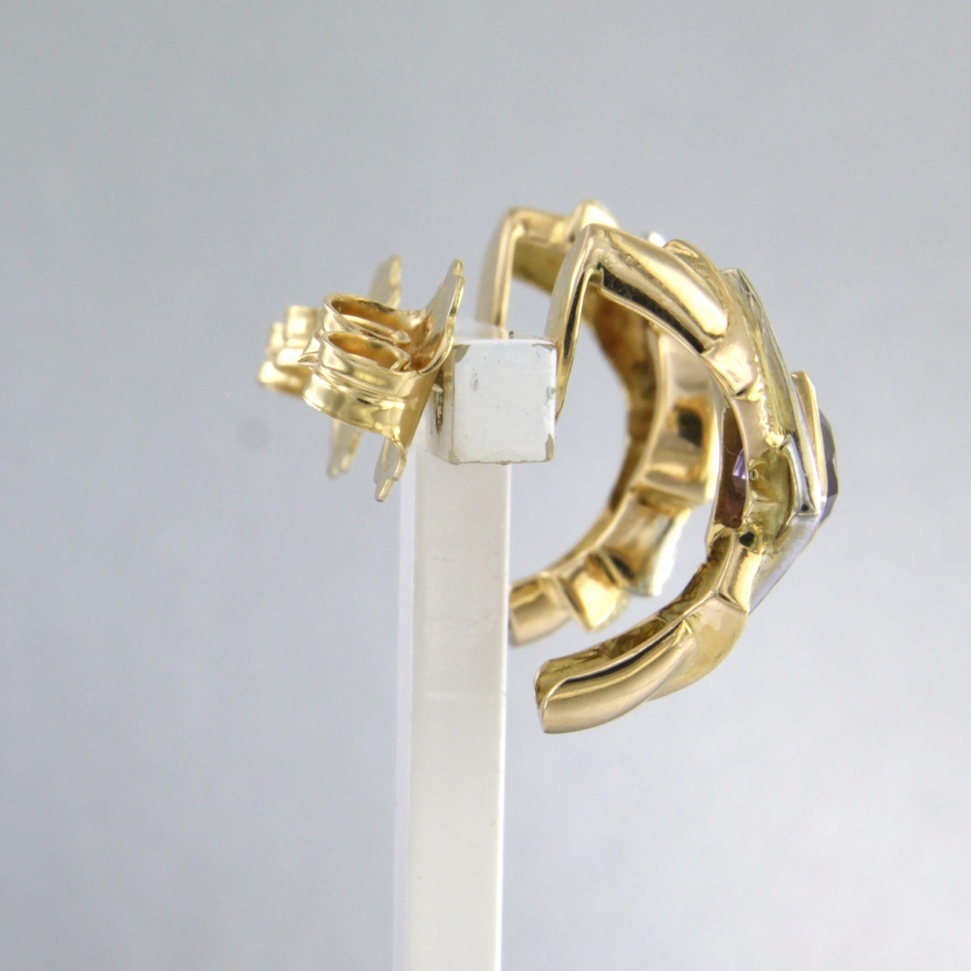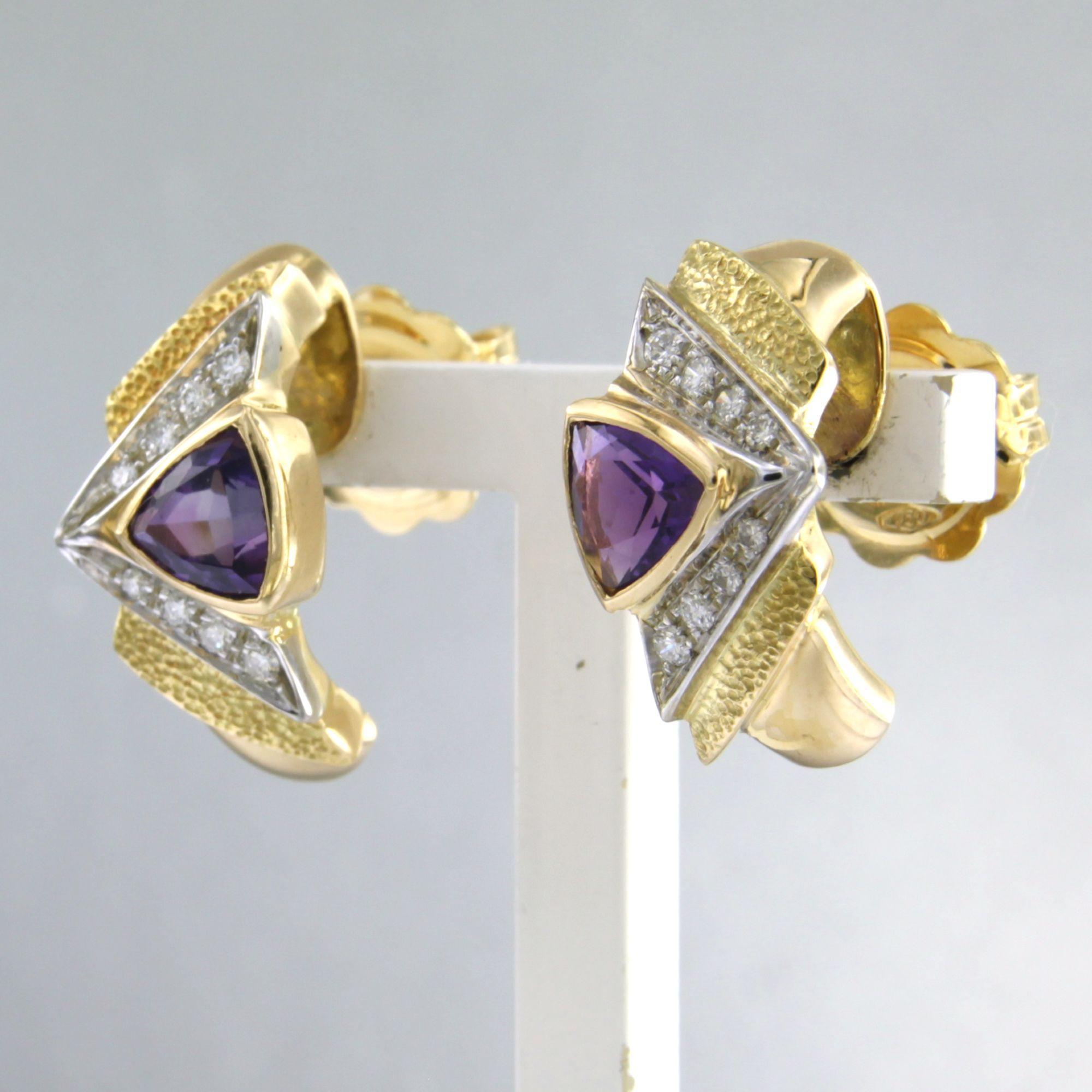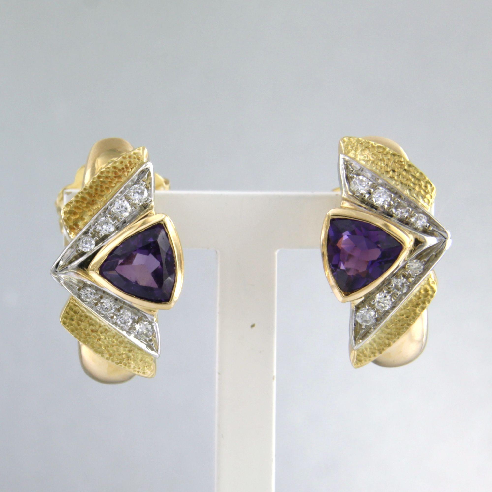18 Kt. bicolor gouden oorknoppen bezet met amethist en briljant geslepen diamanten tot. 0.32 ct.