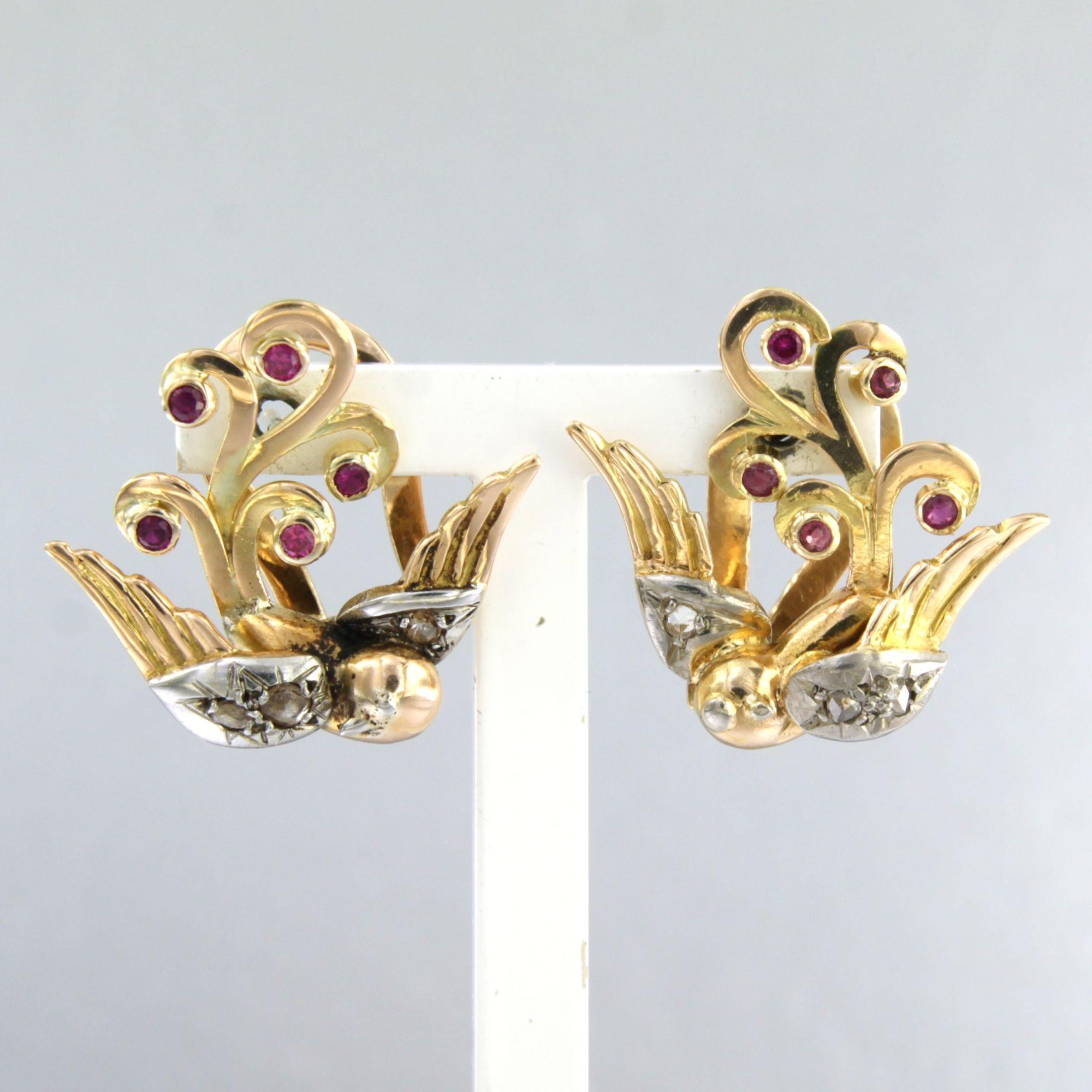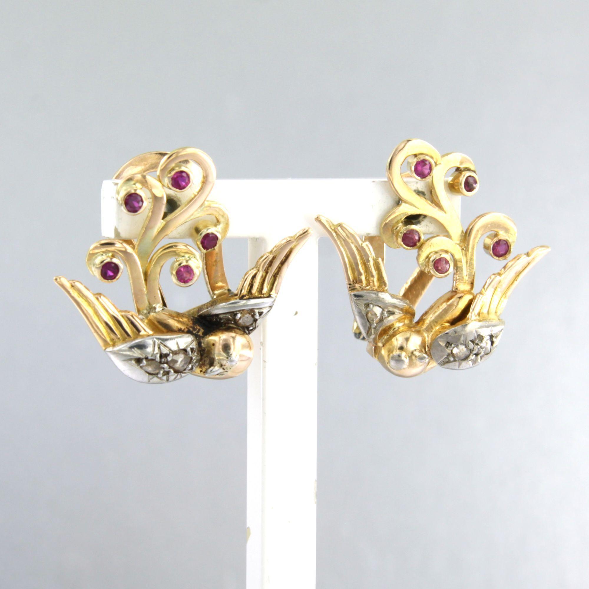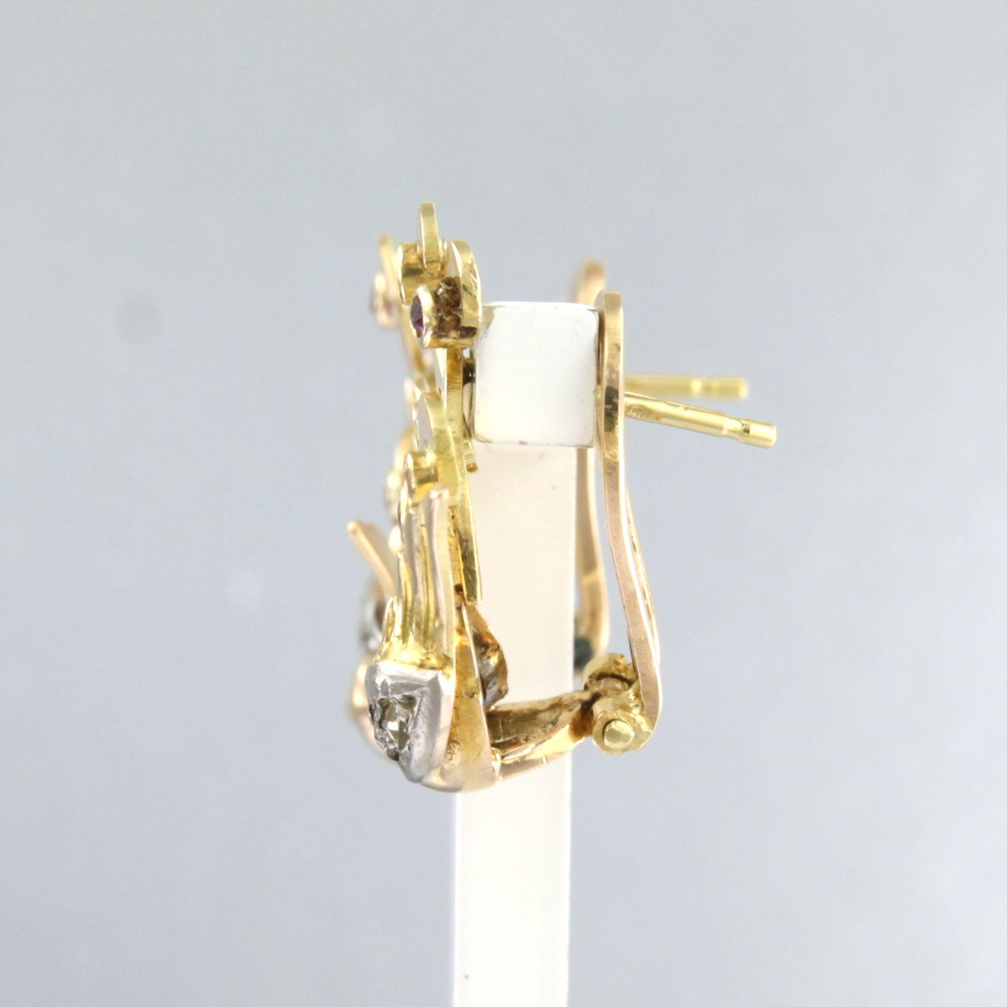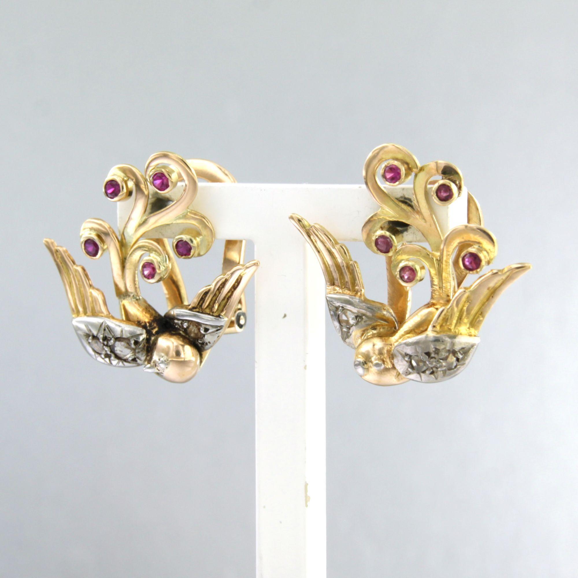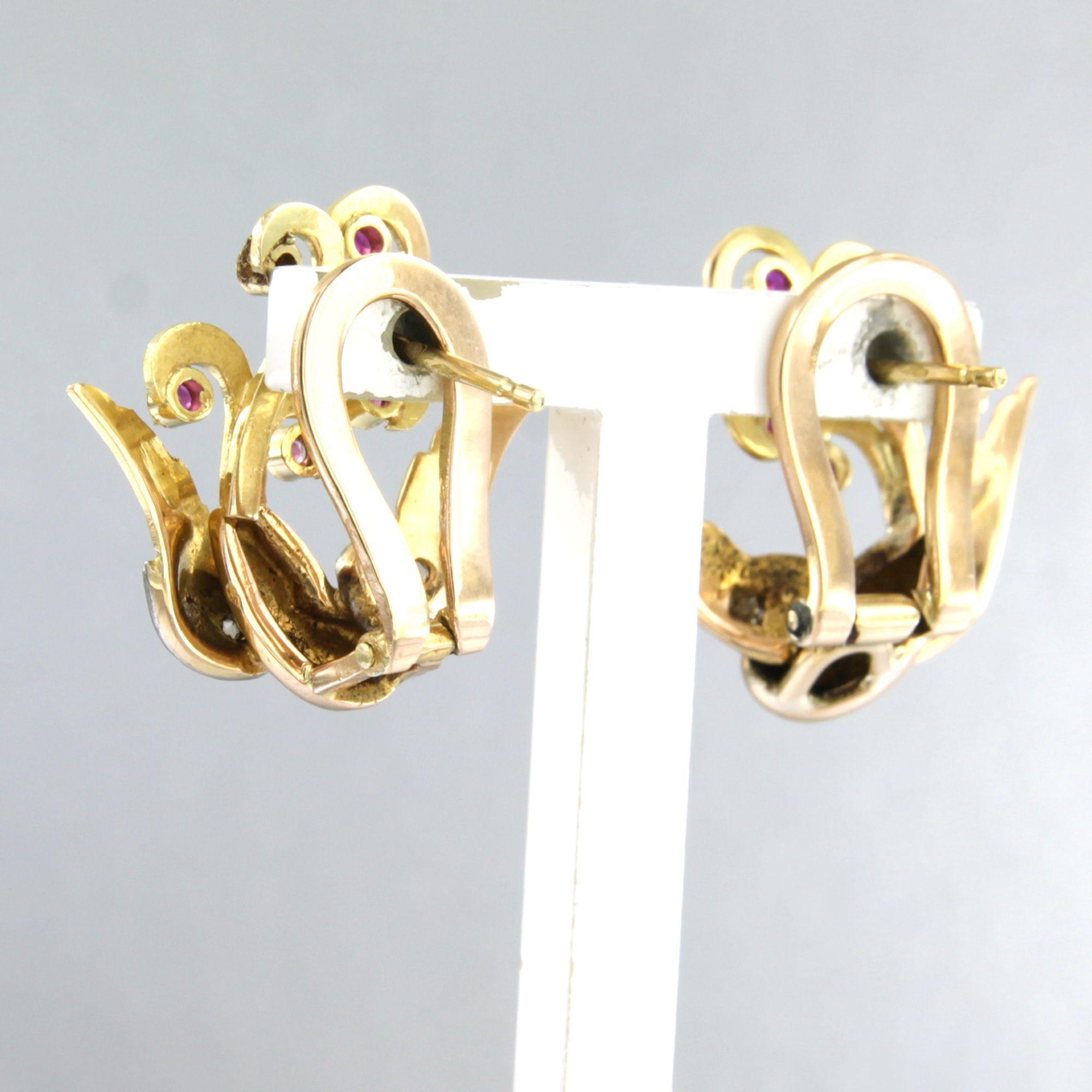 Retro 18 Kt. roségouden met zilveren oorclips bezet met robijn en roosdiamanten tot. 0.05 ct.
