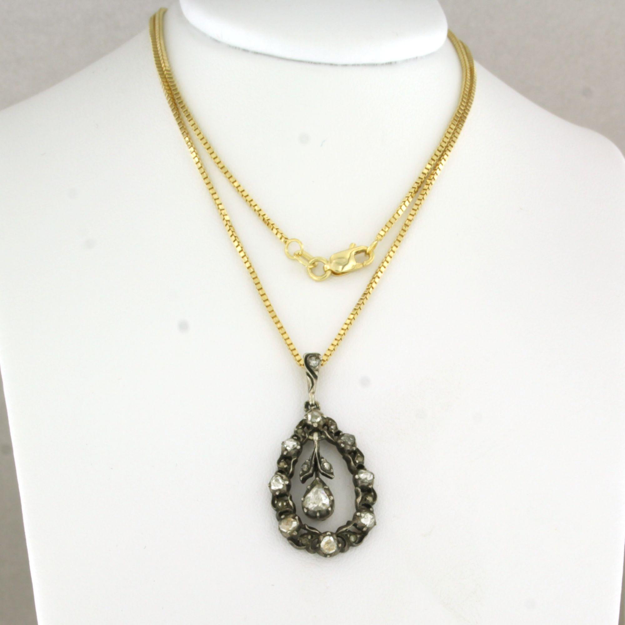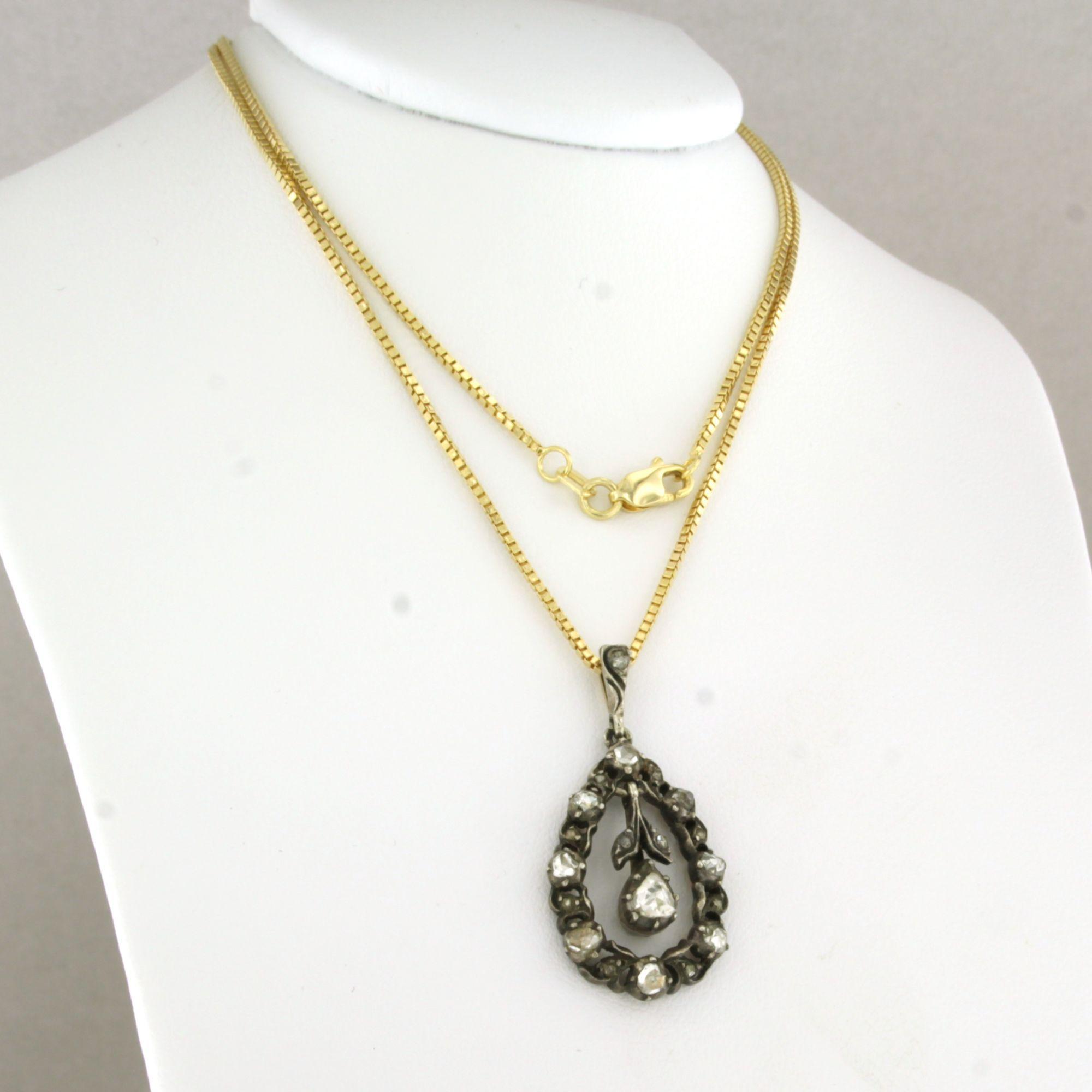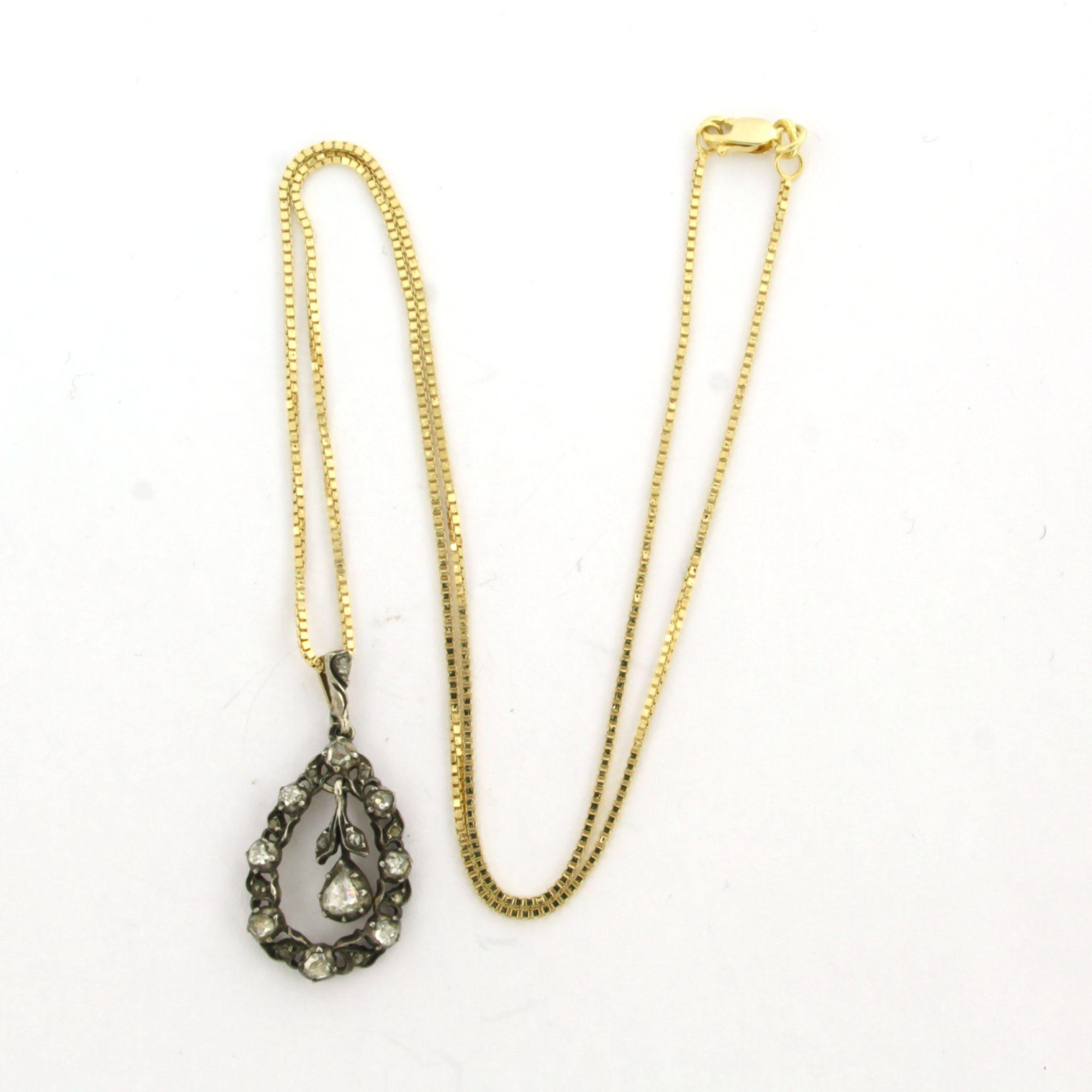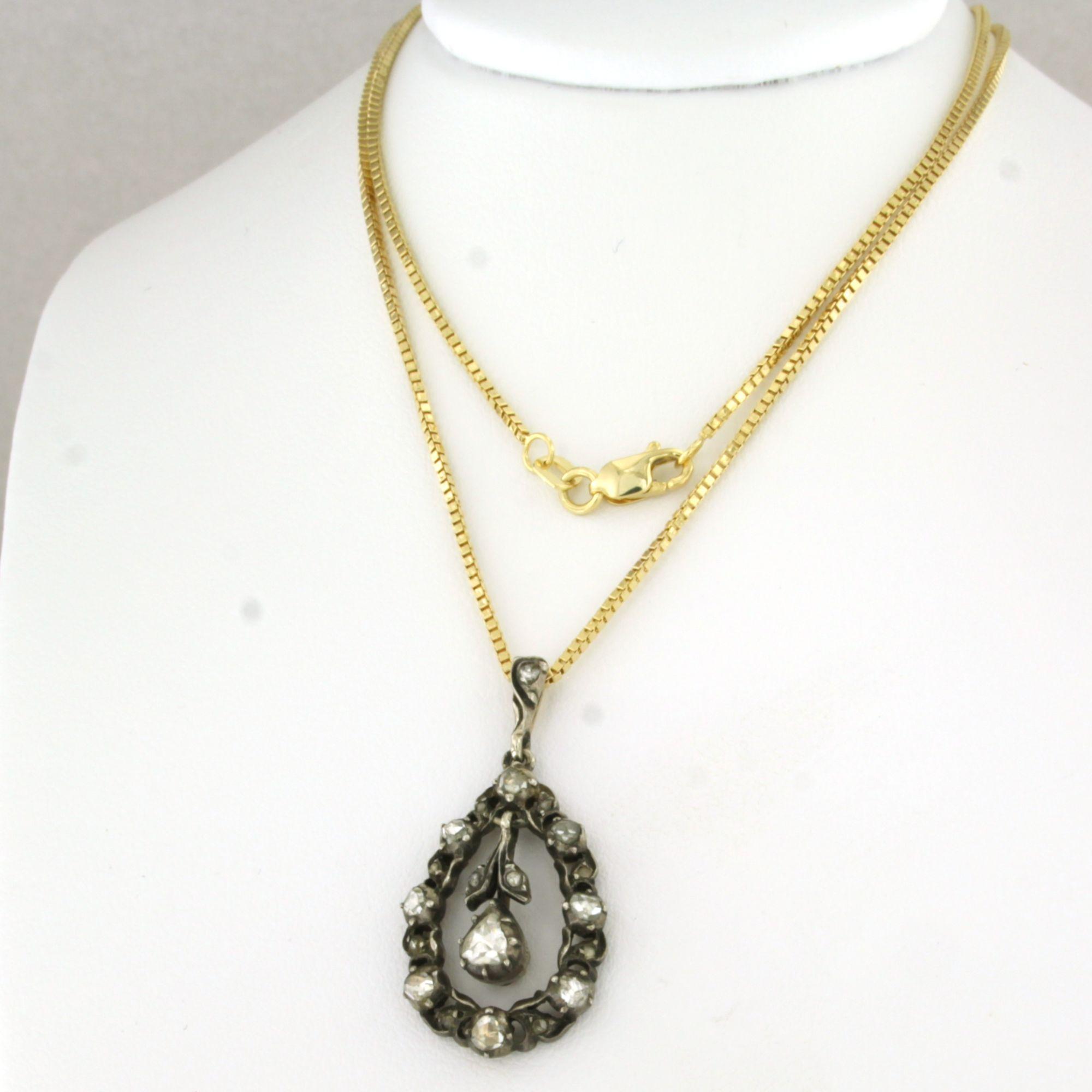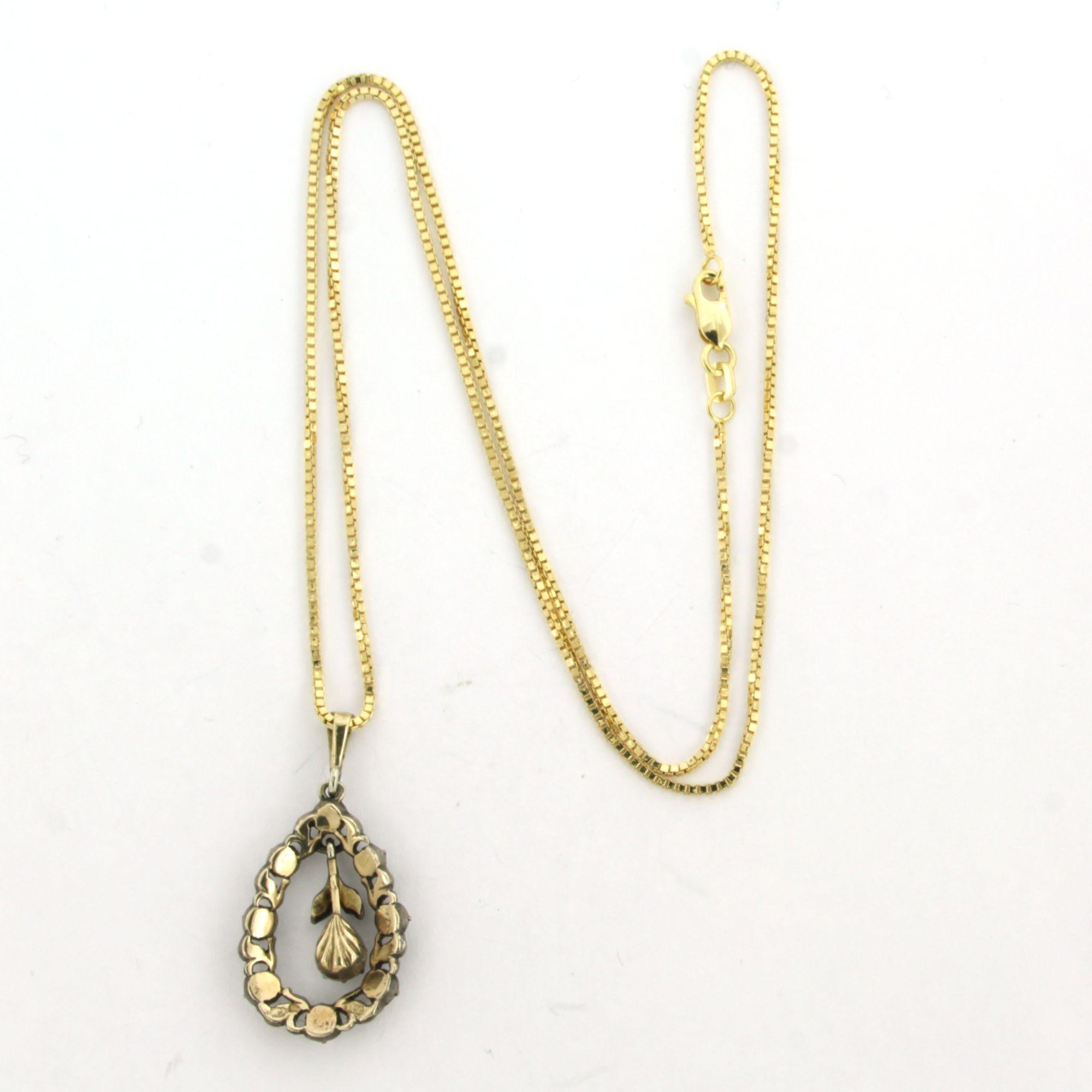 14 Kt. geelgouden collier met een gouden met zilveren hanger bezet met roosdiamanten tot. 0.25 ct. lente 44 cm