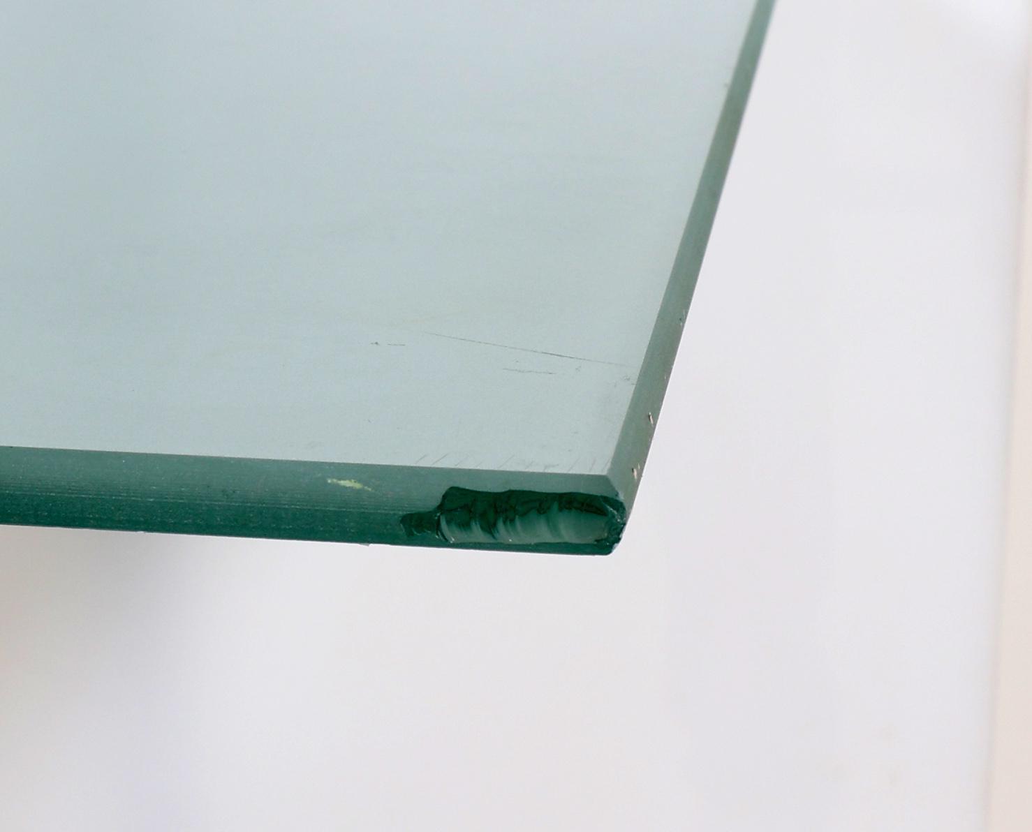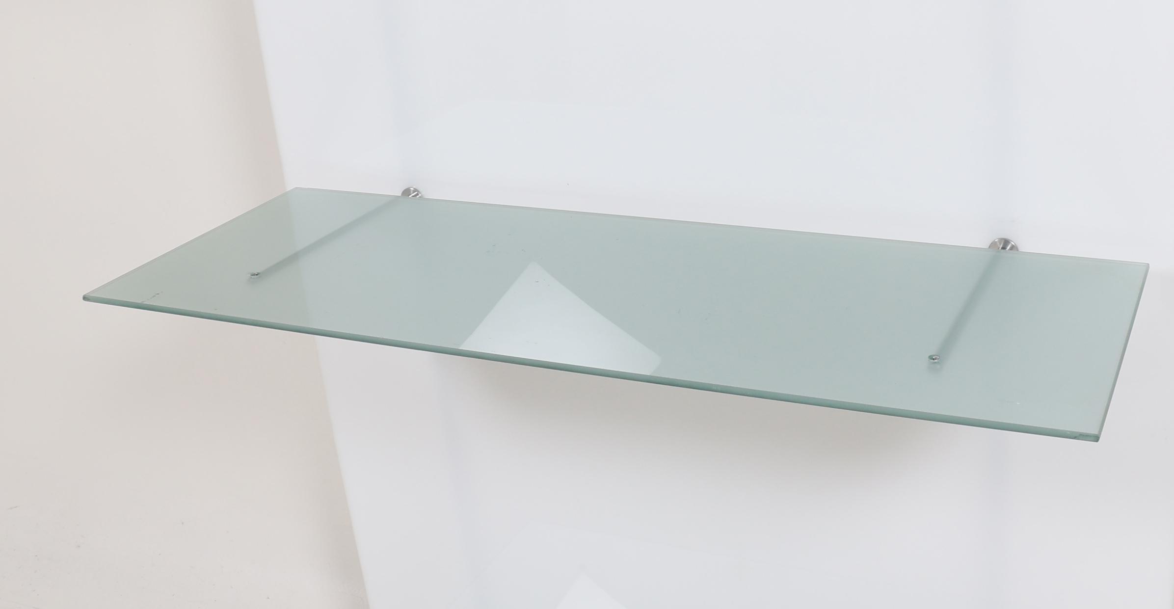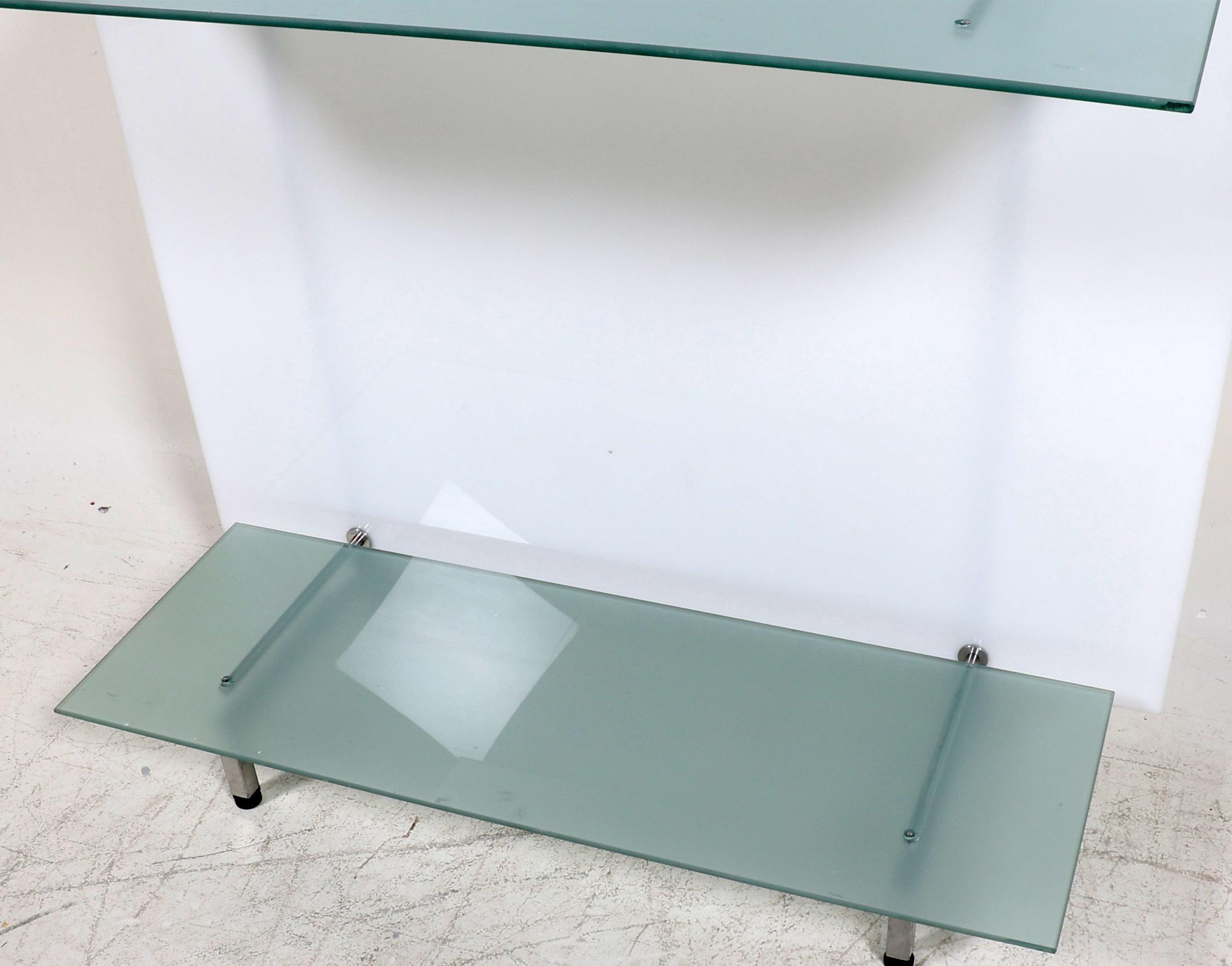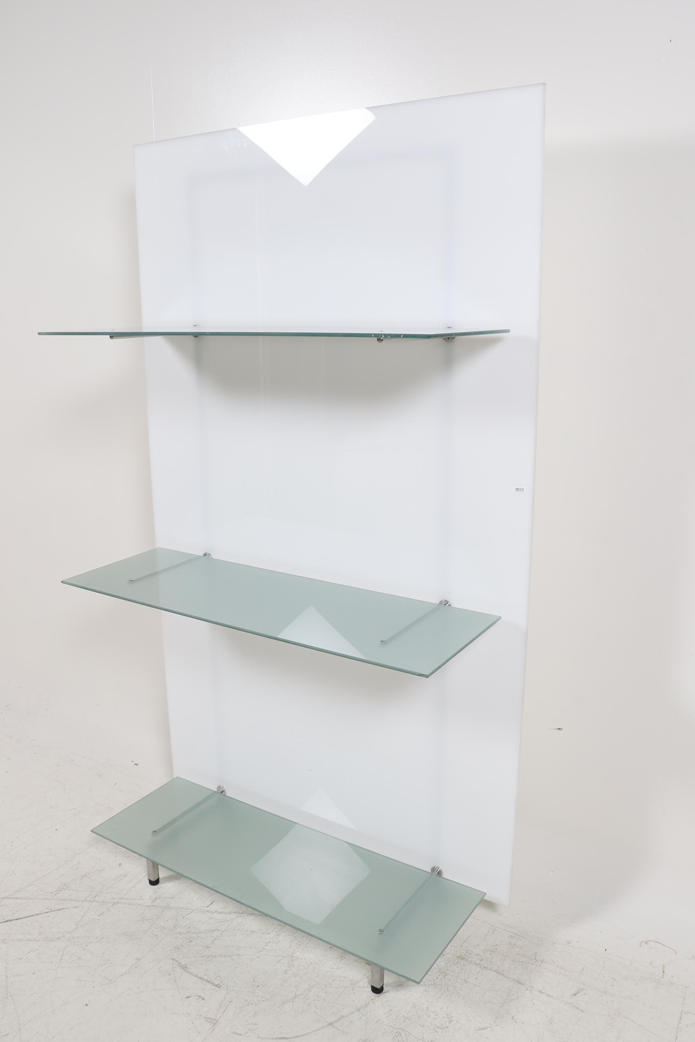 Vrijstaande display wand met wit plexiglazen achtergrond en glazen planken, h.212 x b.120 x d.43 cm.
