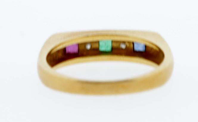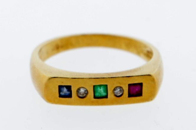 Gouden ring bezet met briljant geslepen diamant, jadesteen en robijn, diam 18 mm., 4,5 gram