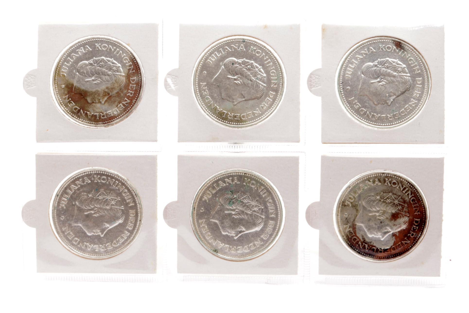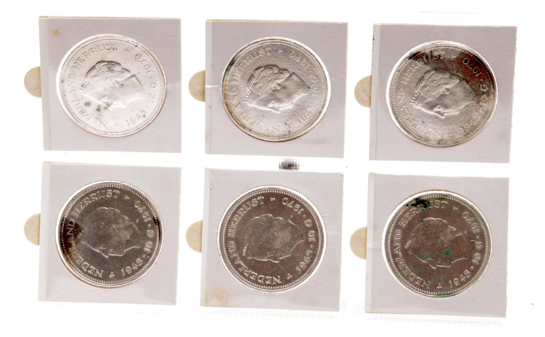 6 Zilveren 10 gulden muntstukken, Juliana 1948/1973, zilver gewicht 150 gram