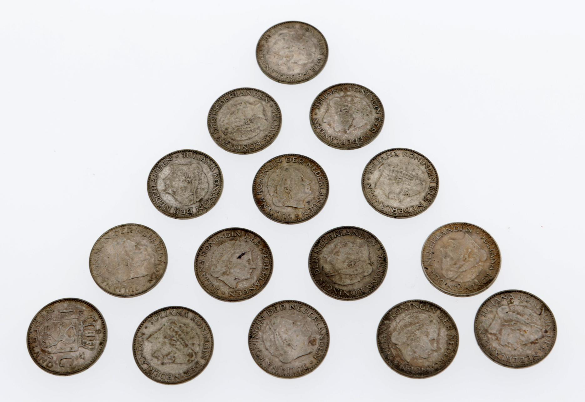 15 Zilveren gulden mutstukken, Koningin Juliana, diverse jaren, zilver gewicht 100 gram