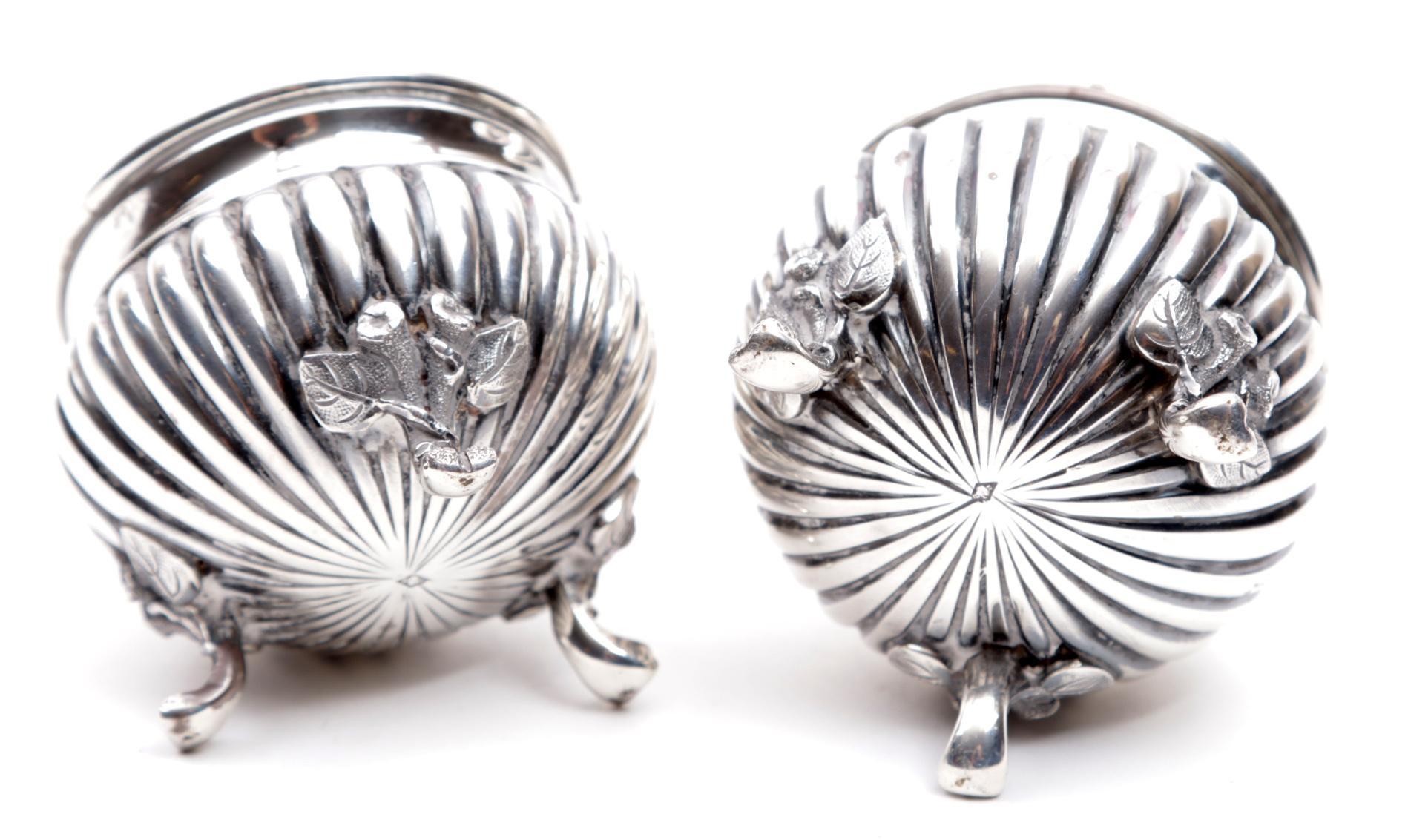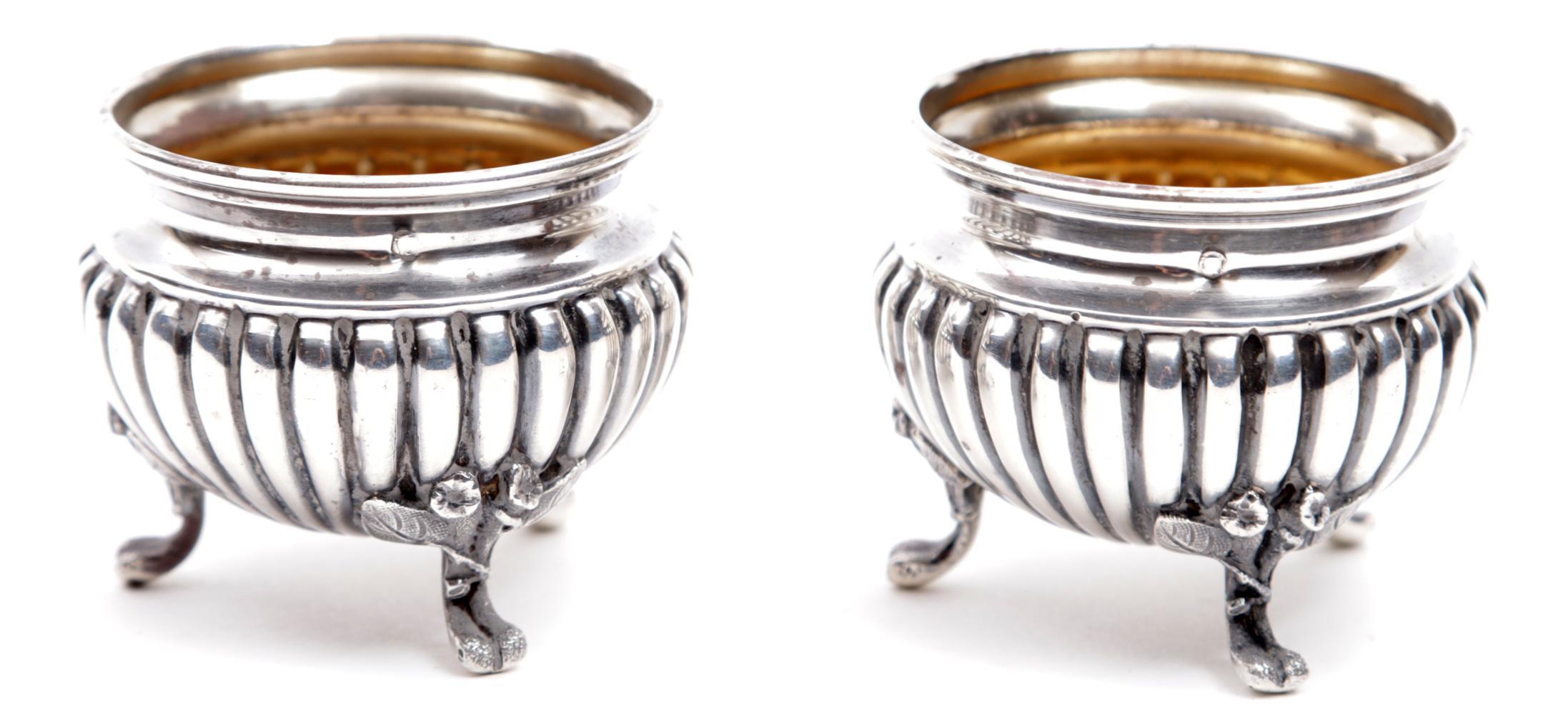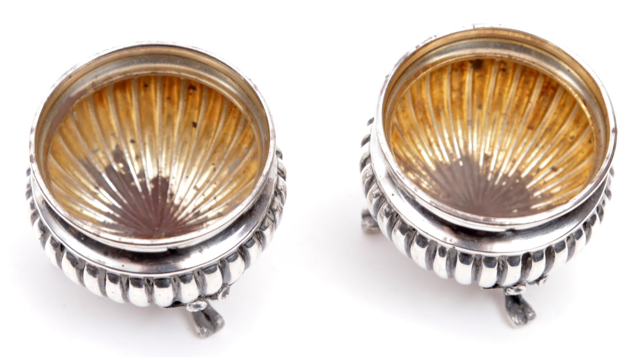 2 Antieke zoutvaatjes op klauwpootjes, diam.5,5 cm., 82 gram