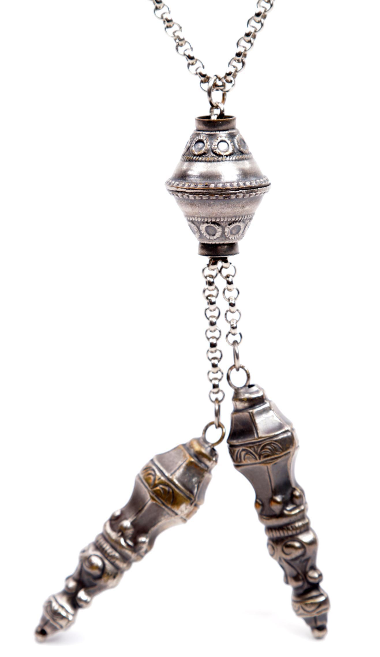 2 Zilveren breipenhouders aan jasseron collier, ca.1900