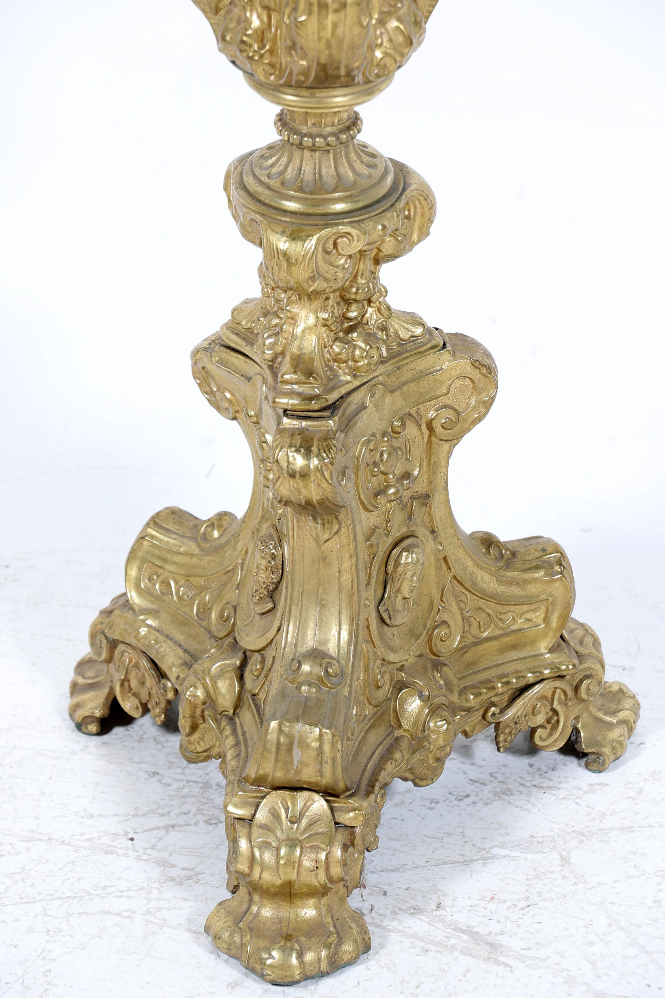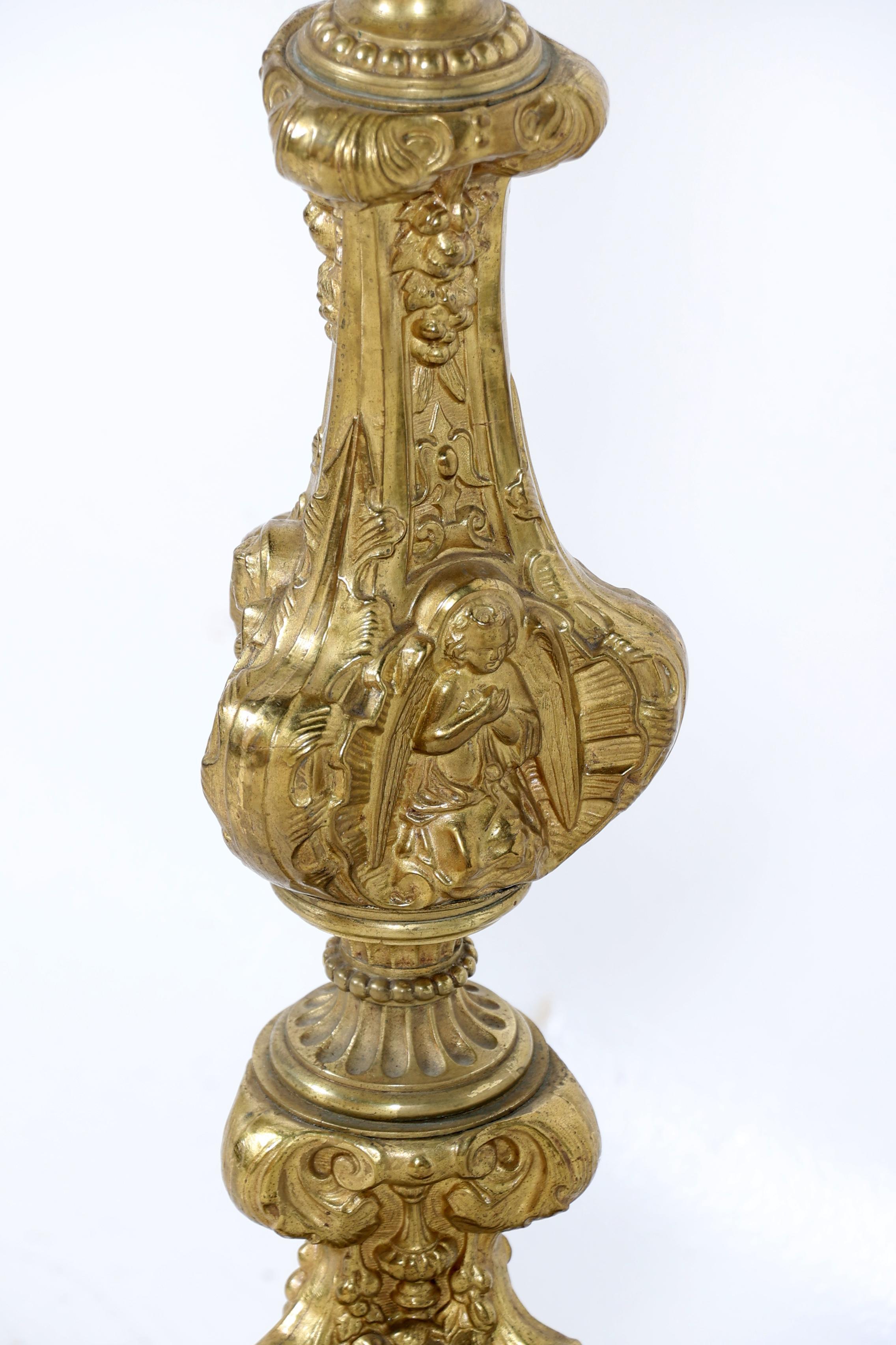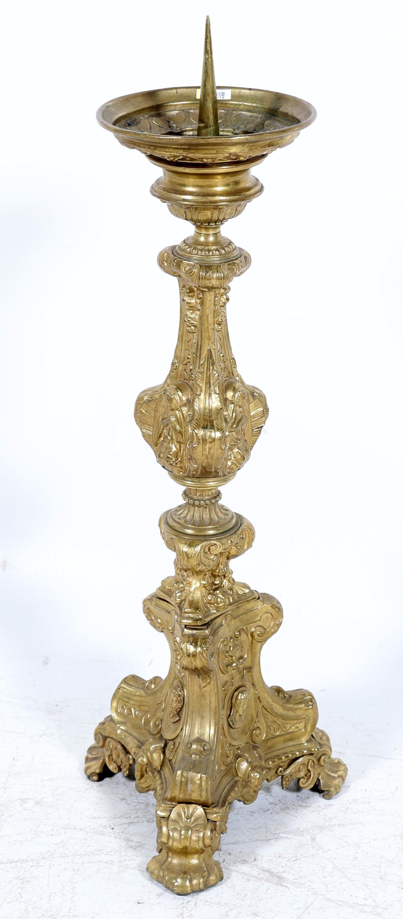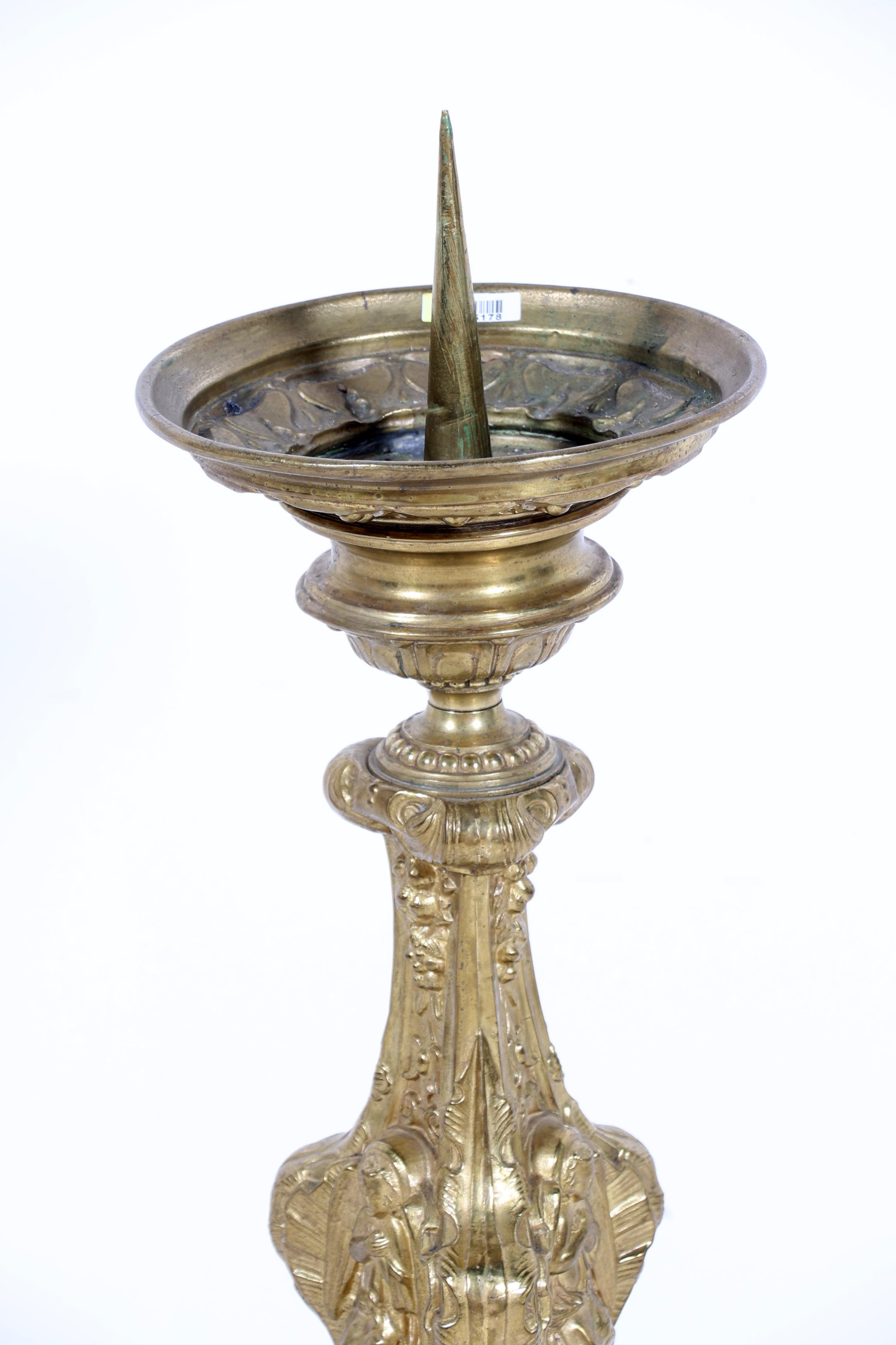 Antieke rijkbewerkte koperen kerkkandelaar, h.82 cm.