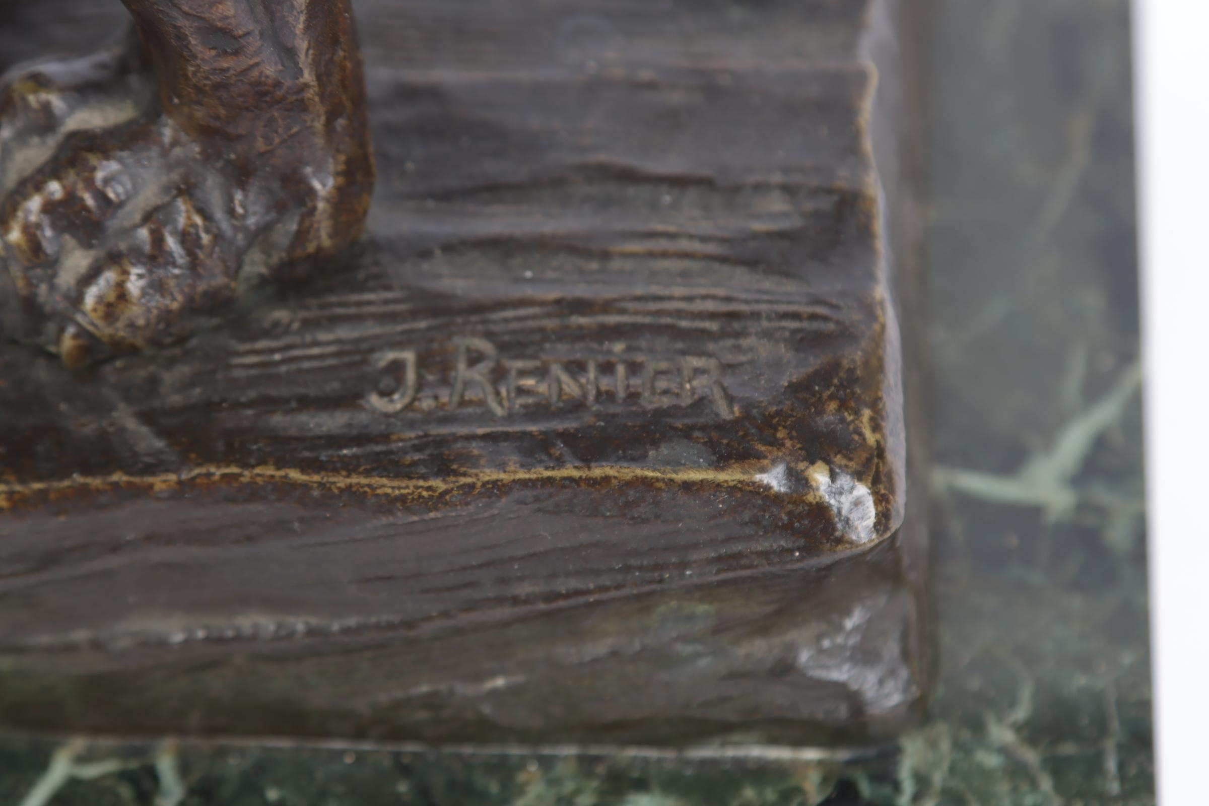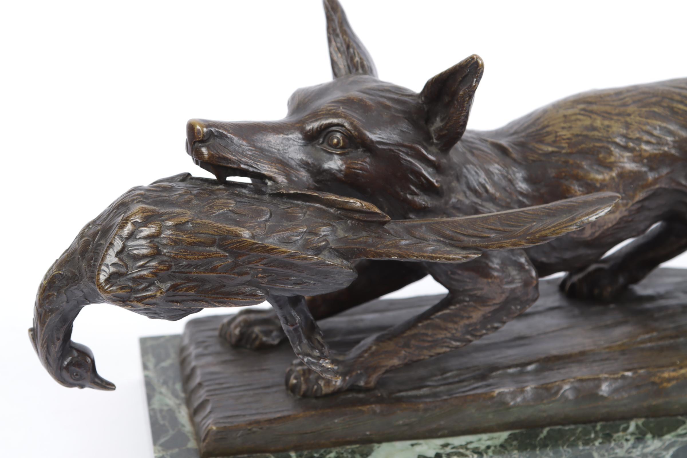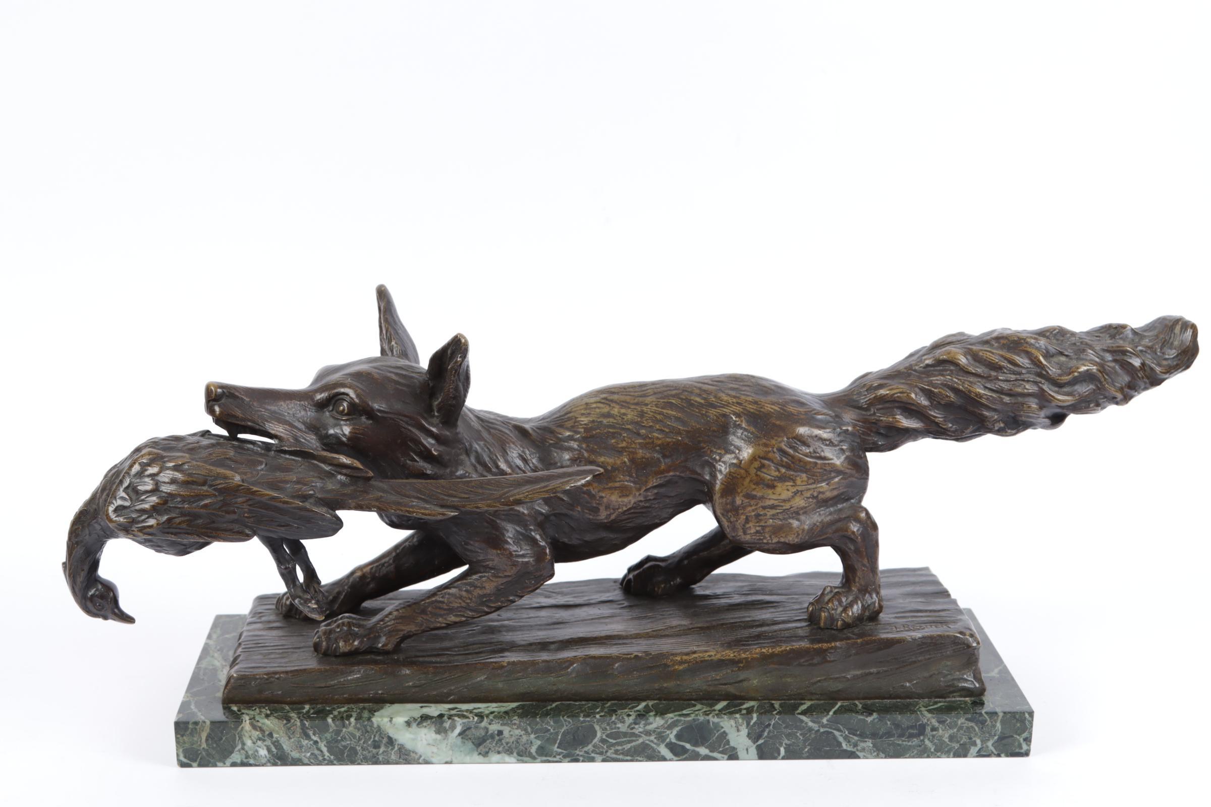 Joseph Emile Renier (1887-1966), Renard Avec sa proie, bronzen sculptuur rustend op marmeren voetstuk, h.27 x b.18 x L.70 cm.