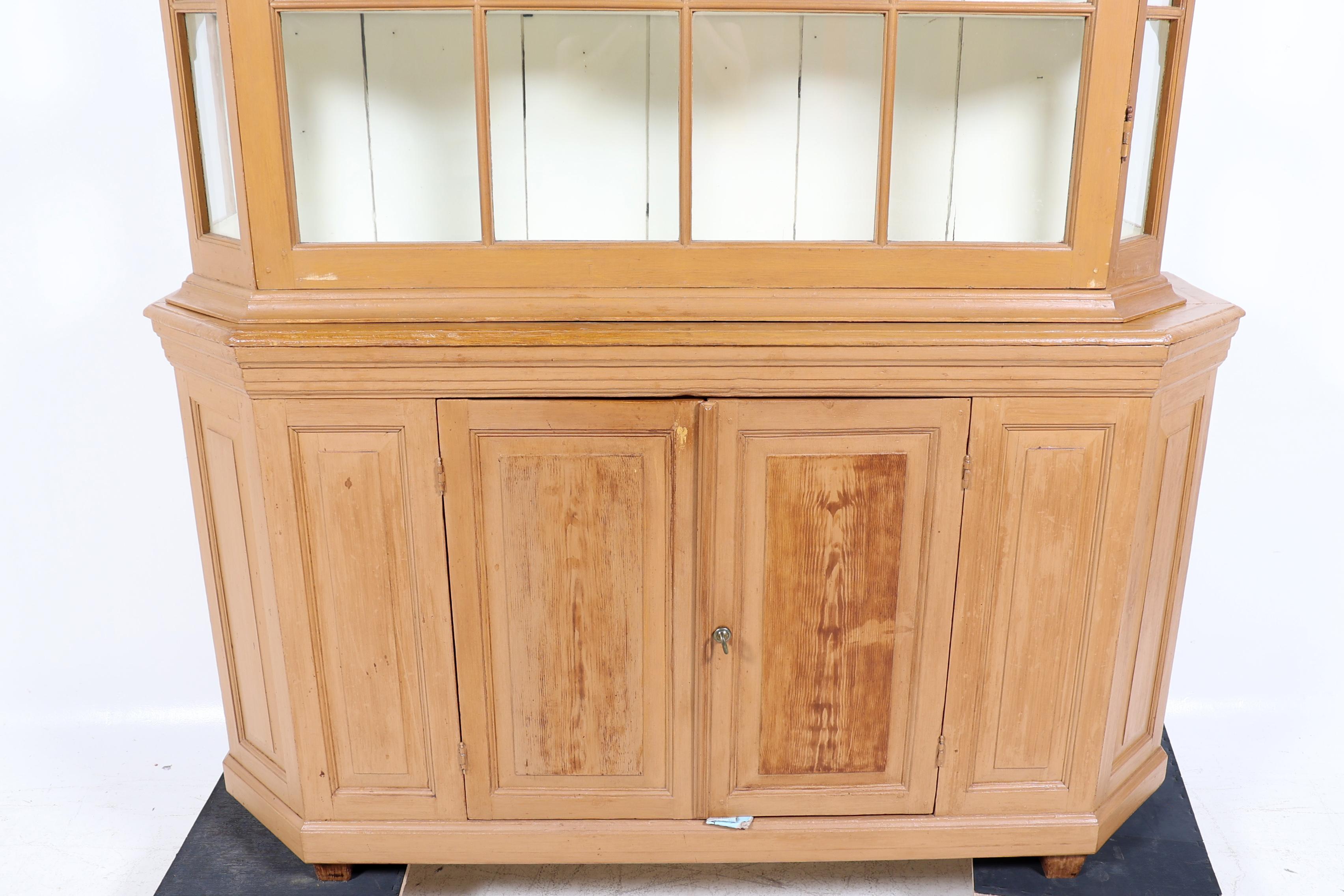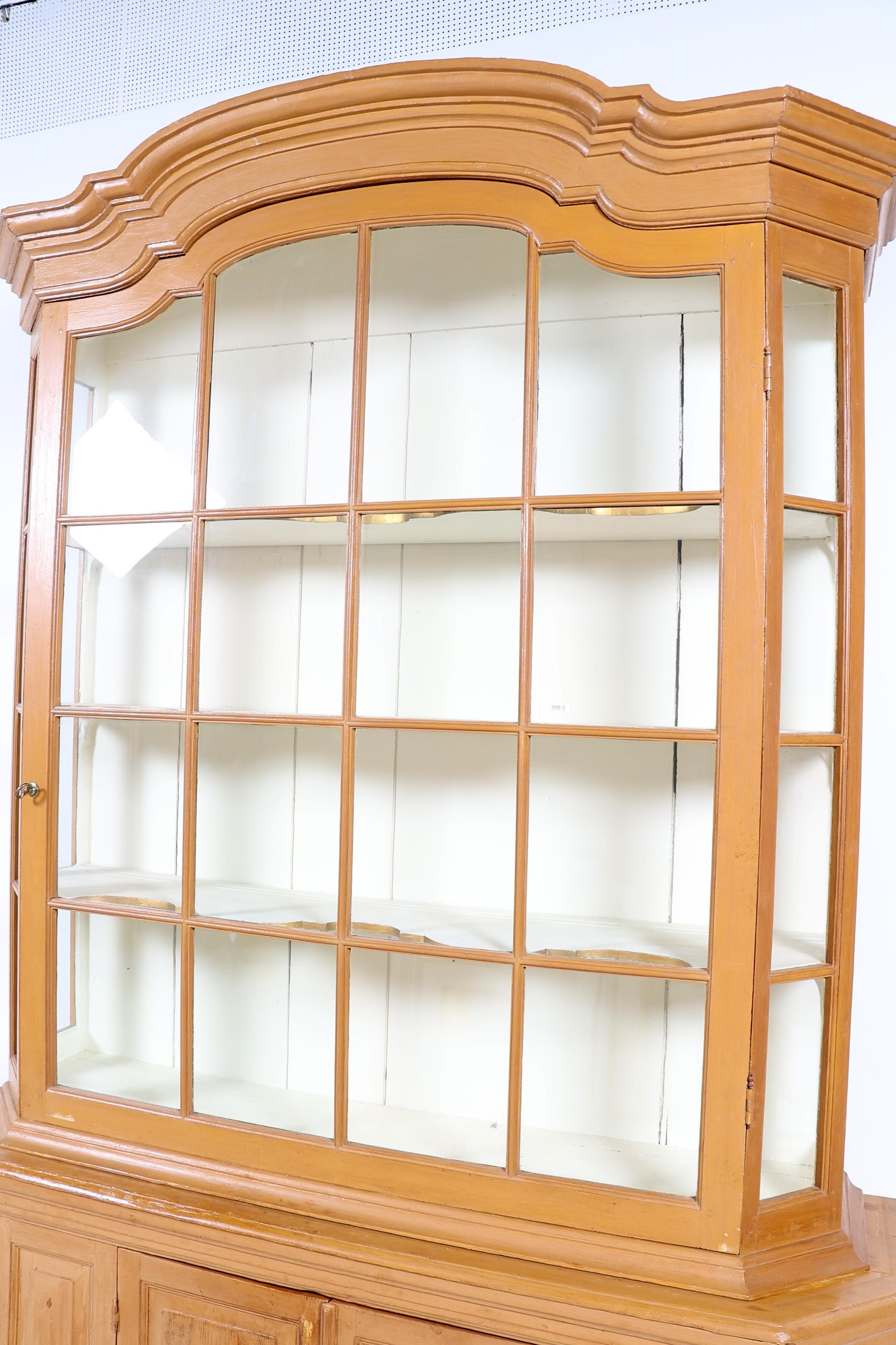Antieke beschilderde vitrinekast met 2 dichte deuren in de onderkast, h.269 x b.175 x d.48 cm.