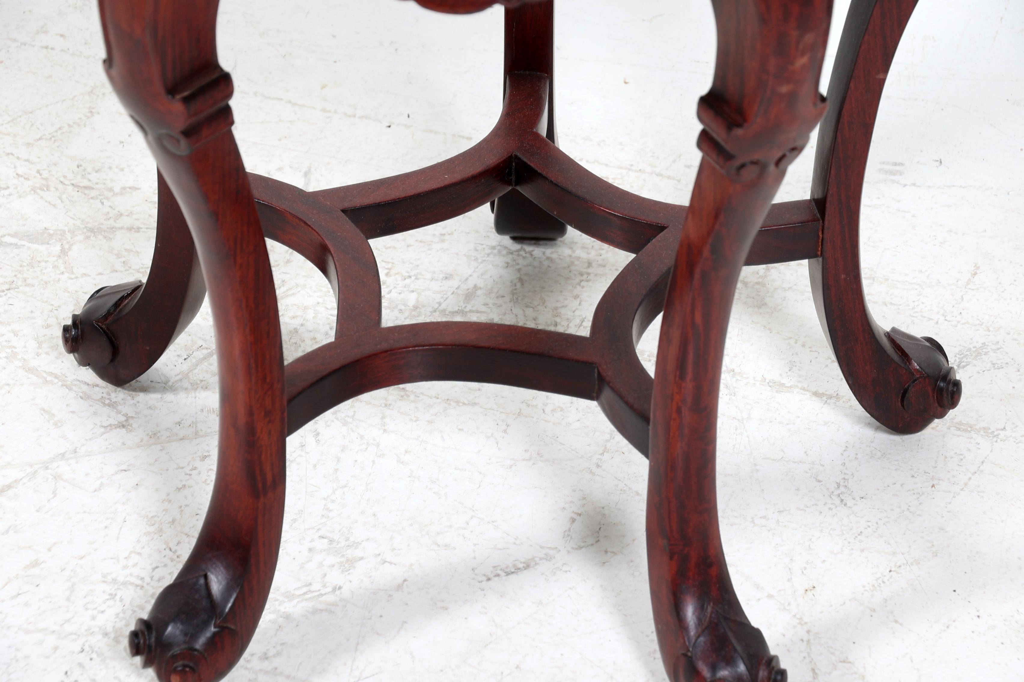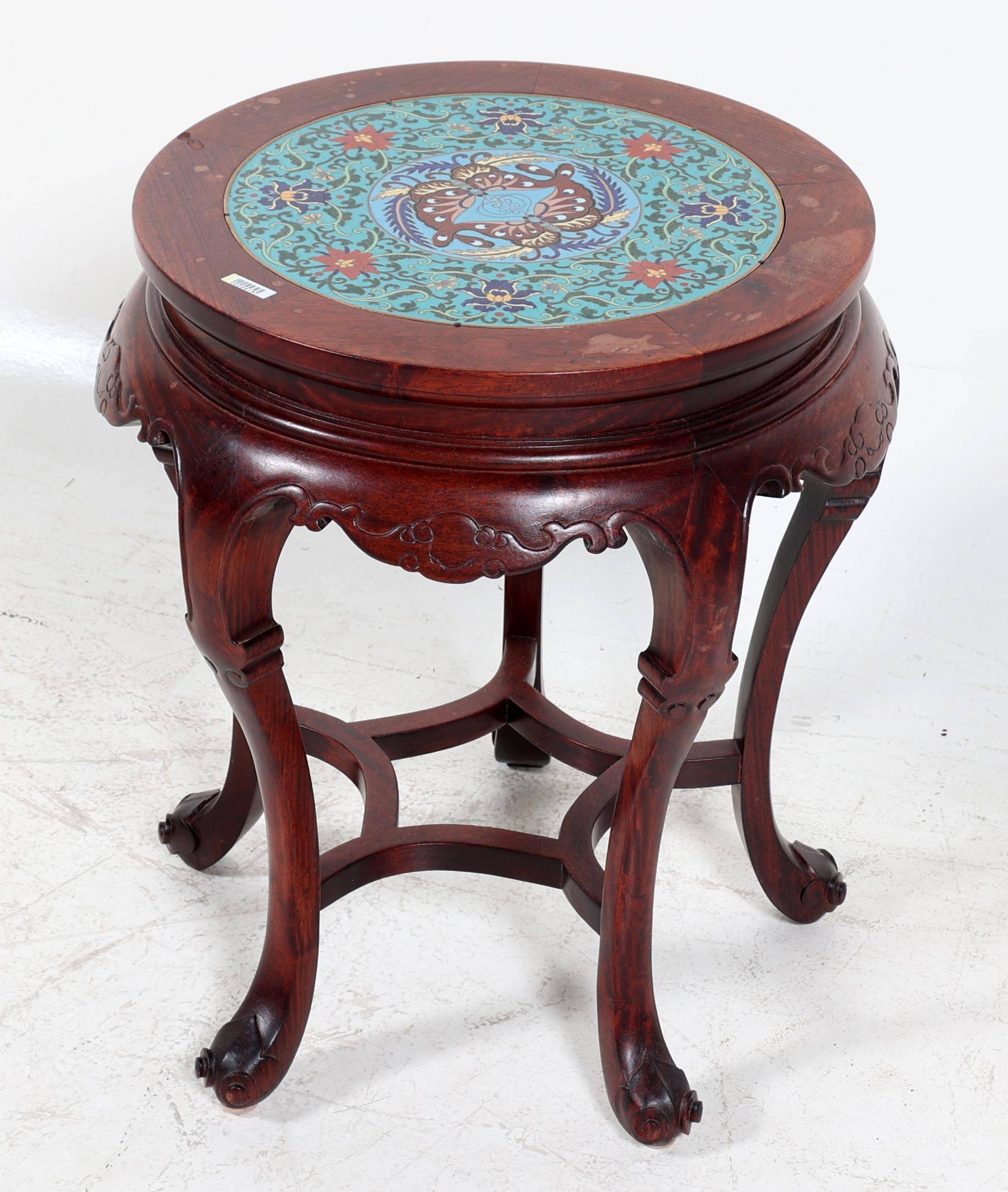Chinese hardhouten bijzettafel met cloisonné blad, h.52 x diam.41 cm.
