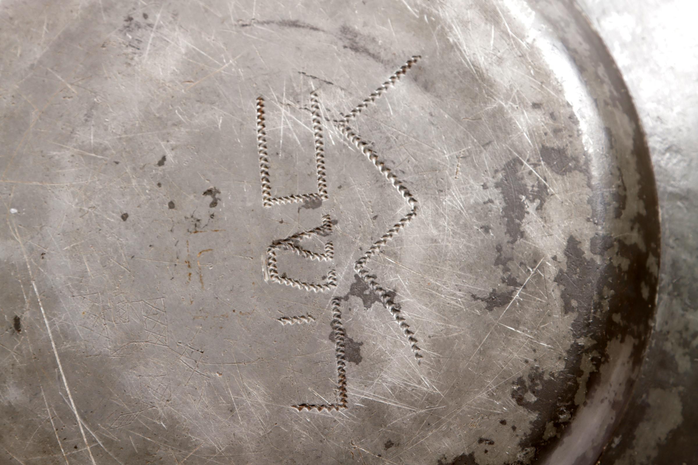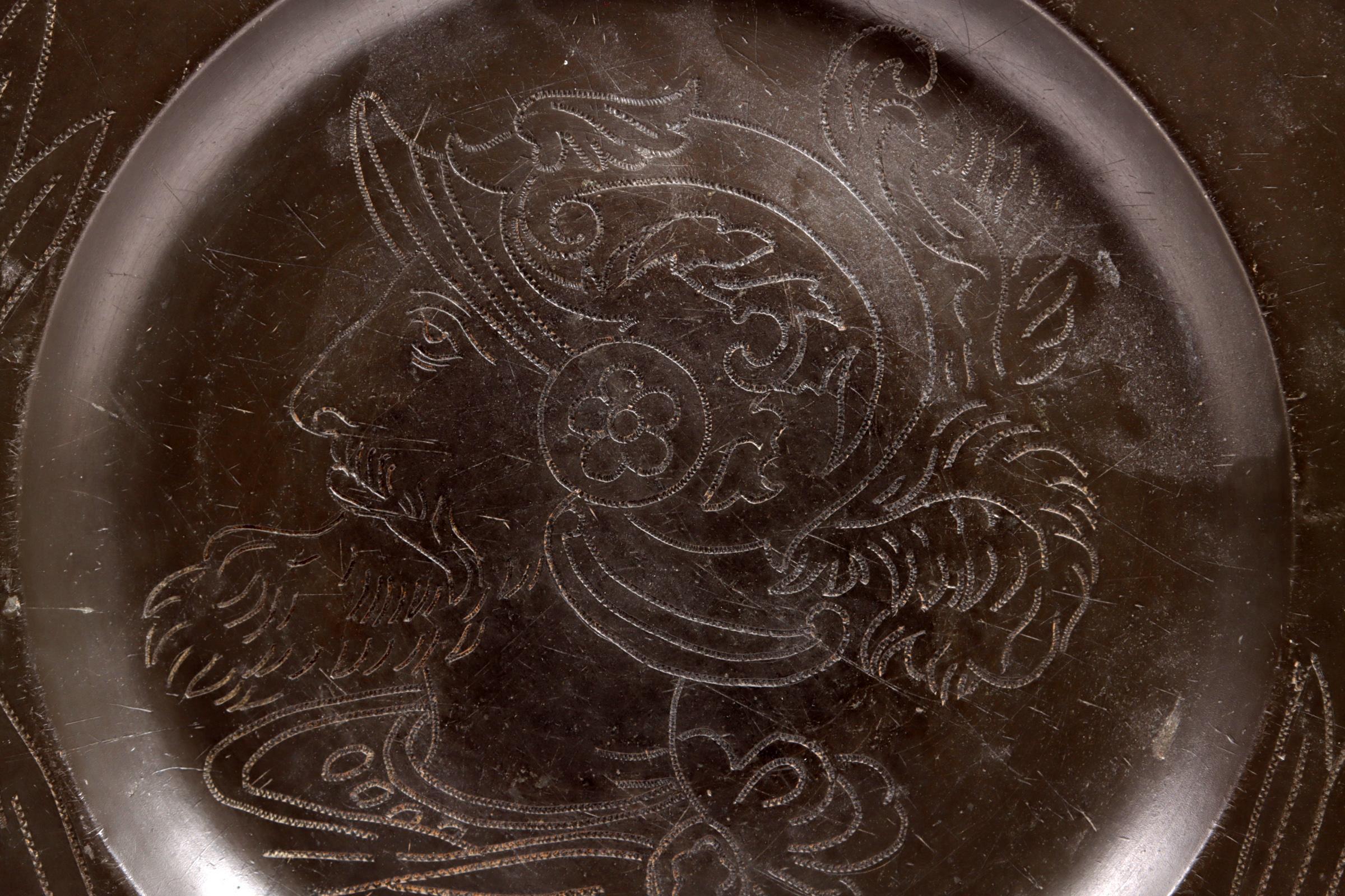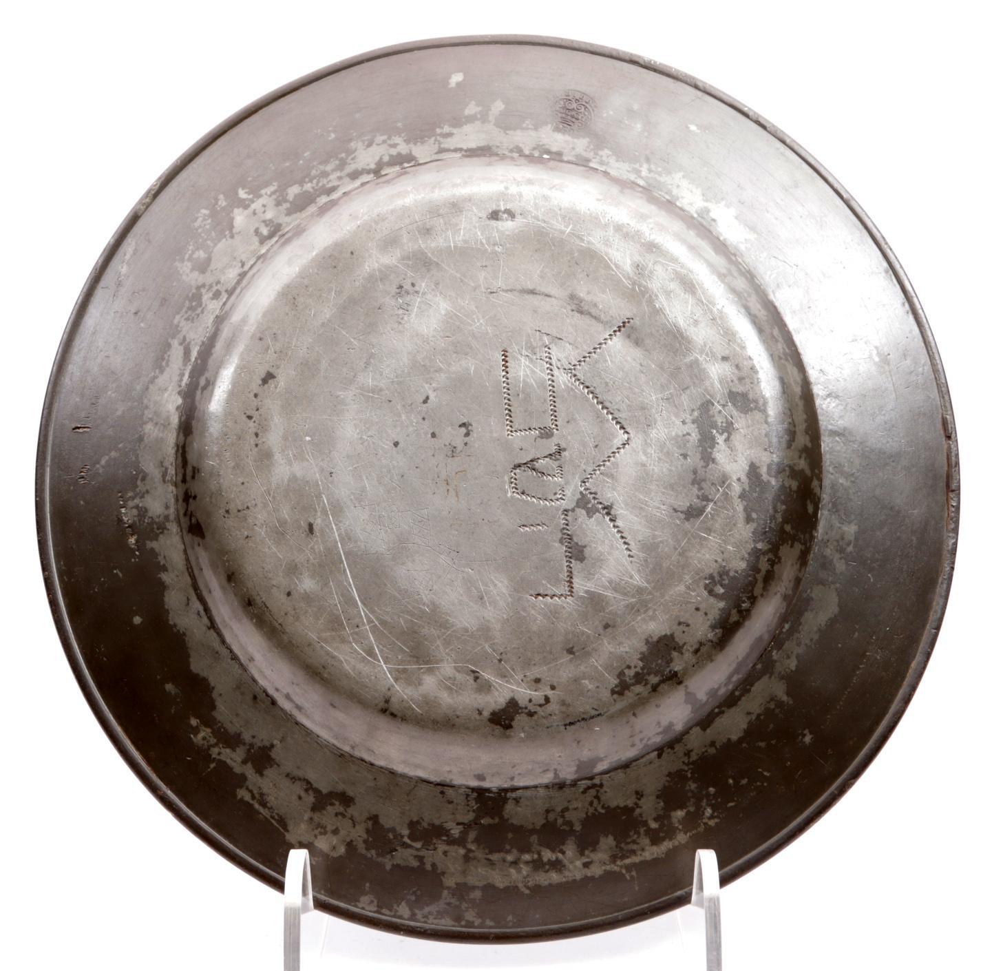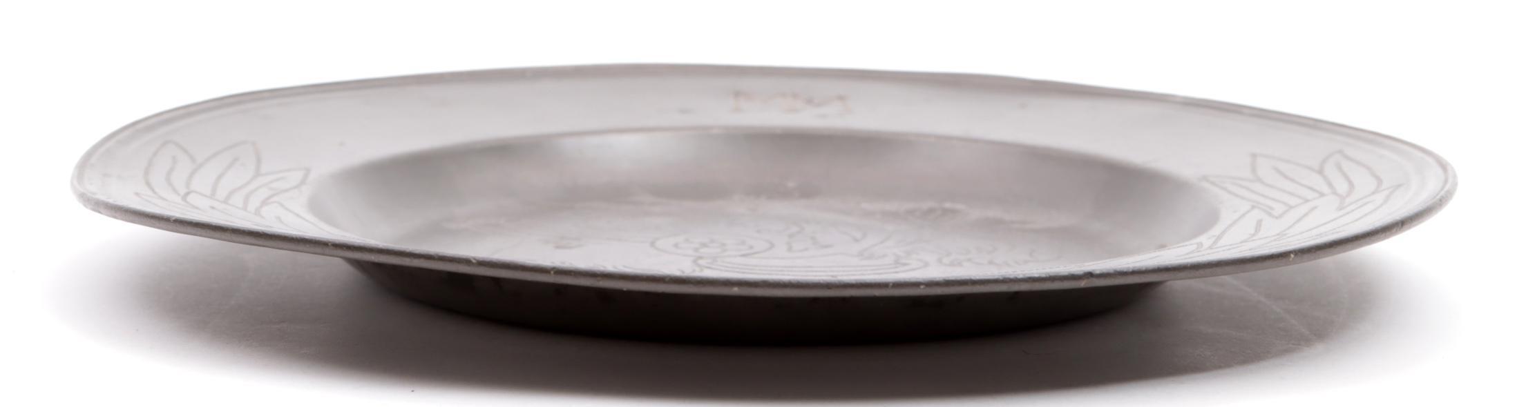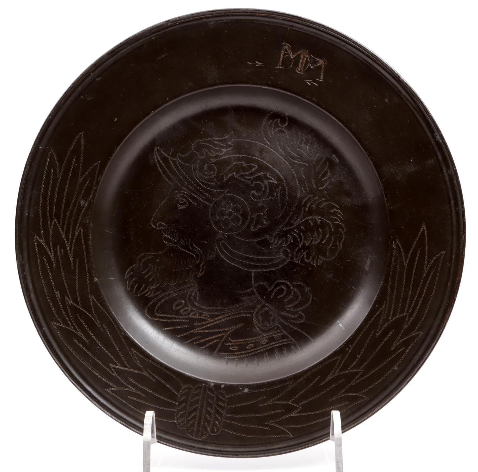 Antieke tinnen schotel met voorstelling van de Griekse God Ajax, Jan Hiddingh, Amsterdam 1665-1707, 17e eeuw, diam.32 cm.