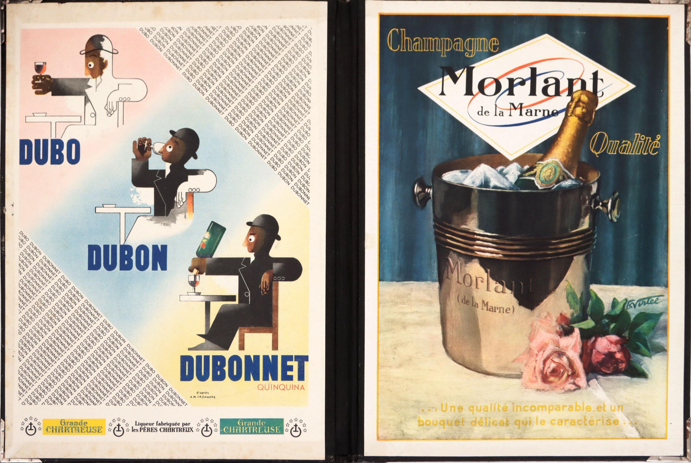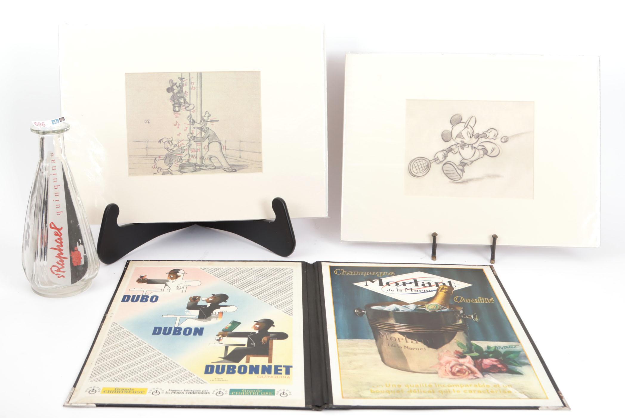 Dubonnet menu-reclame, glazen reclamefles en 2 Disney lithografieën