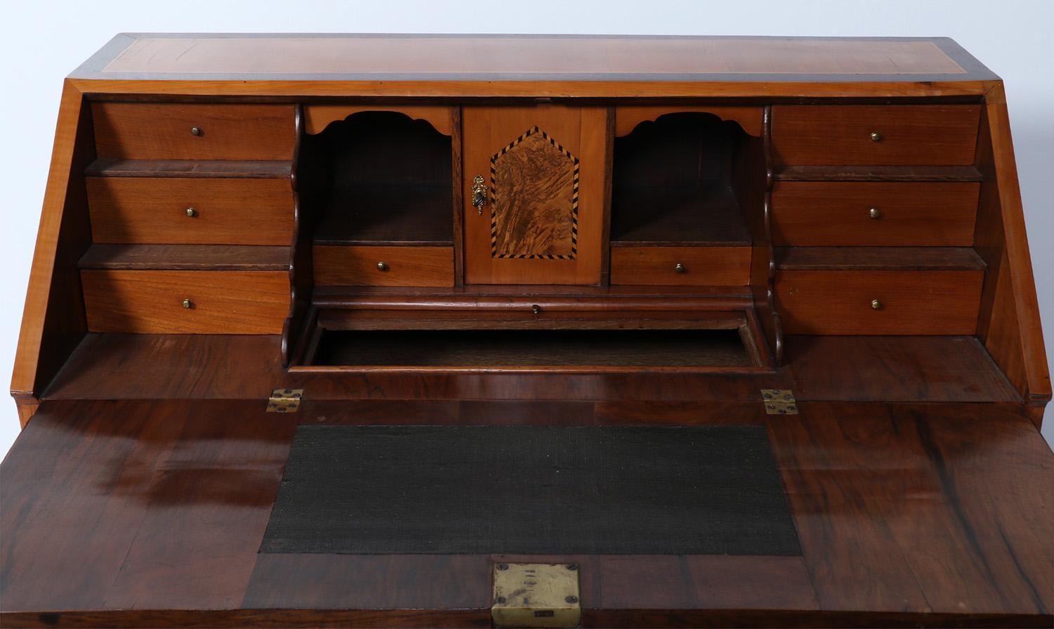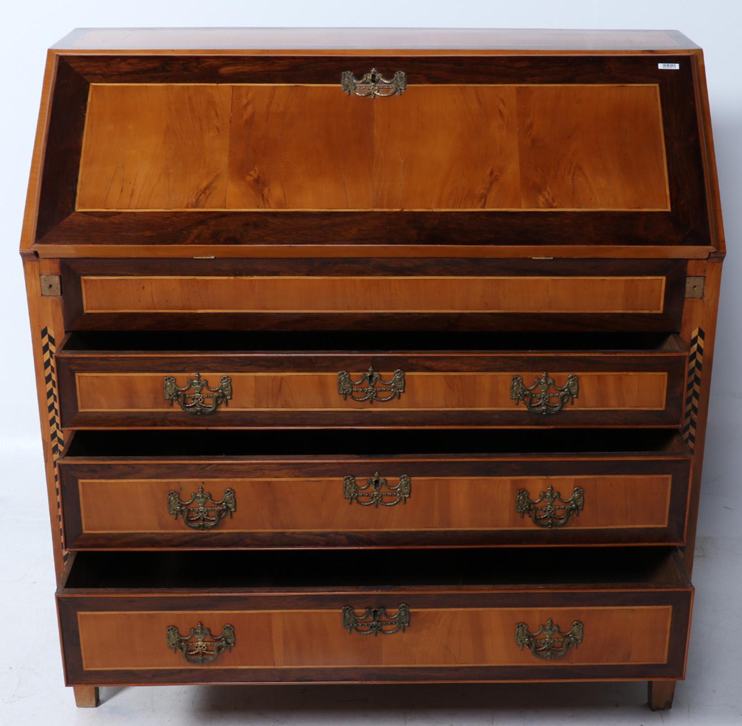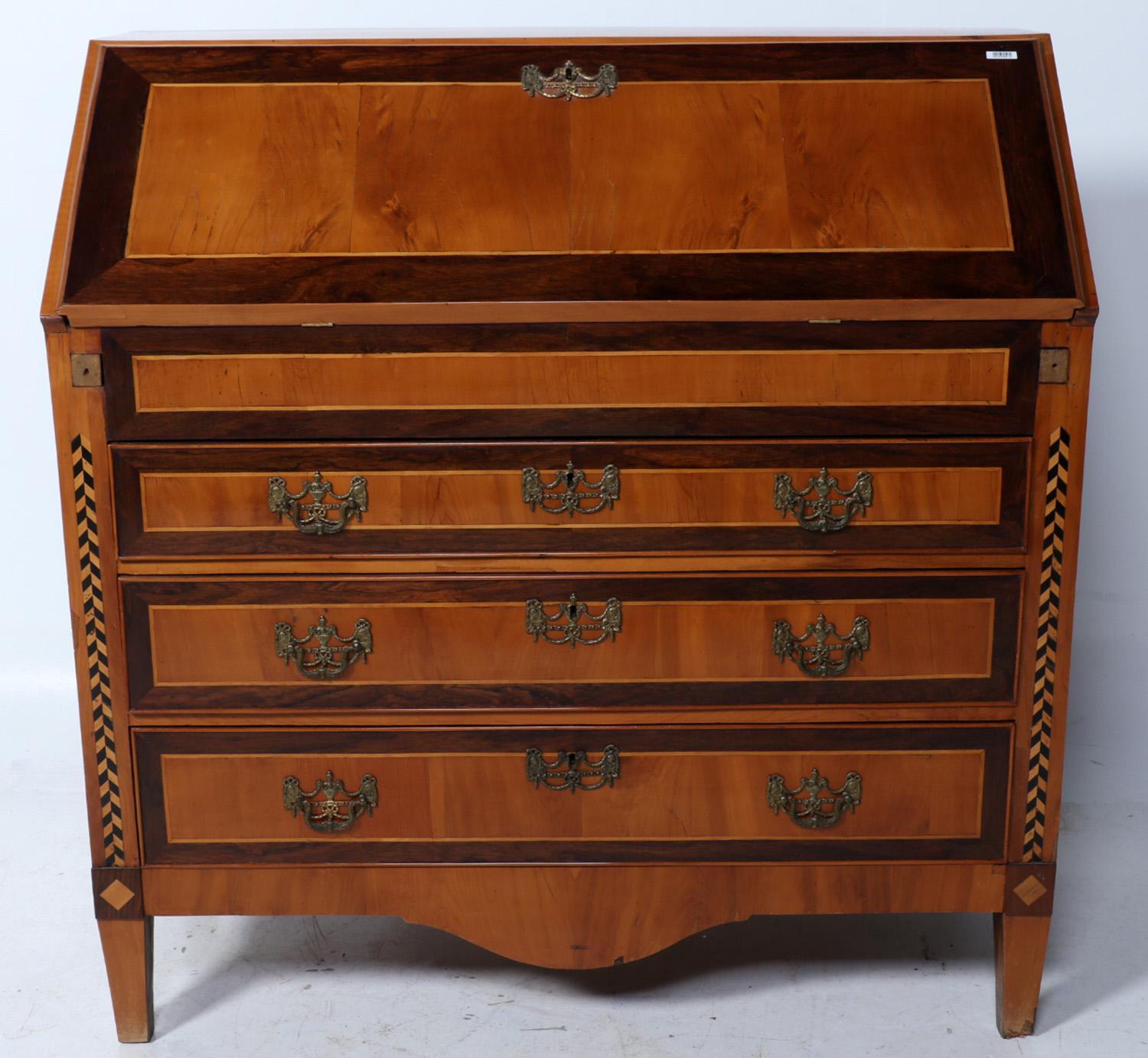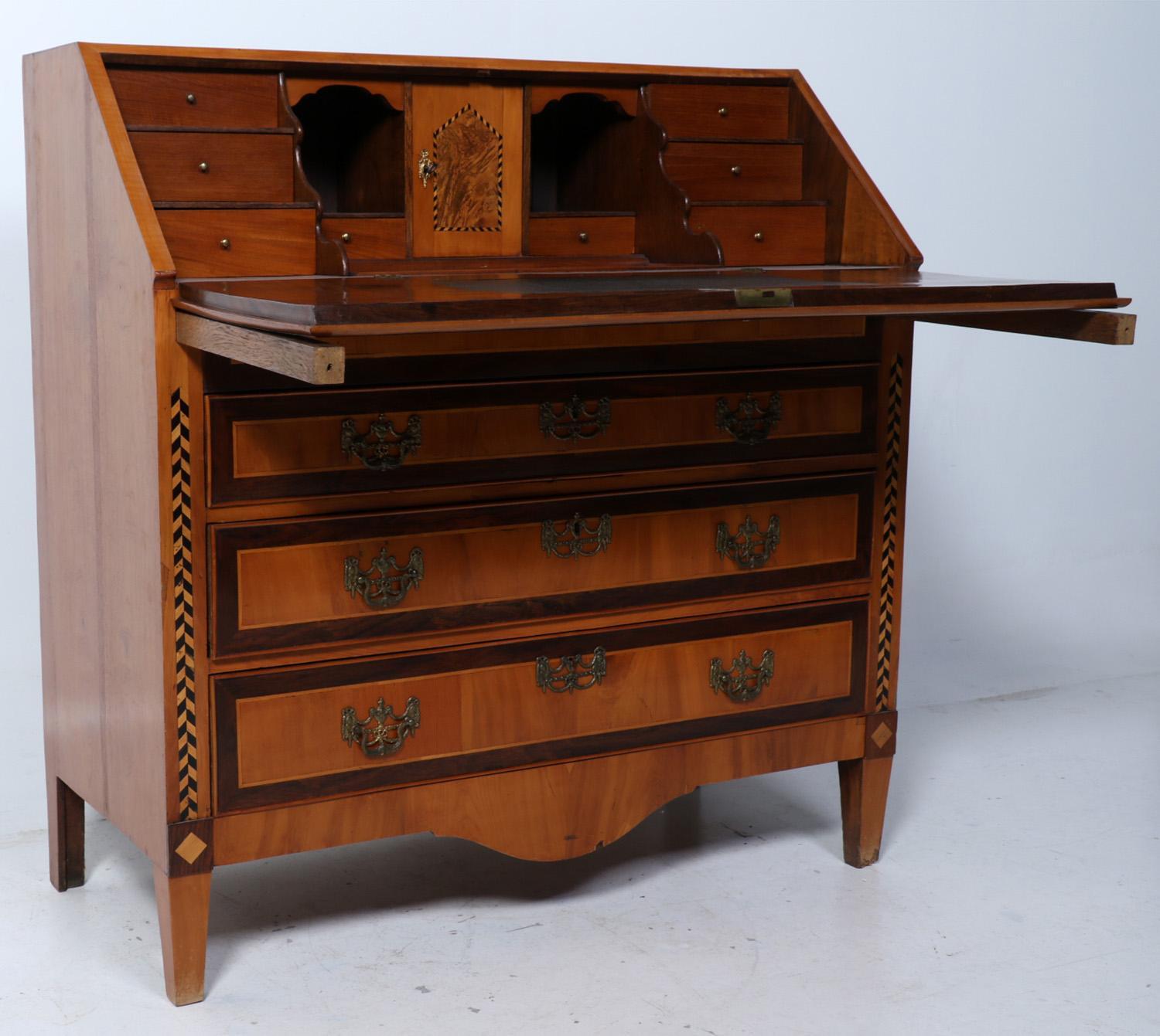 Antieke met bandintarsia in diverse houtsoorten uitgevoerde Duitse secretaire, h.110 x b.106 x d.50 cm.