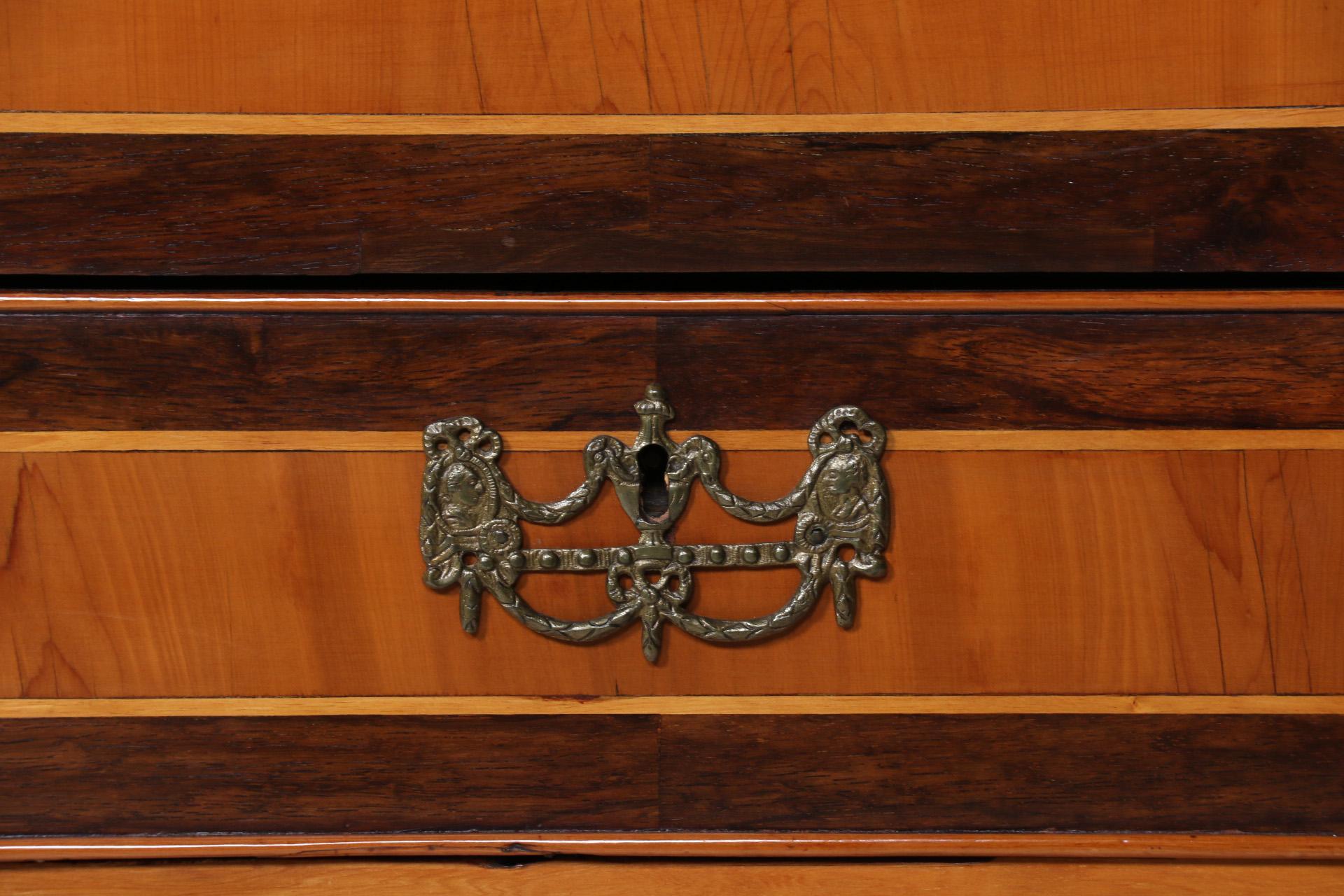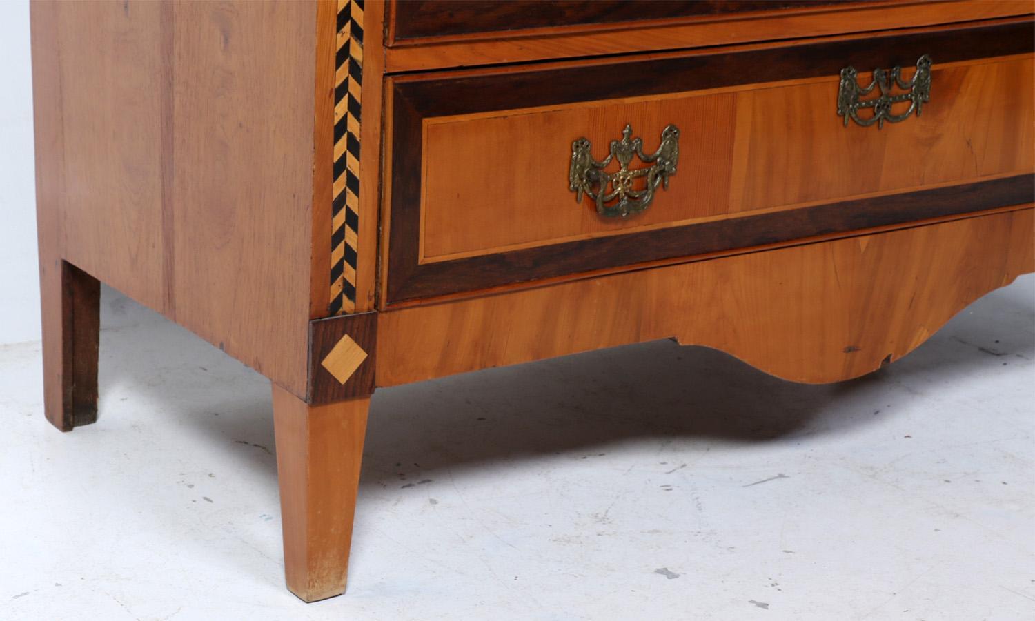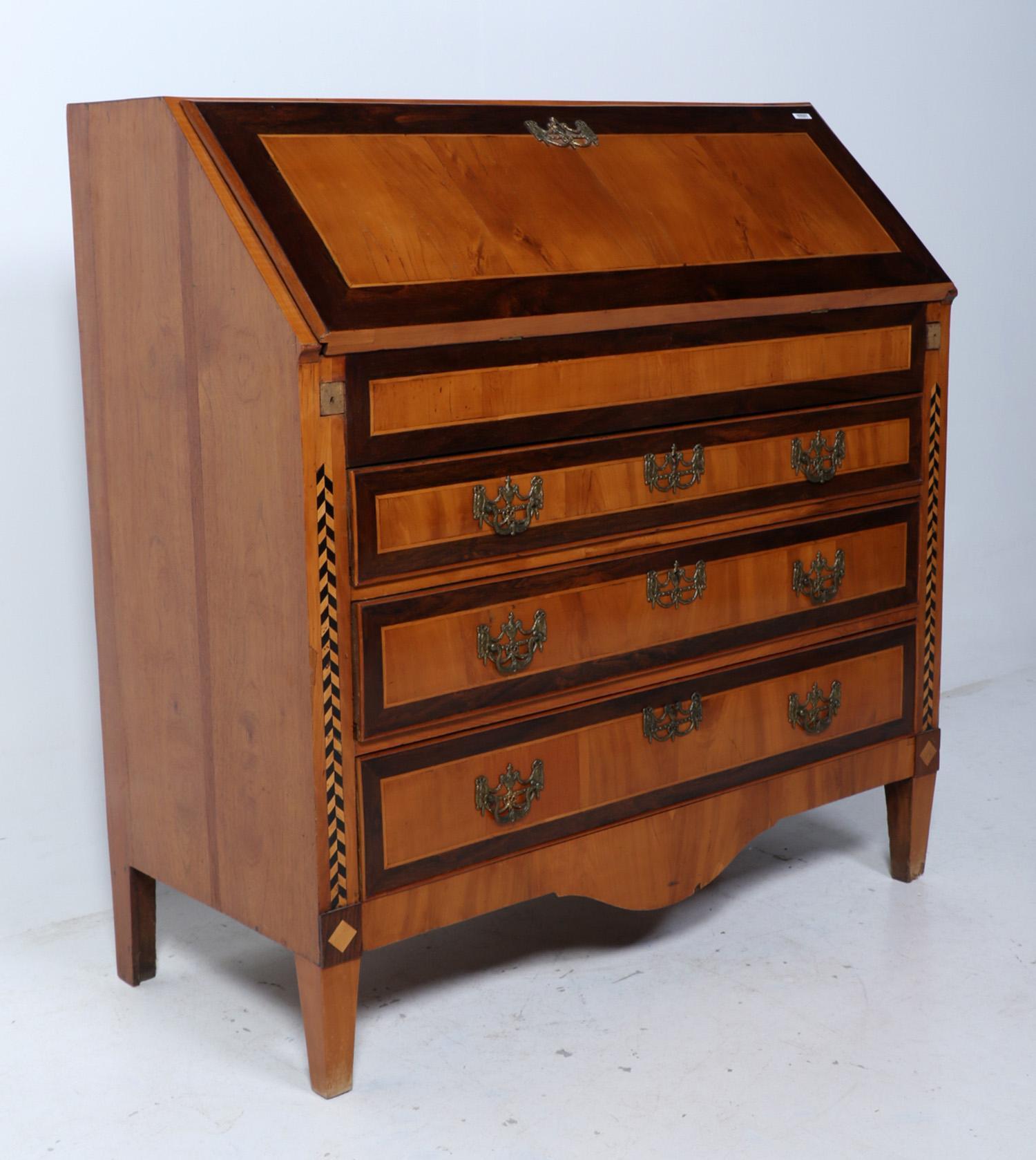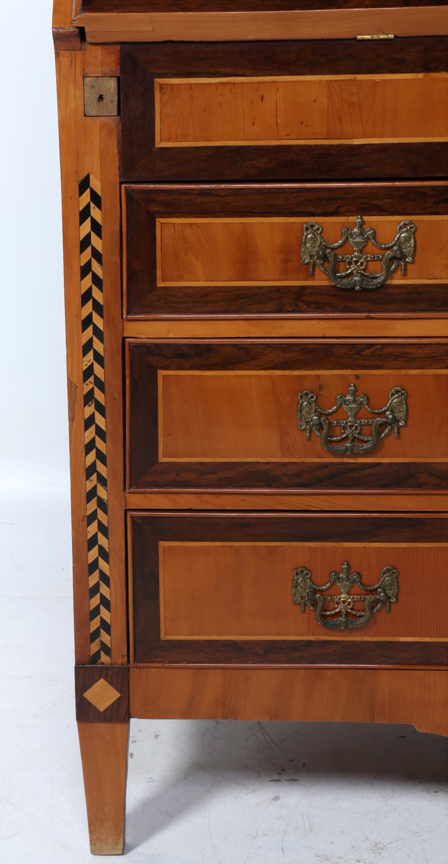 Antieke met bandintarsia in diverse houtsoorten uitgevoerde Duitse secretaire, h.110 x b.106 x d.50 cm.