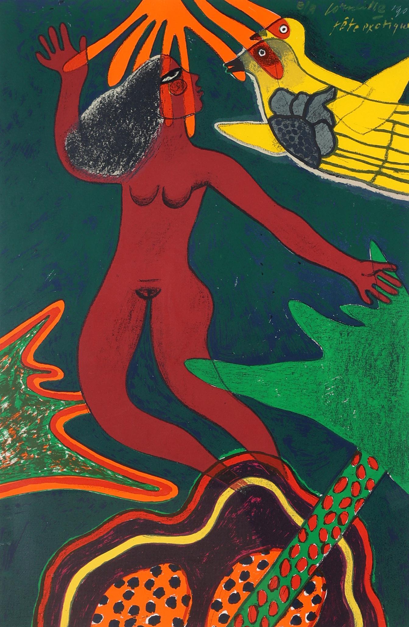 'Corneille', alias van Cornelis Guillaume van Beverloo (1922- 2010), Fête exotique, handgesigneerde zeefdruk, gedateerd 1990 en genummerd E/A, 69 x 45 cm. of 102 x 78 cm. (inclusief lijst). Provenance: collectie Kunsthandel Elisabeth den Bieman de Haas, Amsterdam