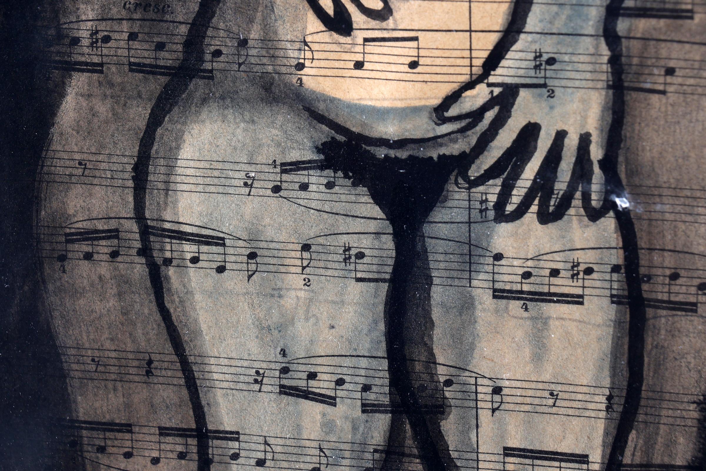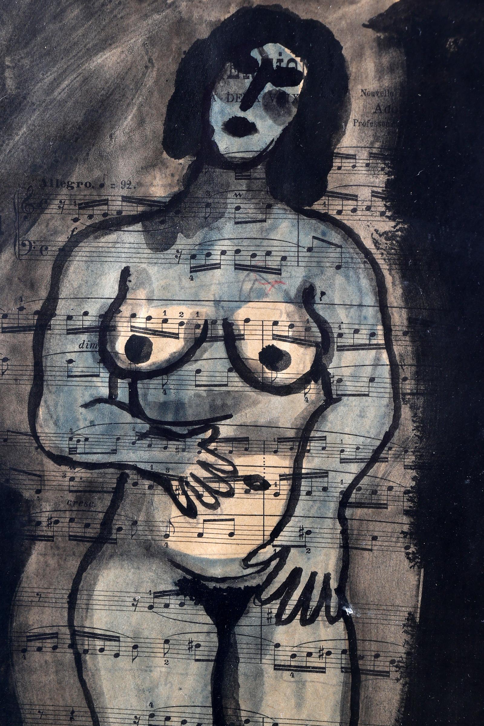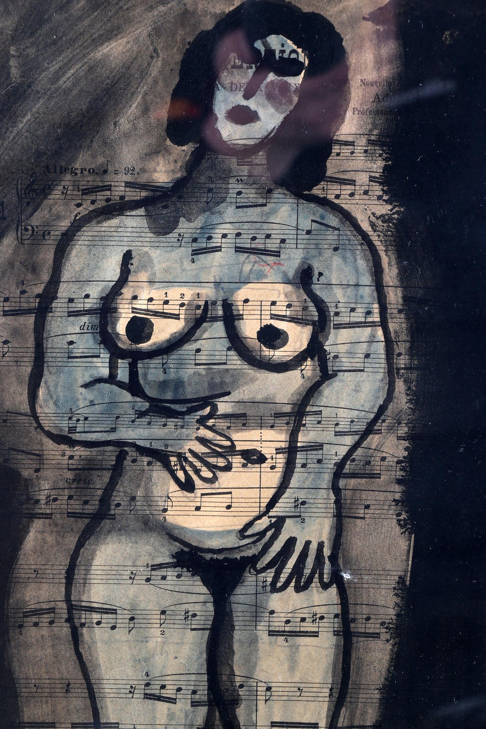 'Corneille', alias van Cornelis Guillaume van Beverloo (1922- 2010), Nu Hollandais (2004), gemengde techniek op oude partituren, gesigneerd en gedateerd, 31 x 23,5 cm. Provenance: collectie Kunsthandel Elisabeth den Bieman de Haas, Amsterdam. Tentoonstelling: Museum Jan van der Togt, Amstelveen 2015/2016