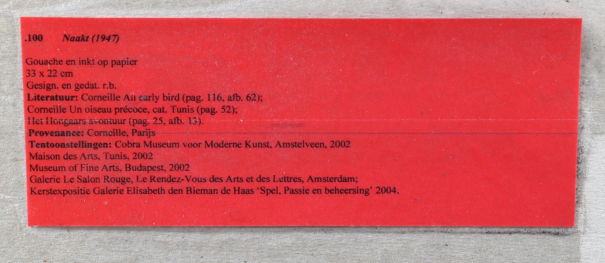 'Corneille', alias van Cornelis Guillaume van Beverloo (1922- 2010), Naakt (1947), gouache en inkt op papier, gesigneerd en gedateerd, 33 x 22 cm. Provenance: collectie Kunsthandel Elisabeth den Bieman de Haas, Amsterdam. Tentoonstelling: Cobra Museum voor Moderne Kunst, Amstelveen, 2002; Maison des Arts, Tunis, 2002; Museum of Fine Arts, Budapest, 2002; Galerie Le Salon Rouge, Le Rendez-Vous des Arts et des Lettres, Amsterdam; Kerstexpositie Galerie Elisabeth den Bieman de Haas 'Spel, Passie en beheersing', 2004