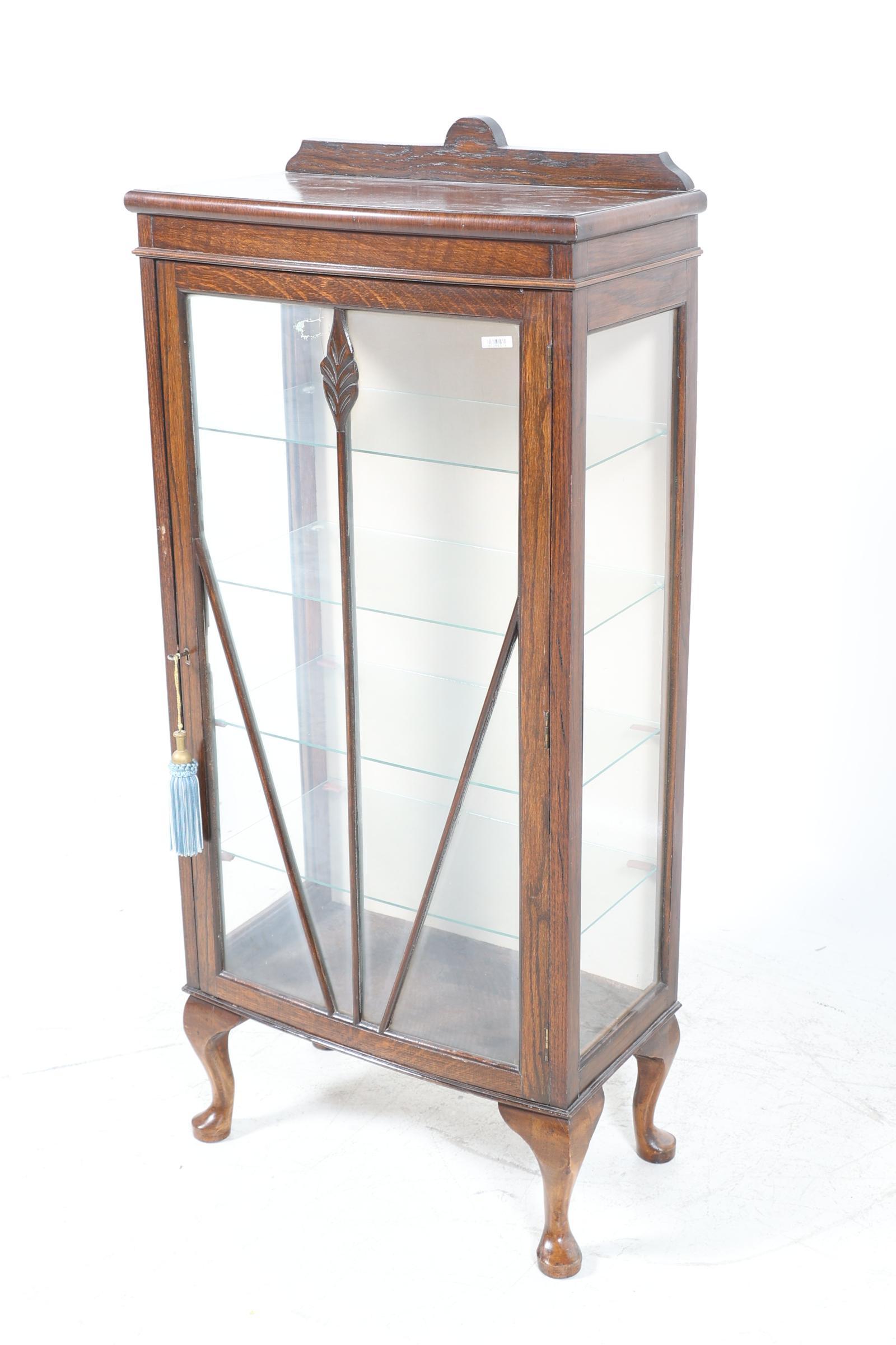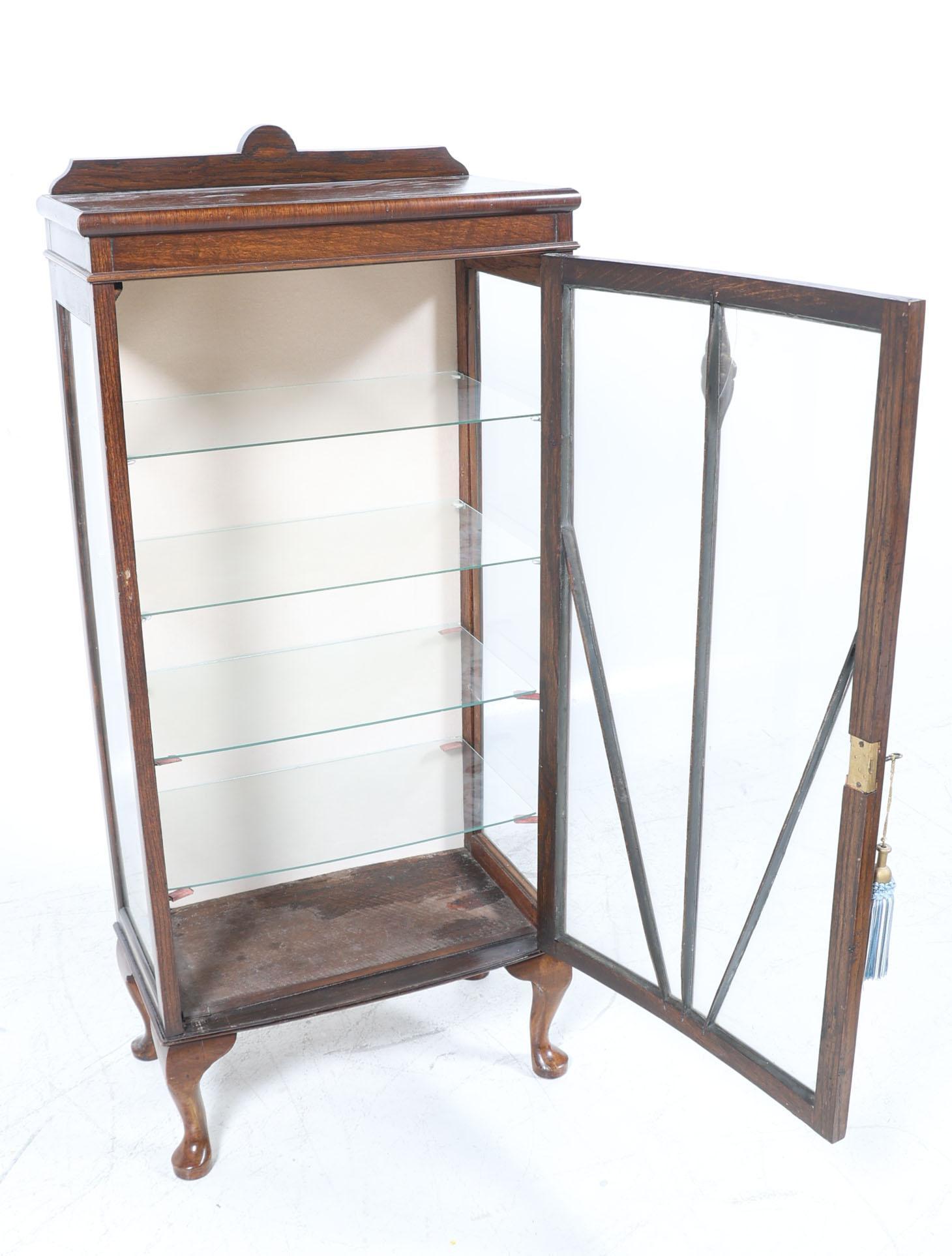Eikenhouten 1-deurs vitrinekast rustend op cabriole poten, h.120 x b.54 x d.28 cm. (barstje in ruit)