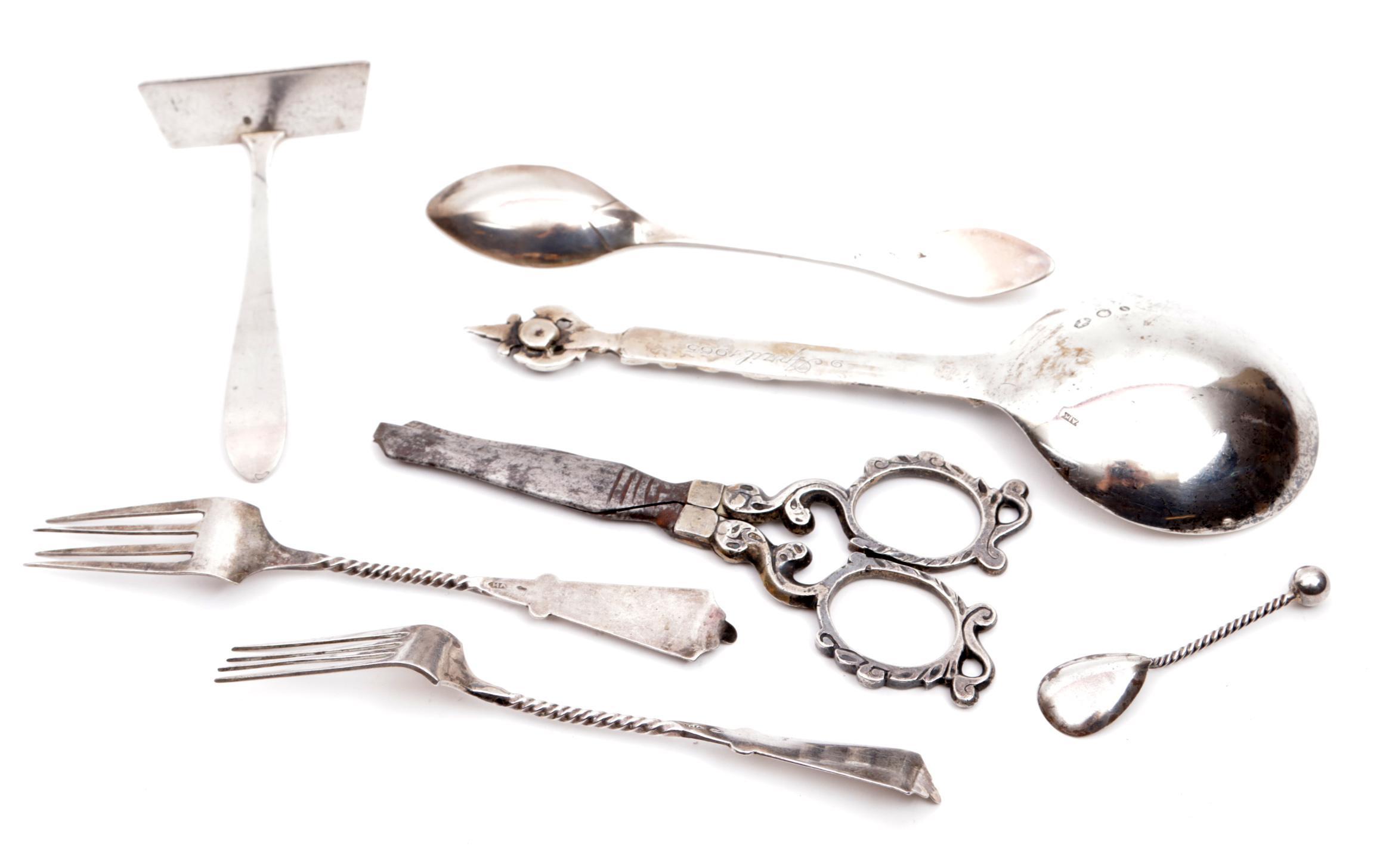 Koopje divers zilver van botermes, vorken, geboortelepel, schaar en zoutlepeltje, 165 gram