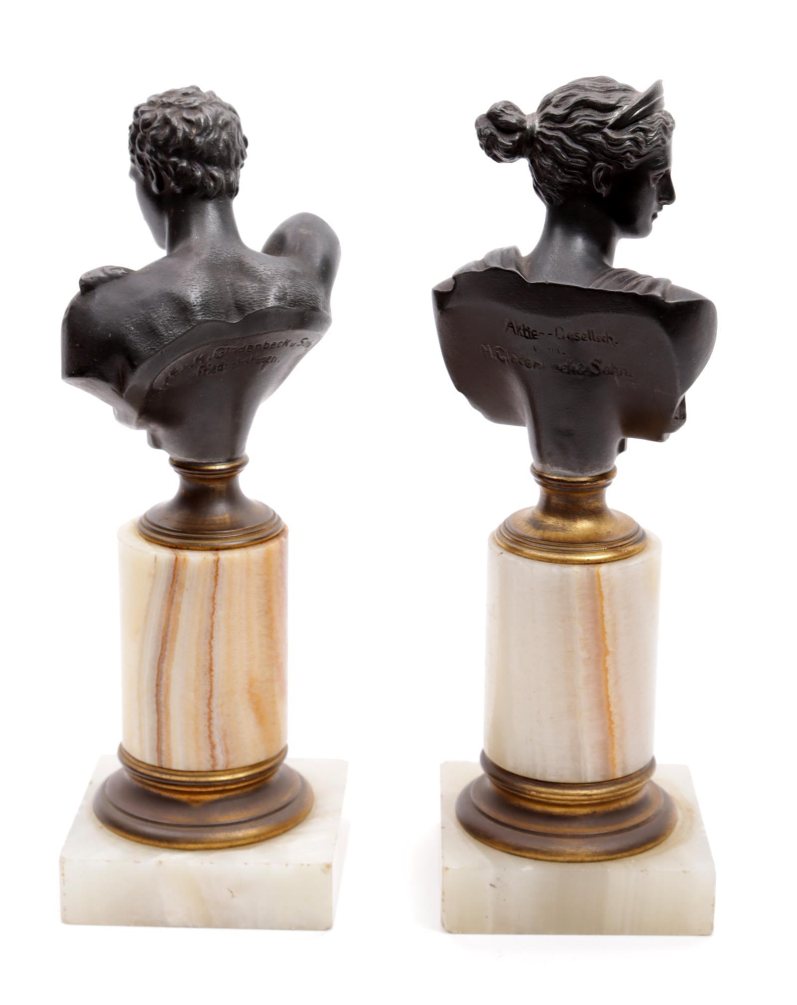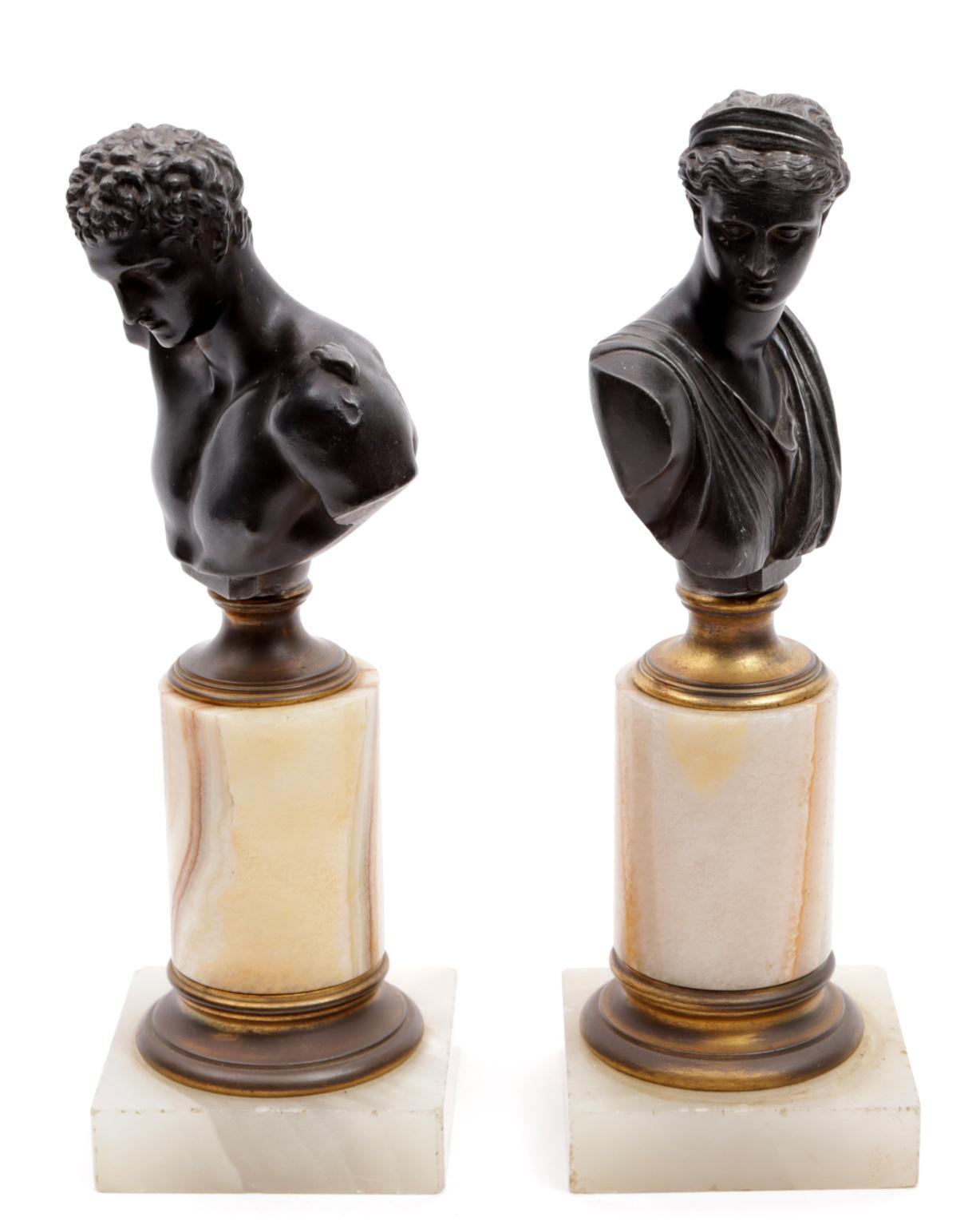 2 Beeldjes van Hermes en Diana, rustend op albasten voetstuk, h.22 cm.