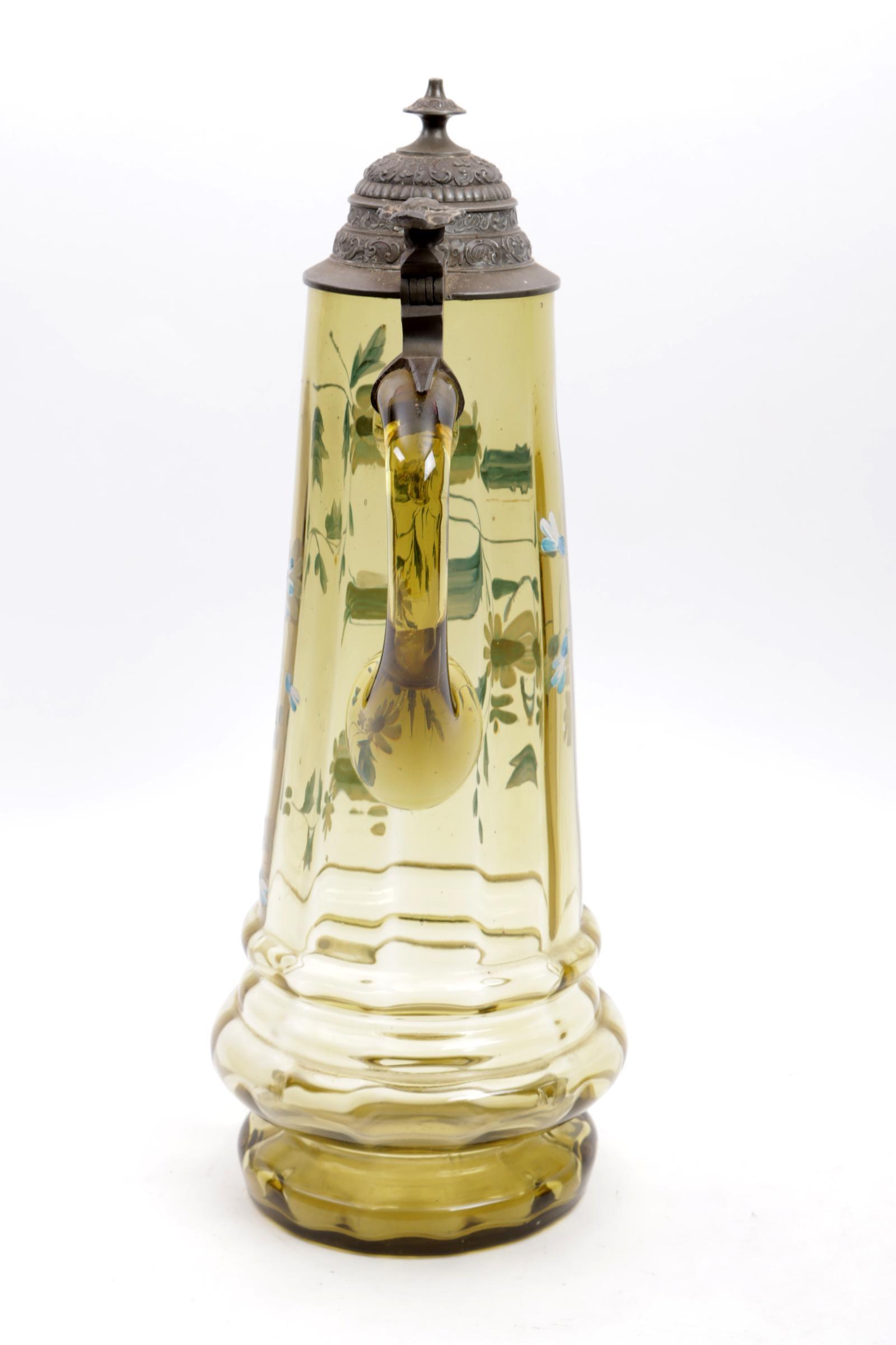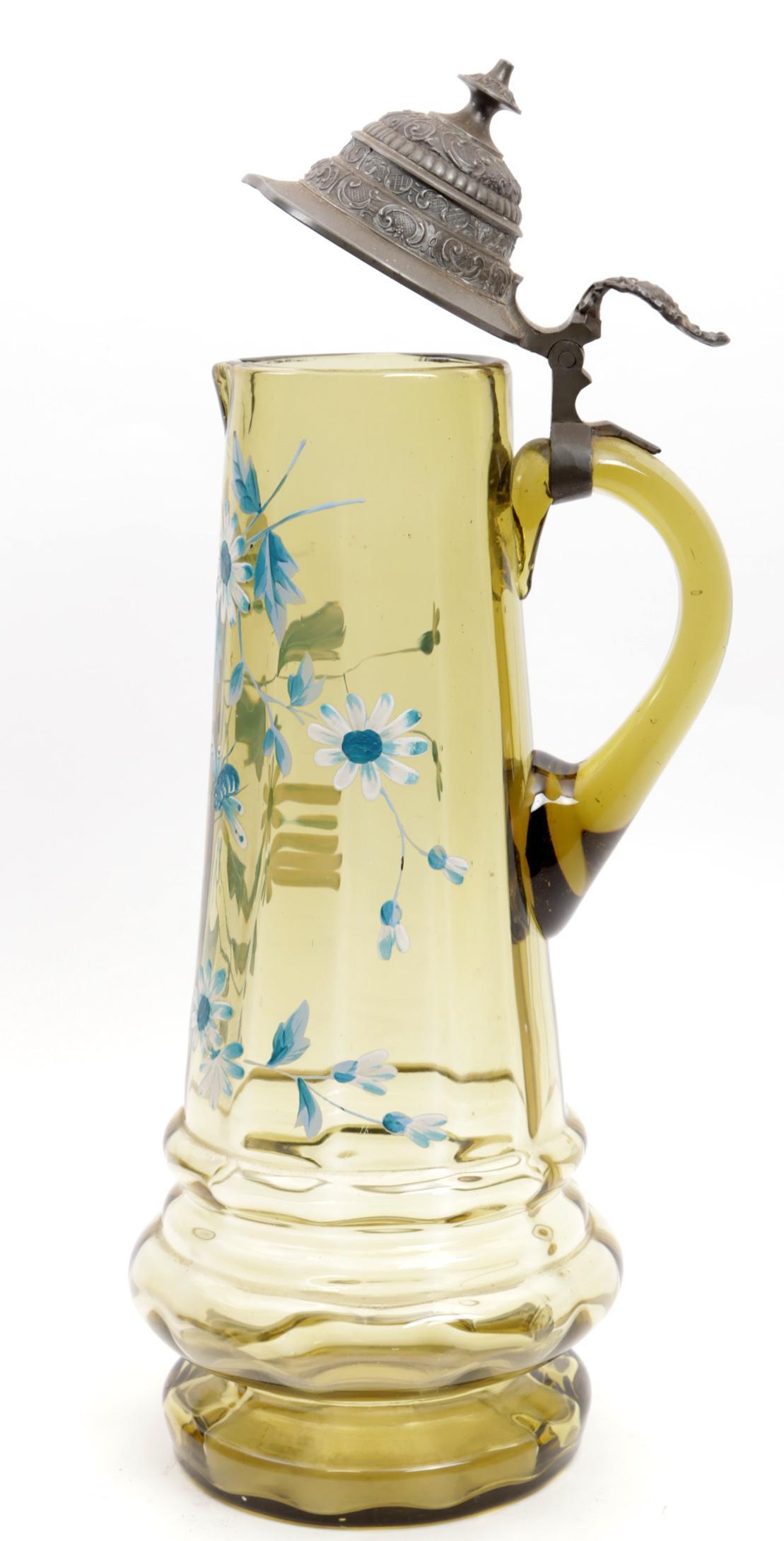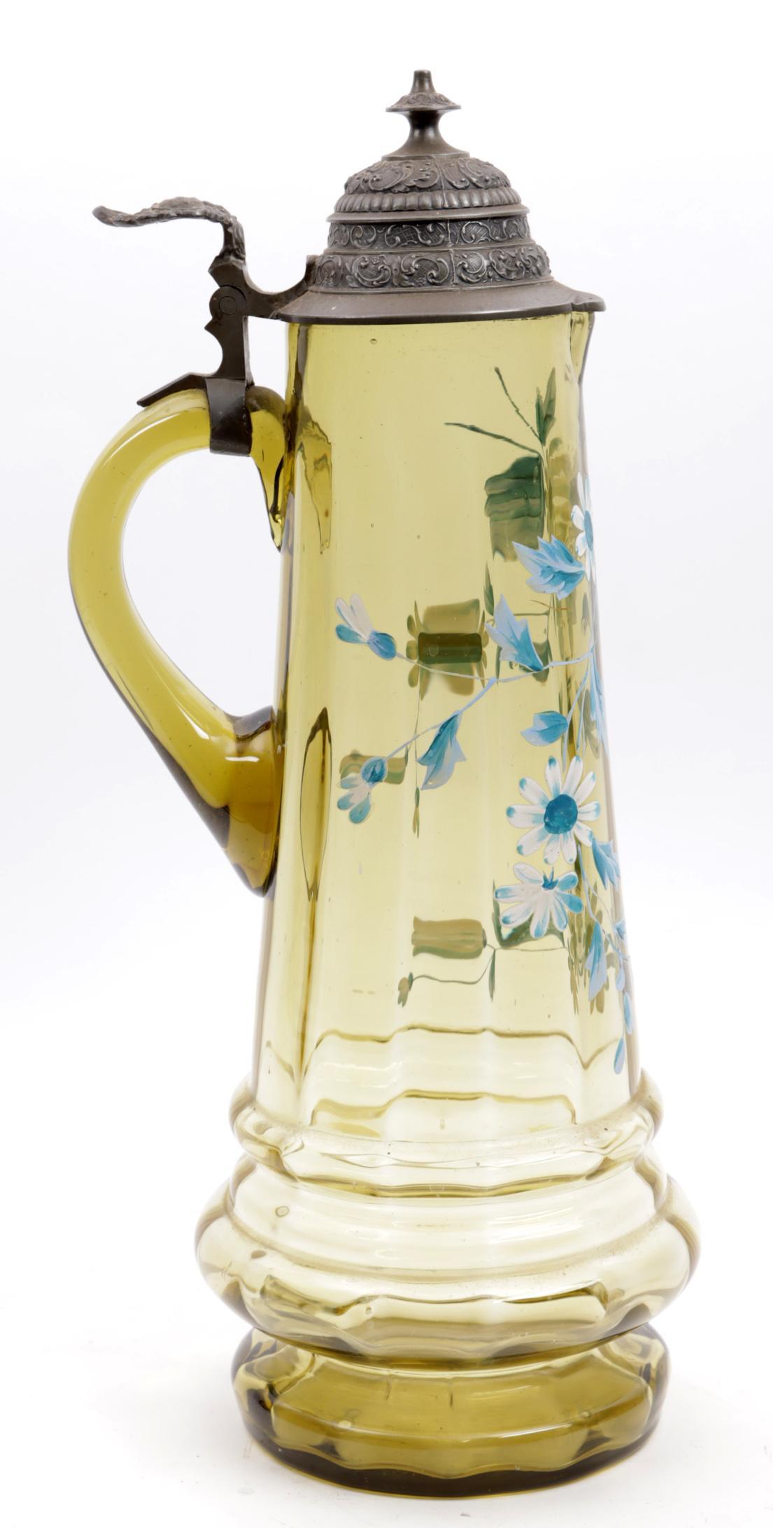Glazen met bloemen gedecoreerde klepkan met tinnen deksel, 19e eeuw, h.41 cm.