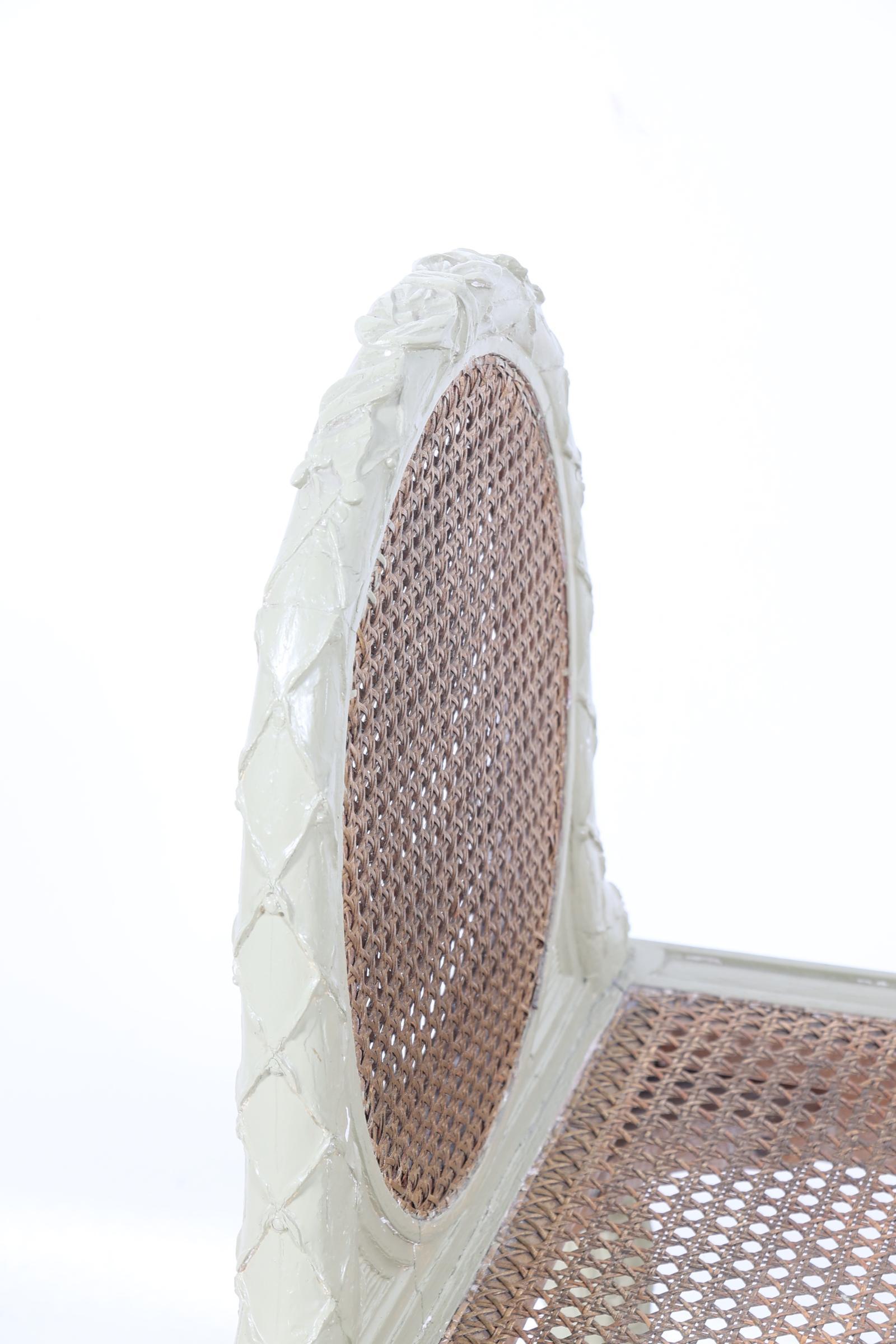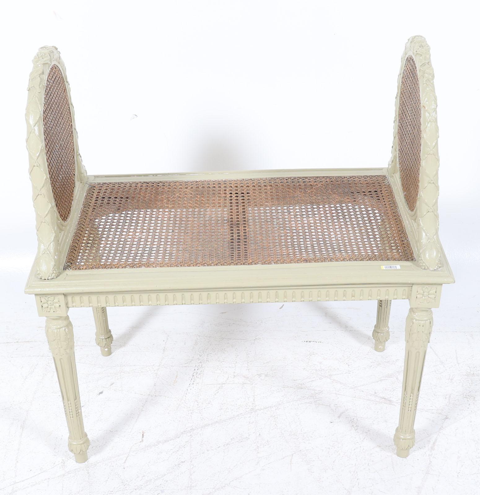 Oud groen gelakt bedbankje met webbing zitting, Louis Seize stijl