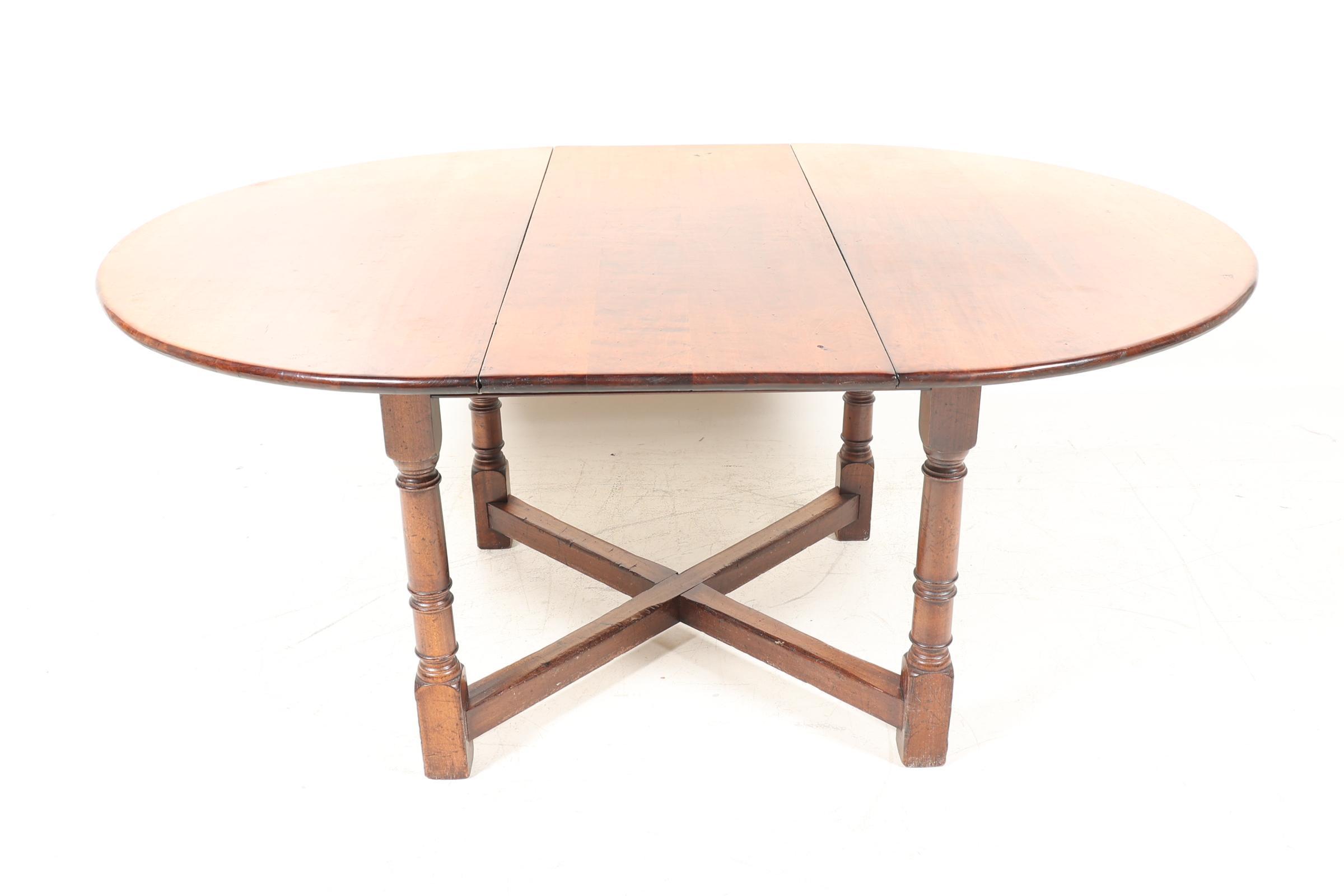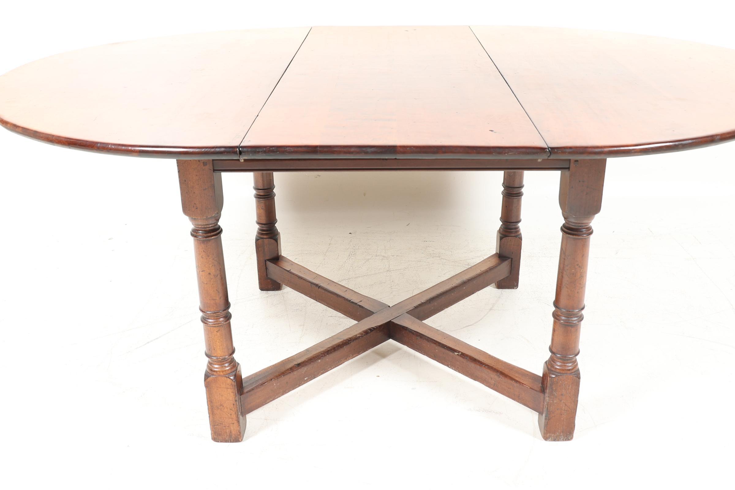 Uitschuifbare notenhouten tafel met tussenblad, h.77 x diam.129 cm.