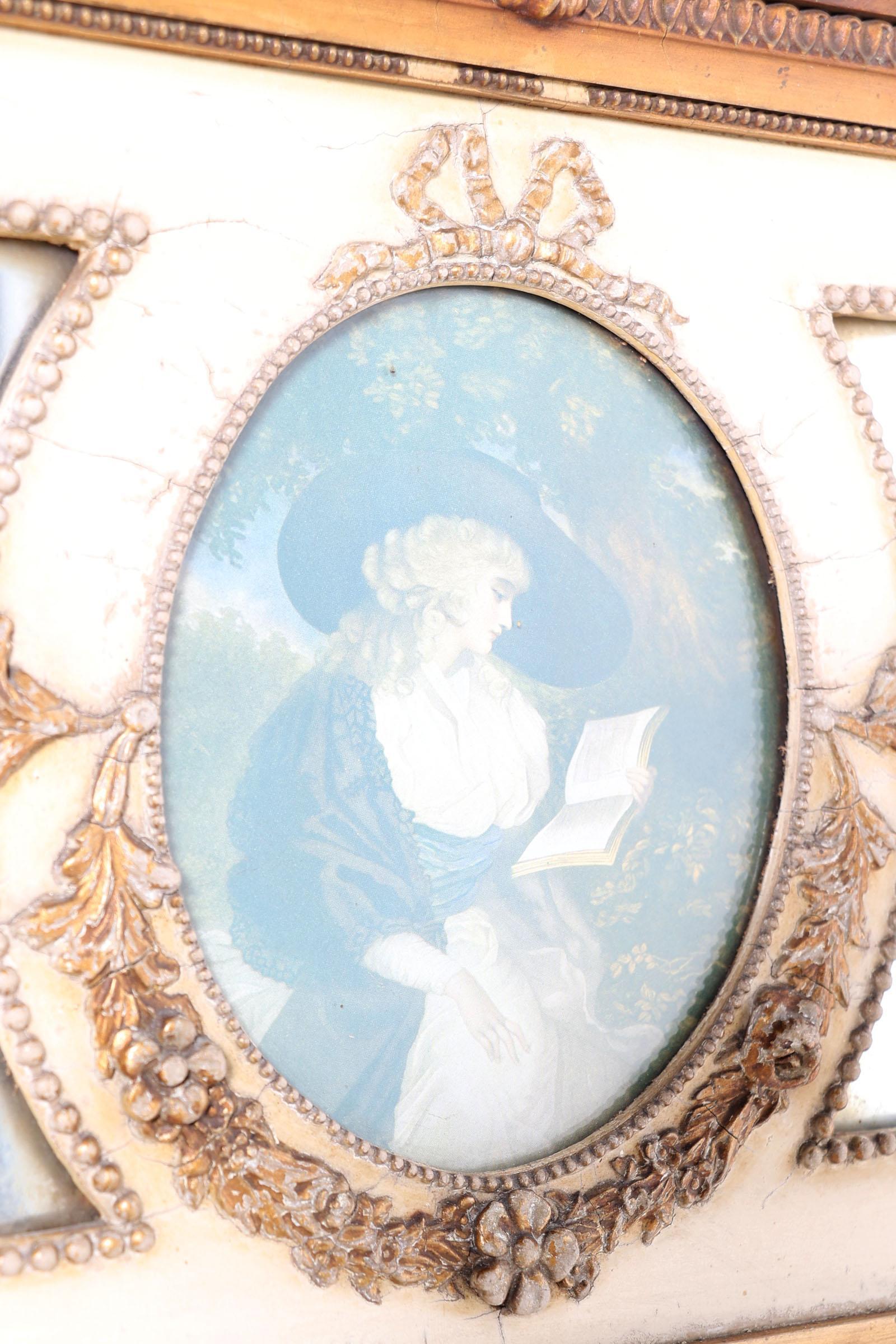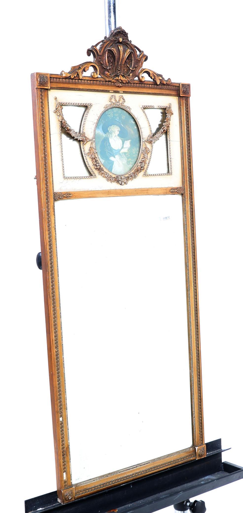 Geslepen spiegel in goudkleurige lijst met afbeelding van een dame met boek, 103 x 41 cm.