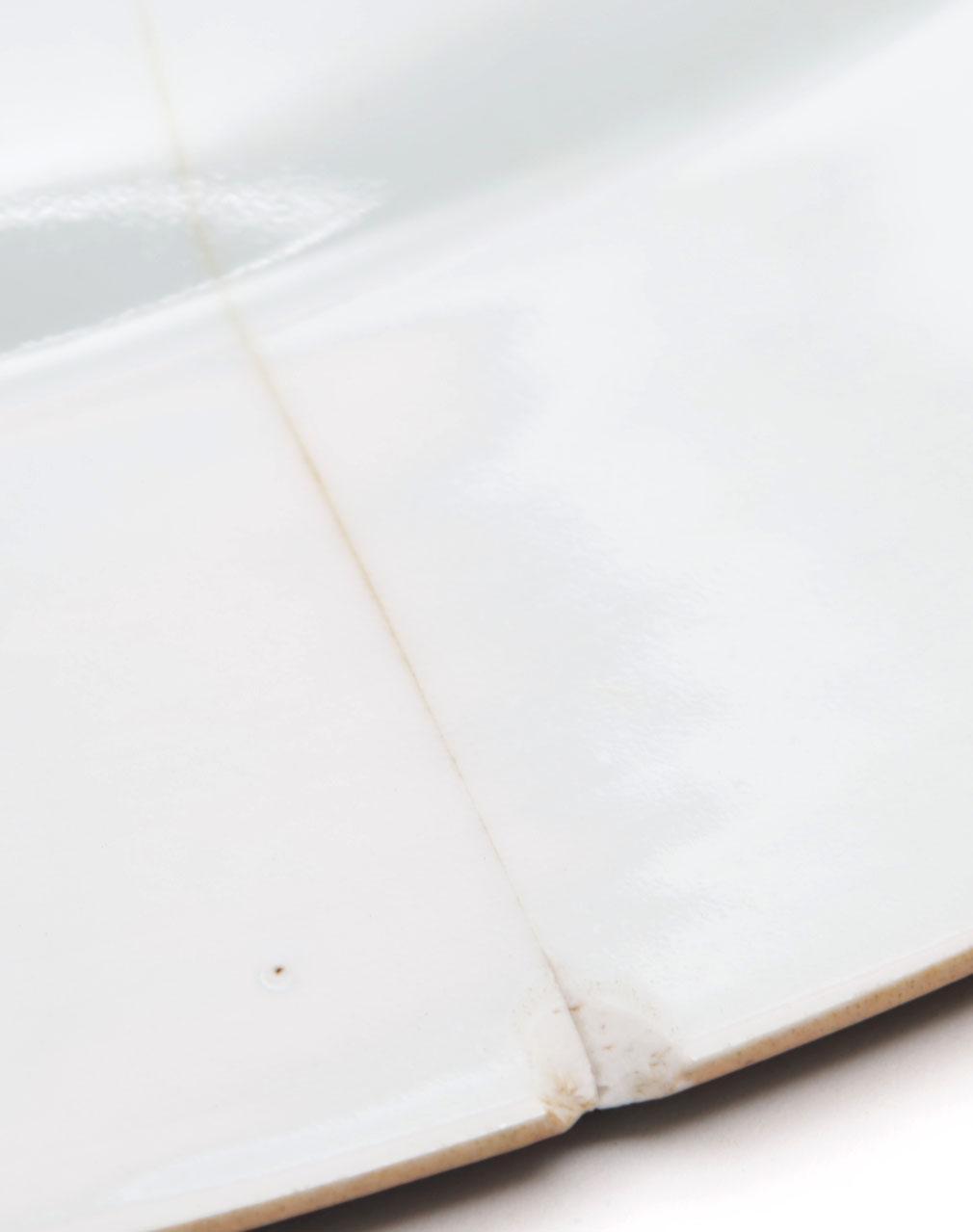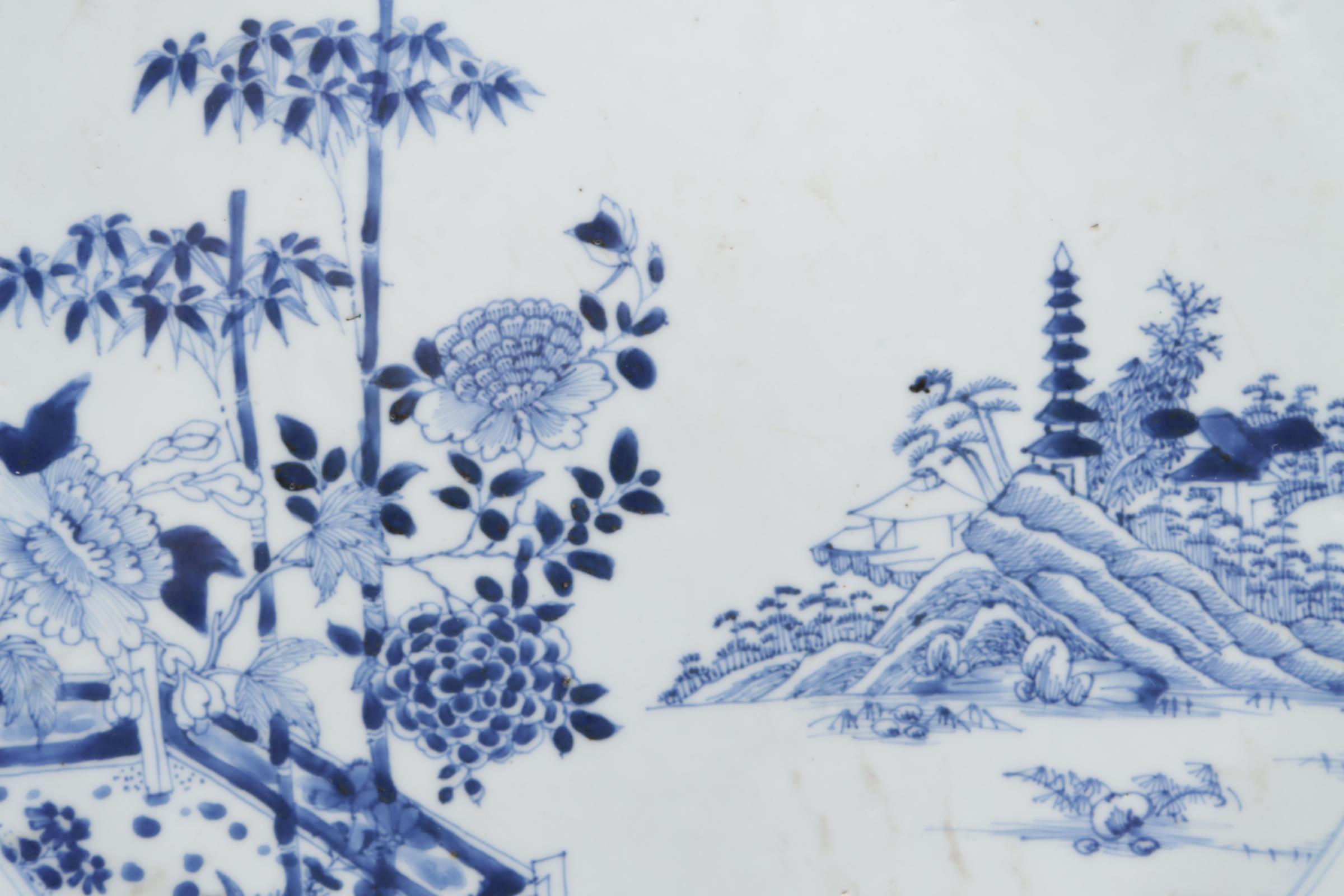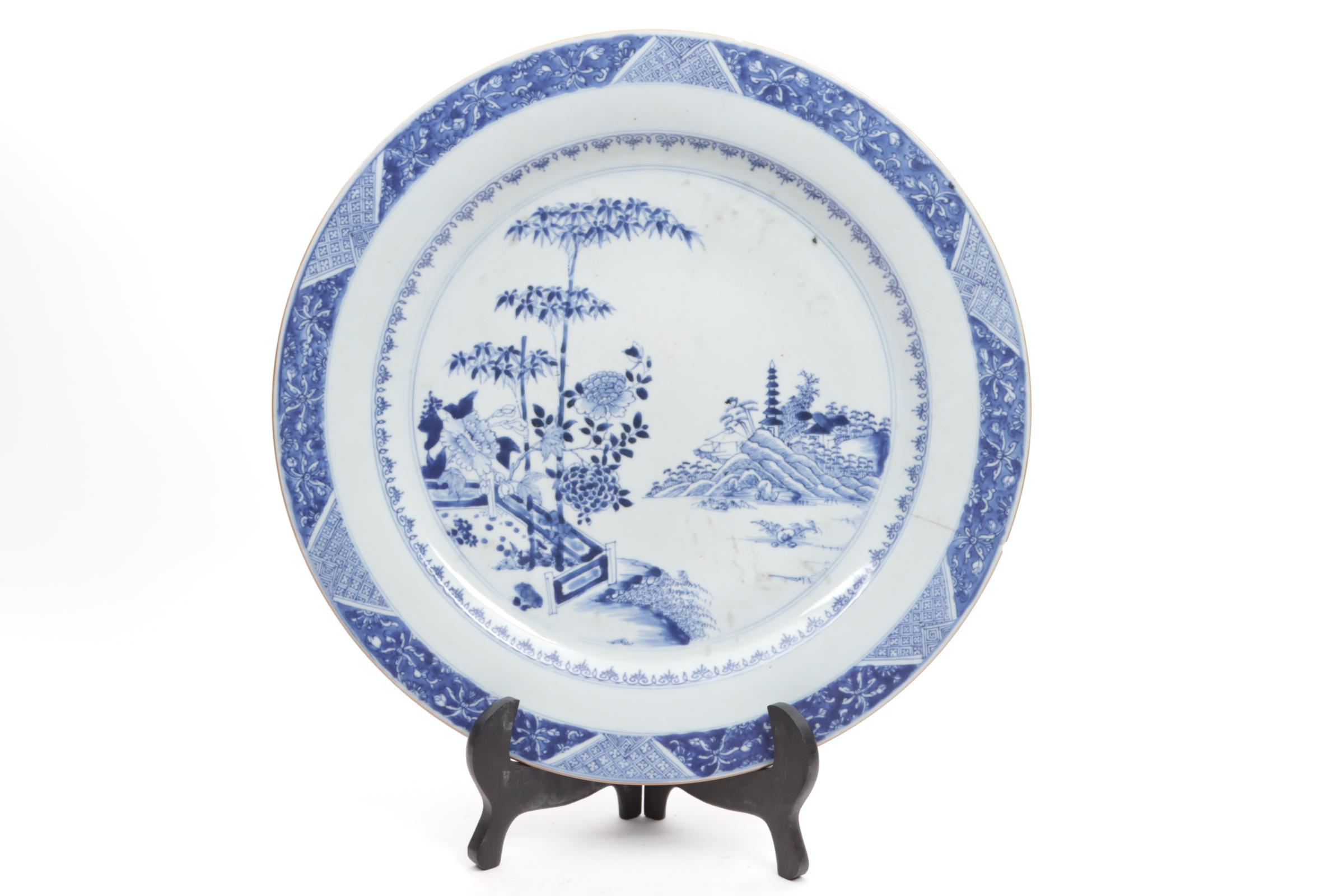 Antieke blauw/wit met bloemen en landschap gedecoreerde Chinees porseleinen schotel (haarscheur), diam.37,5 cm.