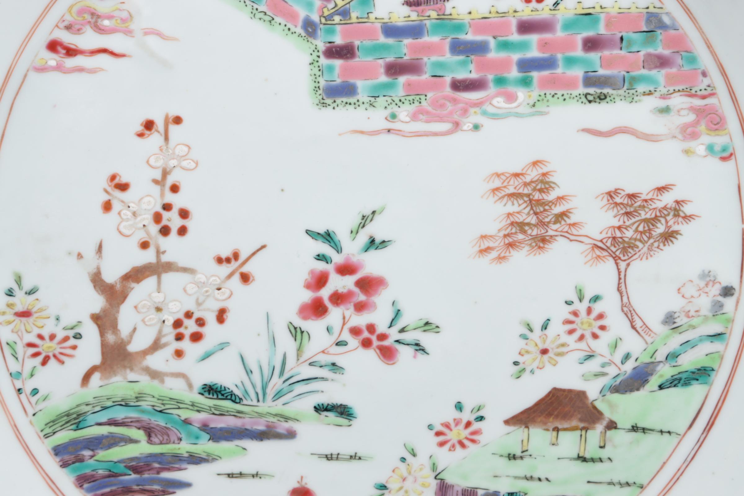 2 Antieke met paviljoen en ommuurde tuin gedecoreerde Chinees porseleinen famille rose schotels, Yongzheng periode, 1723-1735, diam.35 cm.