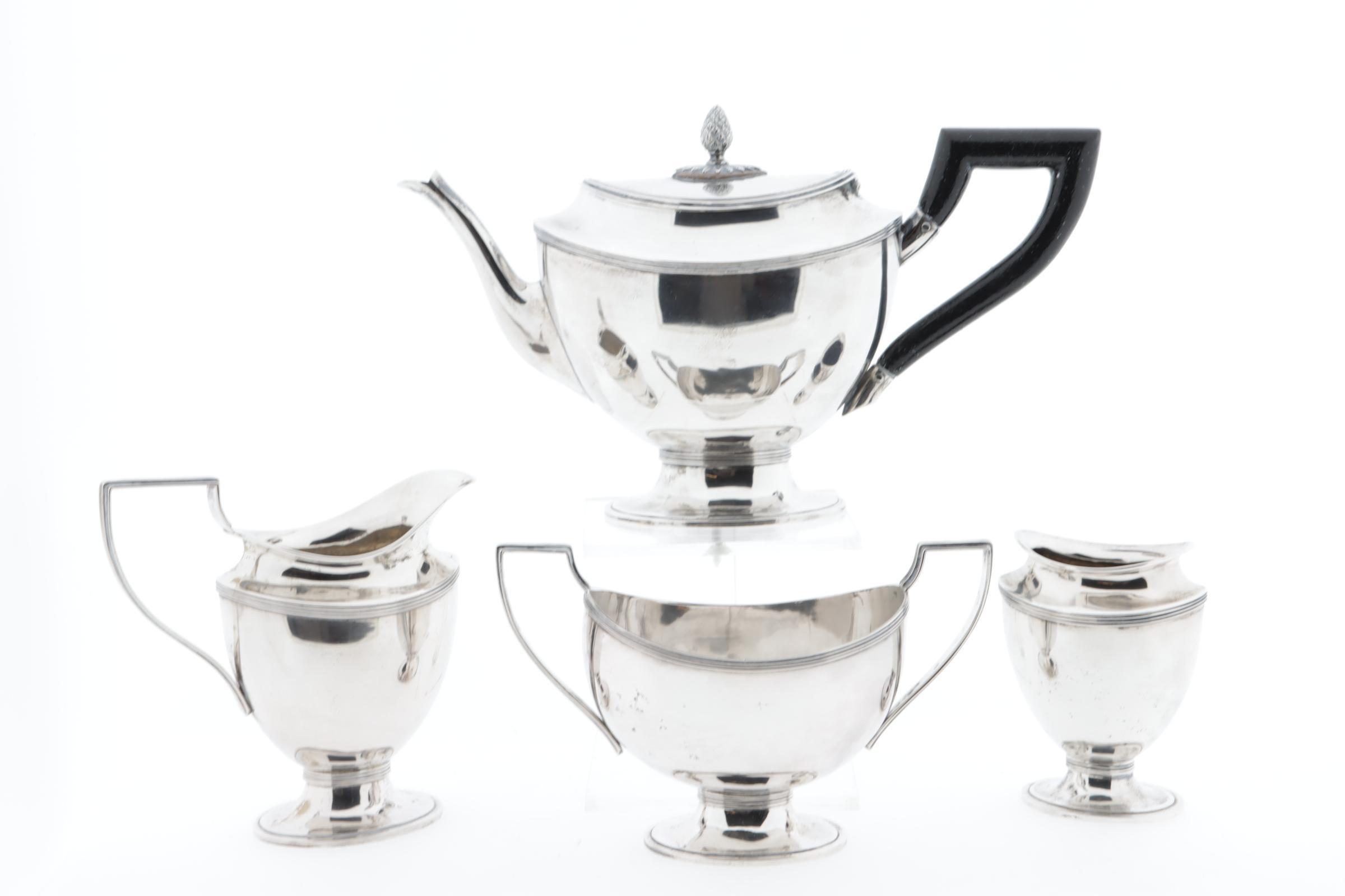 2e Gehalte zilveren 4-delig theeservies bestaand uit theepot, melkpot, suikerpot en lepelvaas, jaarletter V=1930, kantoorstempel Den Haag,