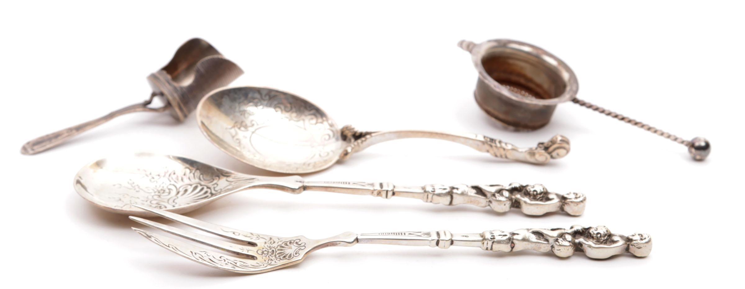 Koop van 2e gehalte zilveren couverts, roomlepel, theezeefje en suikerschepje, totaal 135 gram