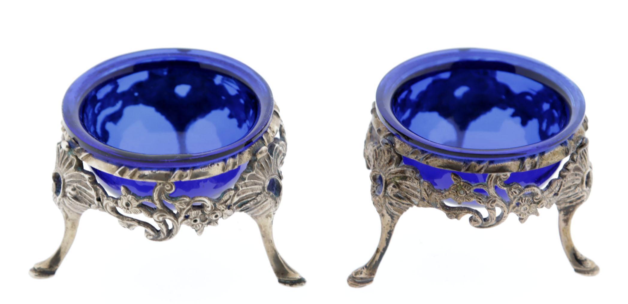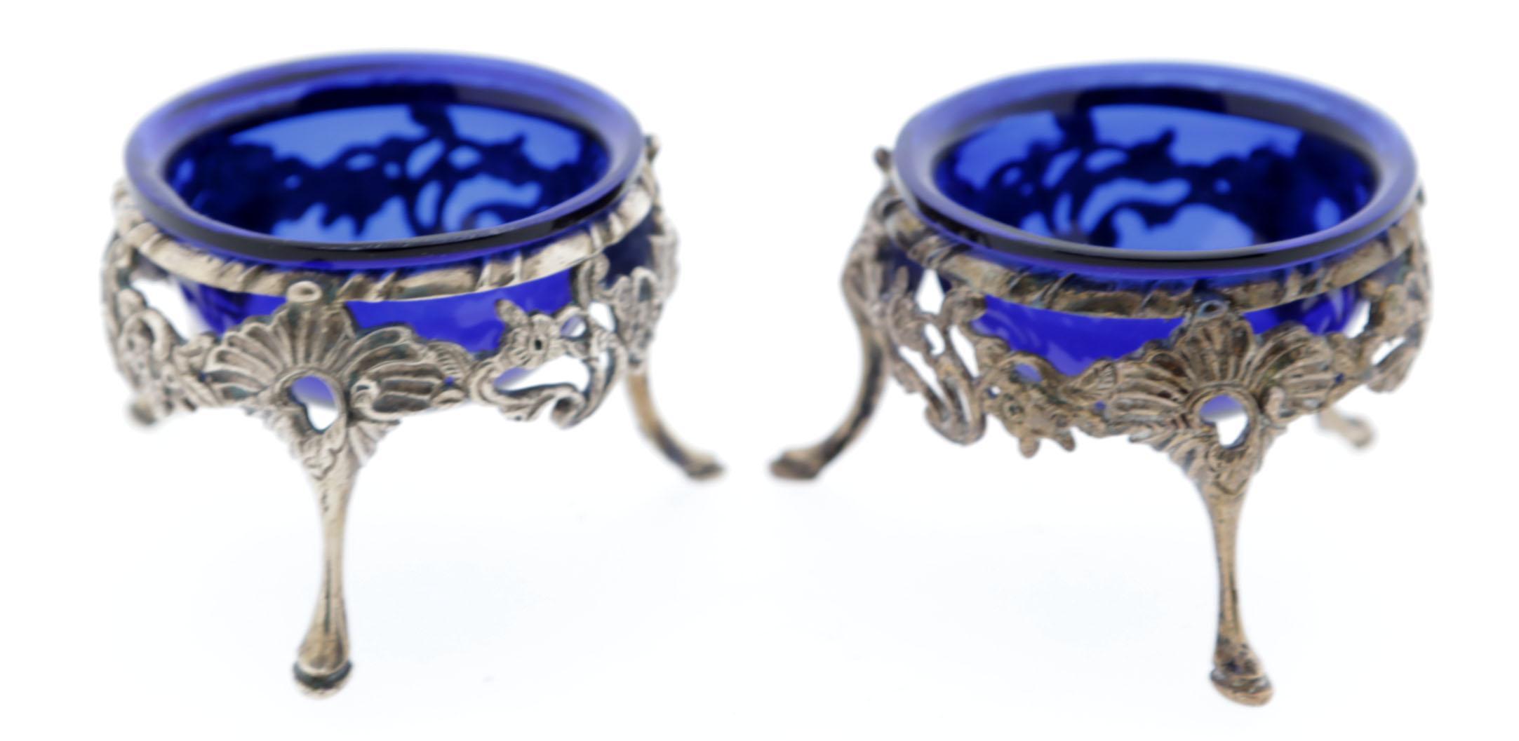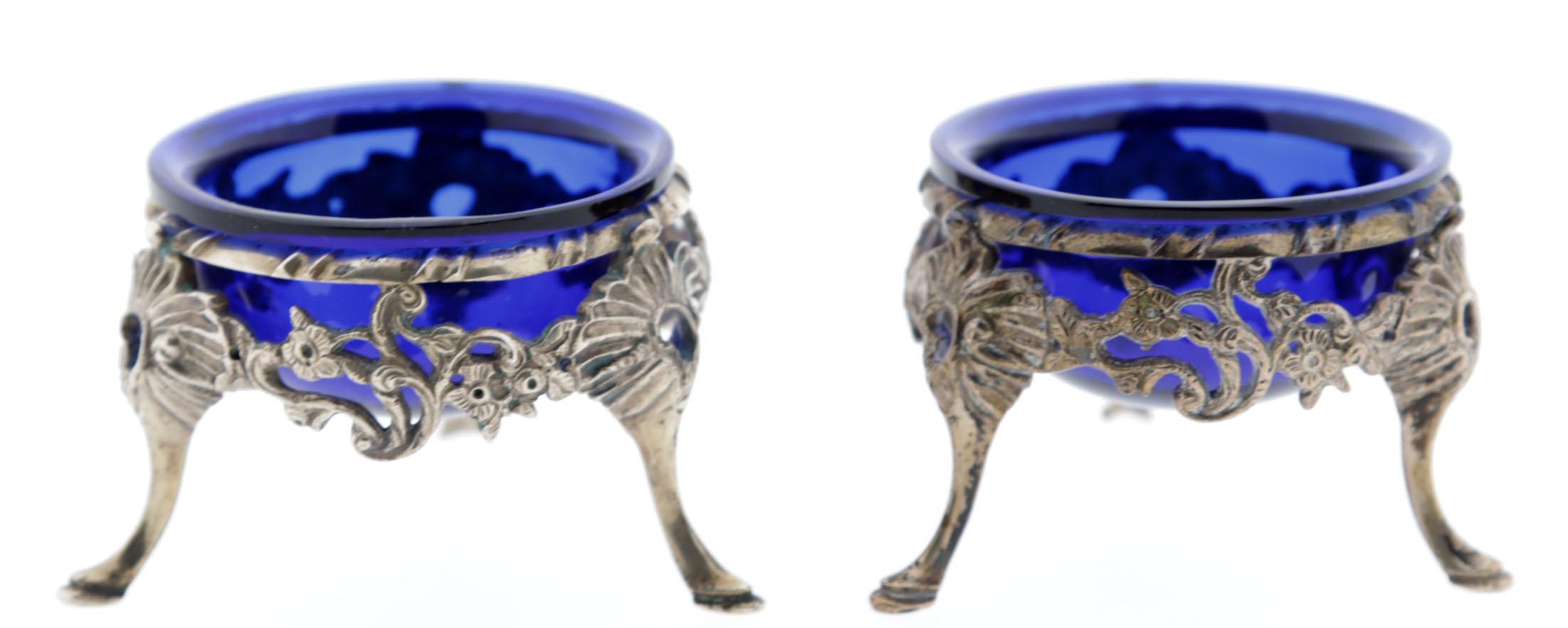 Opengewerkt 2e gehalte zilveren zout/peperstel met blauwe binnenbakjes, zilvergewicht 96 gram