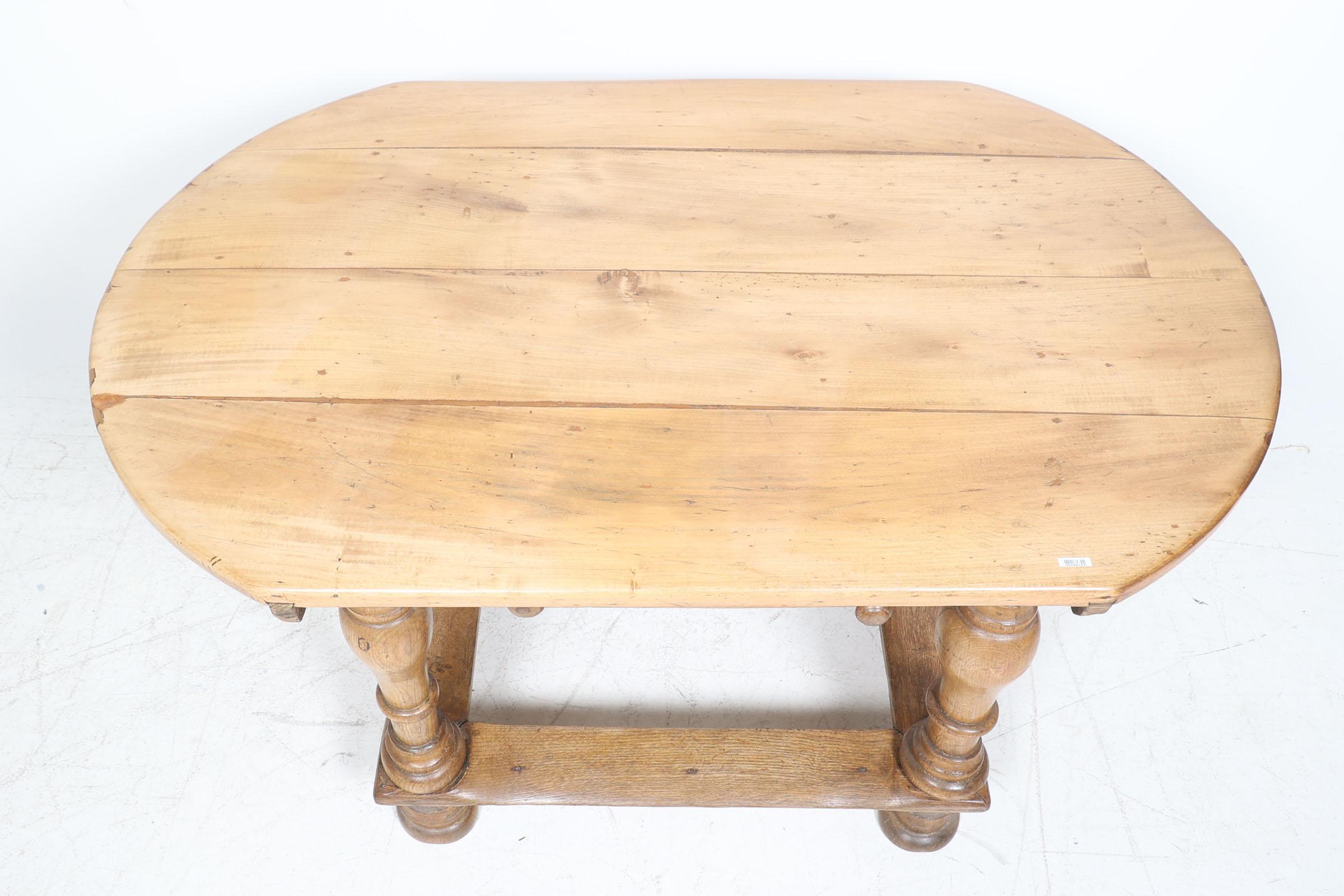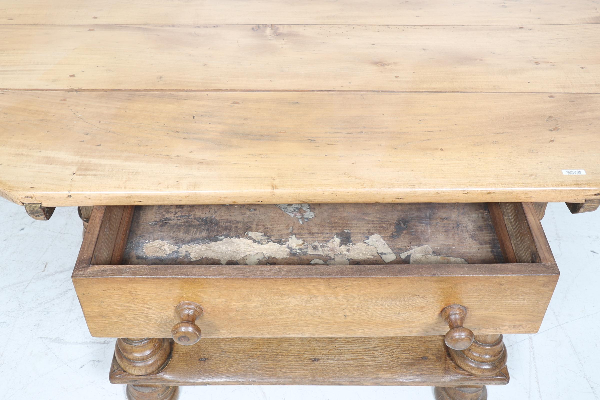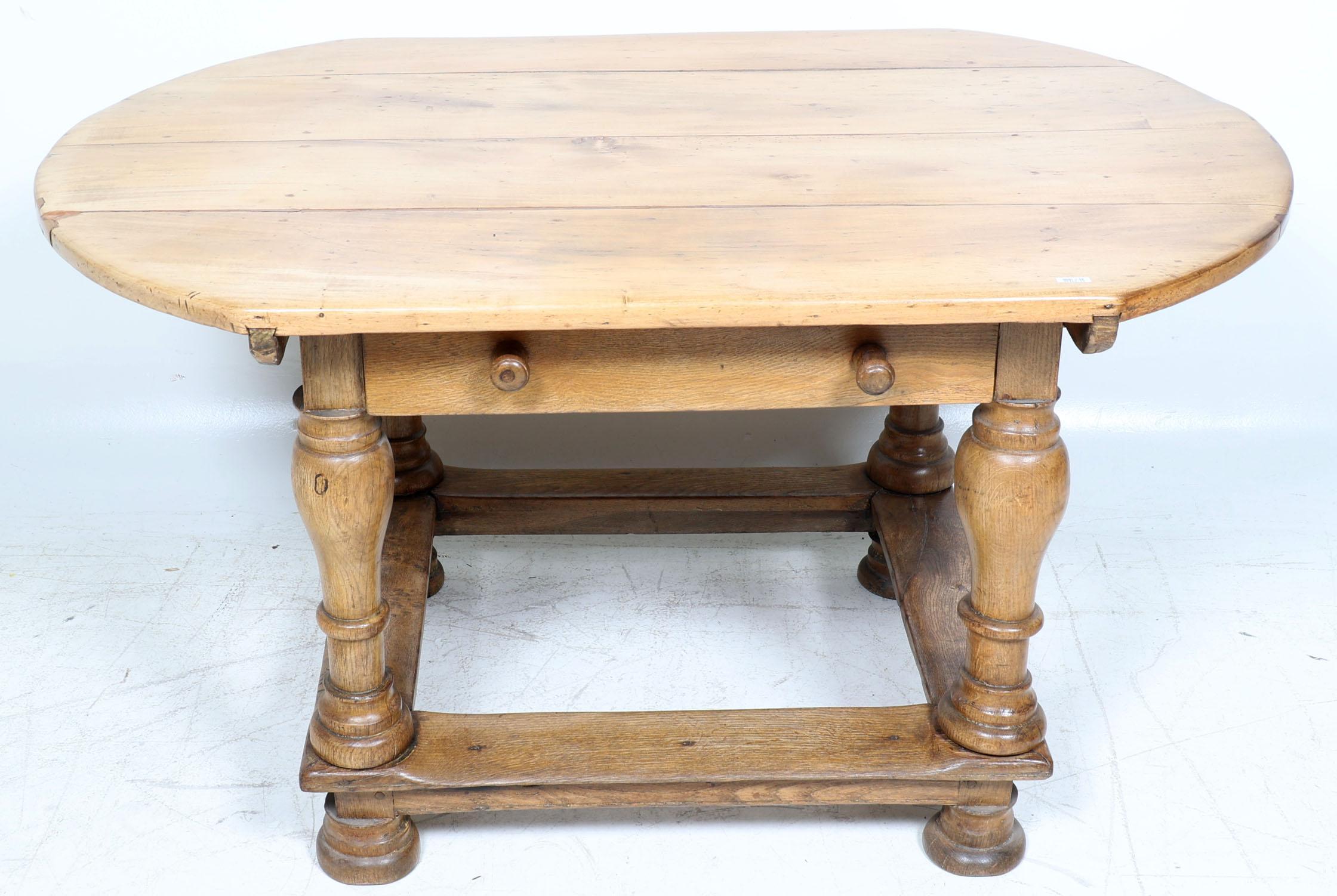 Eikenhouten tafel met lade, rustend op bolpoten, h.75 x b.136 x d.87 cm.
